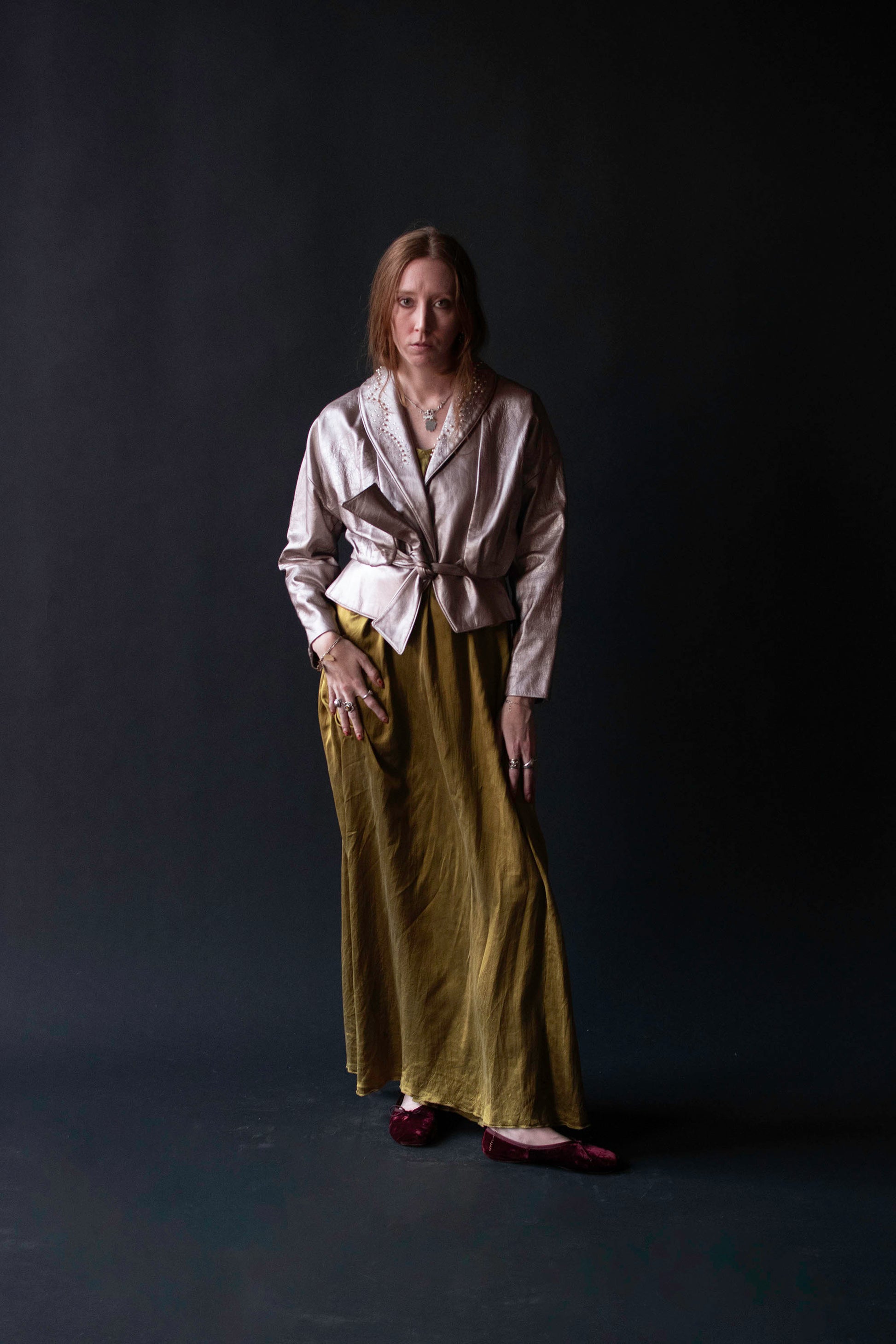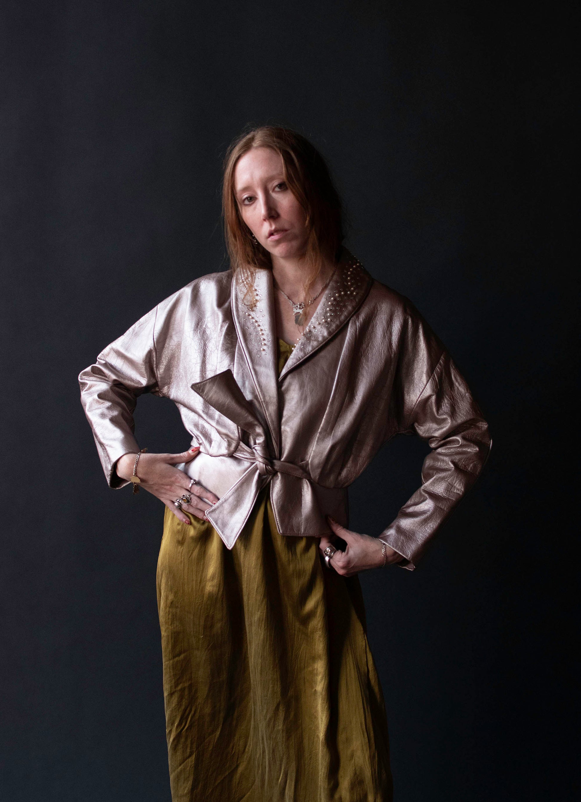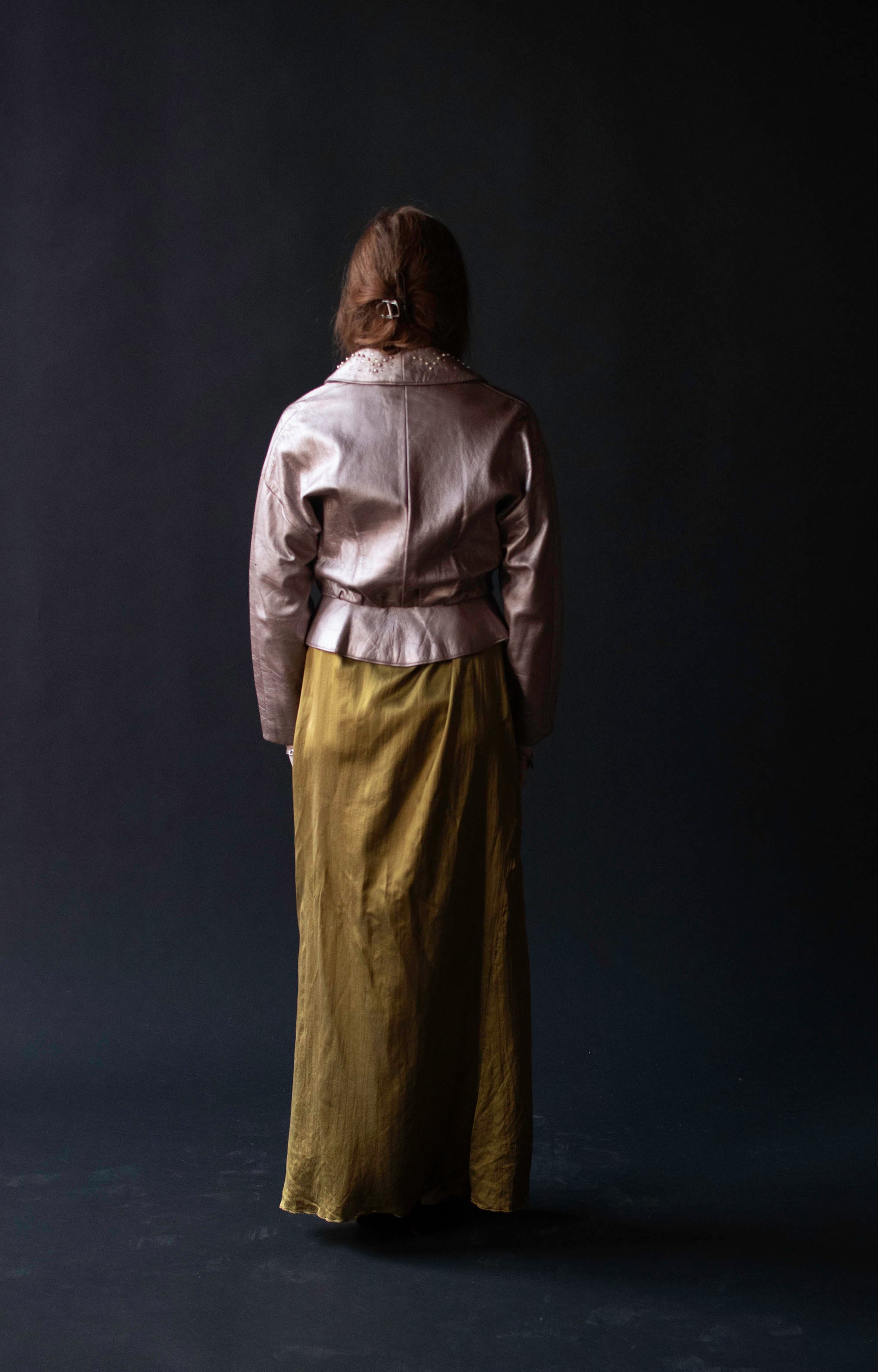 1980s metallic pale pink faux leather jacket with prong set rhinestone and faux pearl accents. Drop shoulders. Attached ties at front. Fully lined.