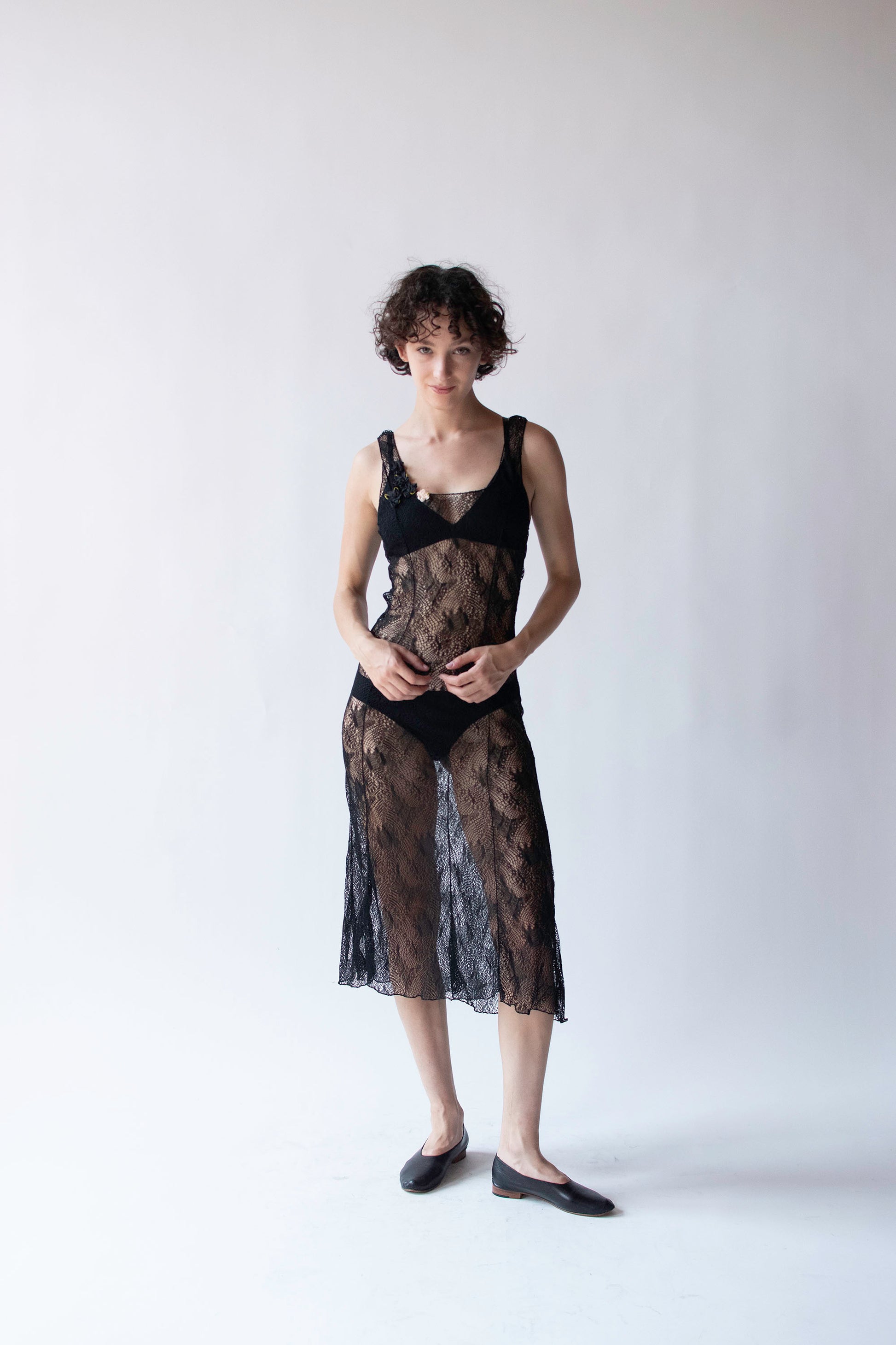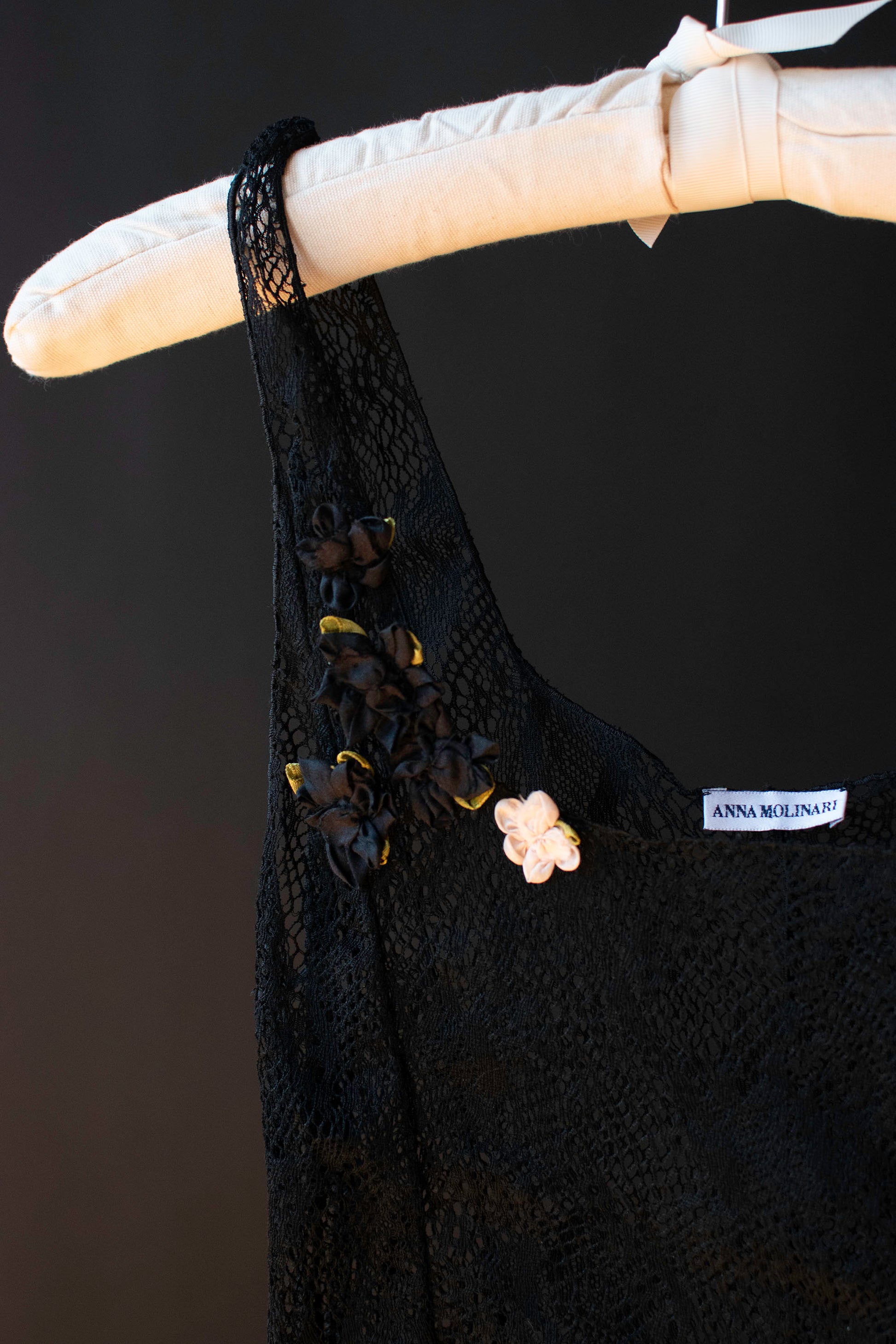 Black mesh lace dress with silk flowers along the colar by Anna Molinari. Pullover style. Fabric content is unlabeled, feels like a spandex nylon blend.