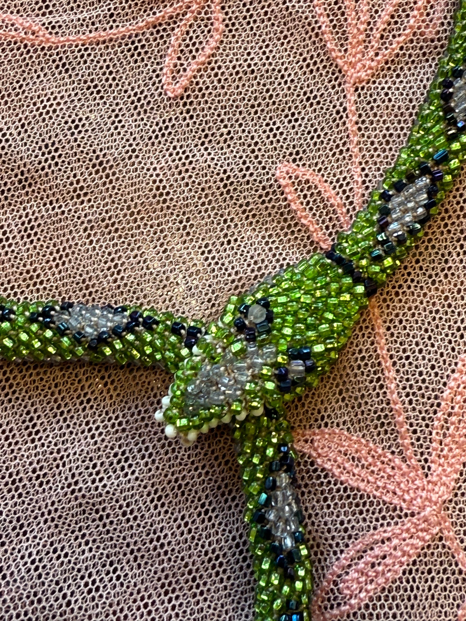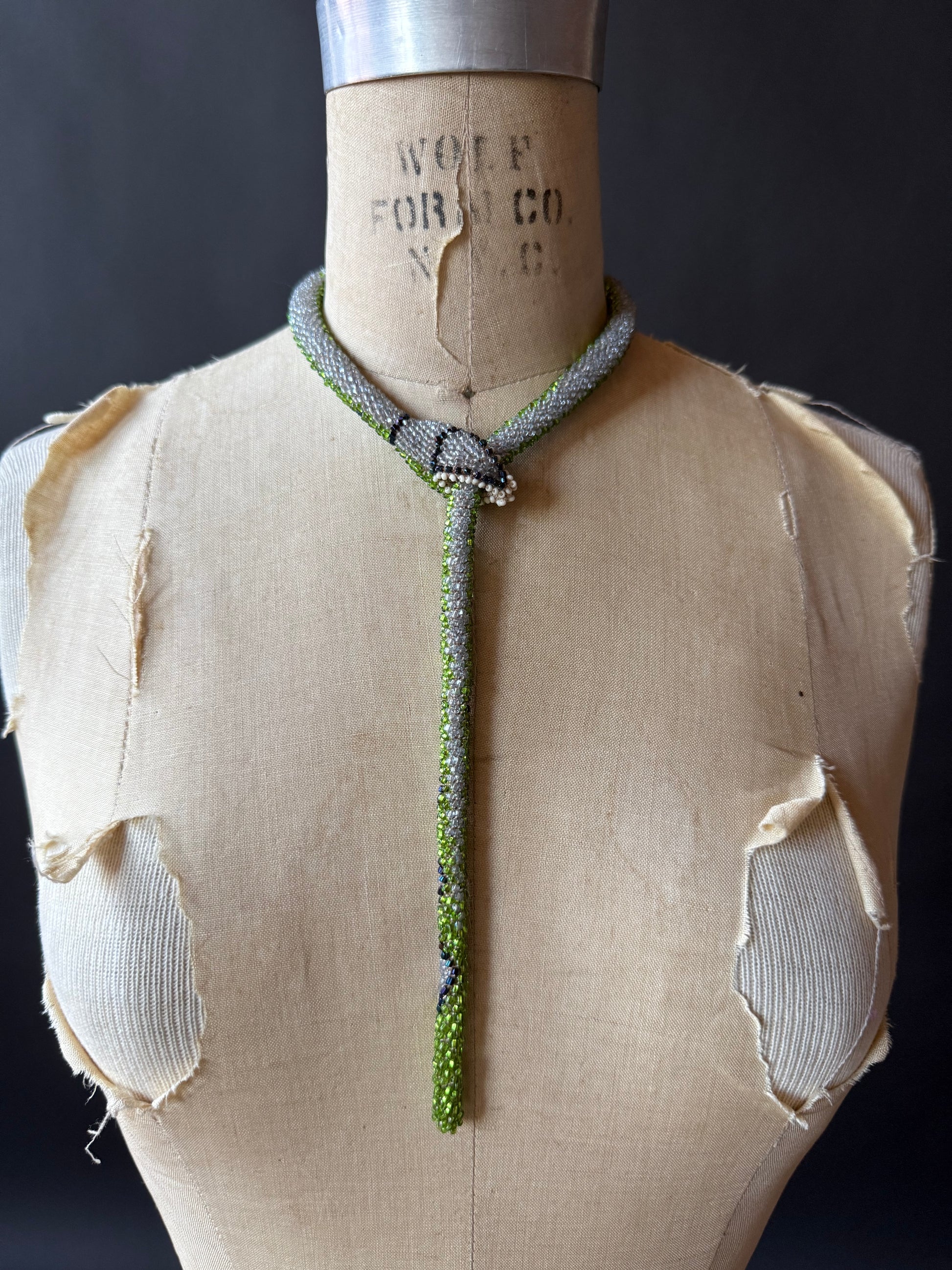 Absinthe green bead crochet snake necklace in the diamond pattern with oil slick and pale blue accents and a cream belly. Fashioned from antique and vintage glass seed beads, some deadstock and some salvaged from 1920s beaded purses. Tail pulls through the mouth, adjust to fit.
