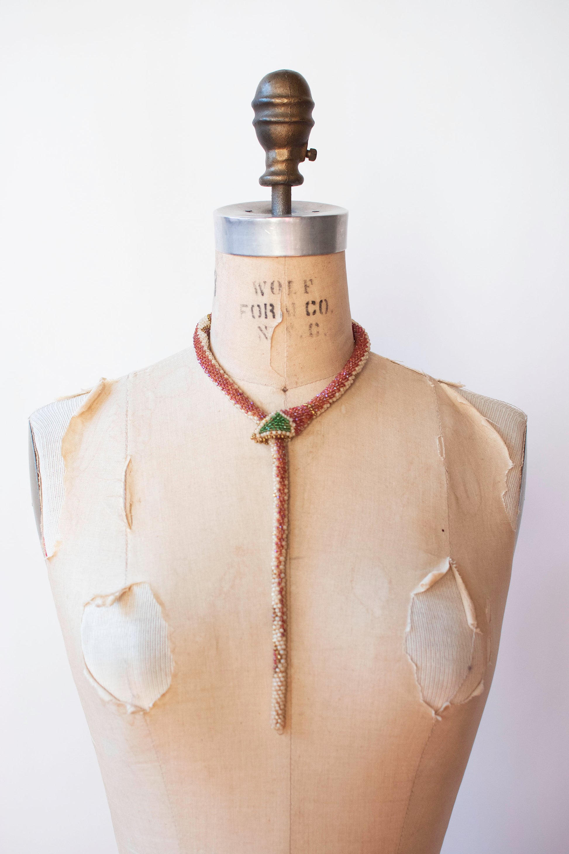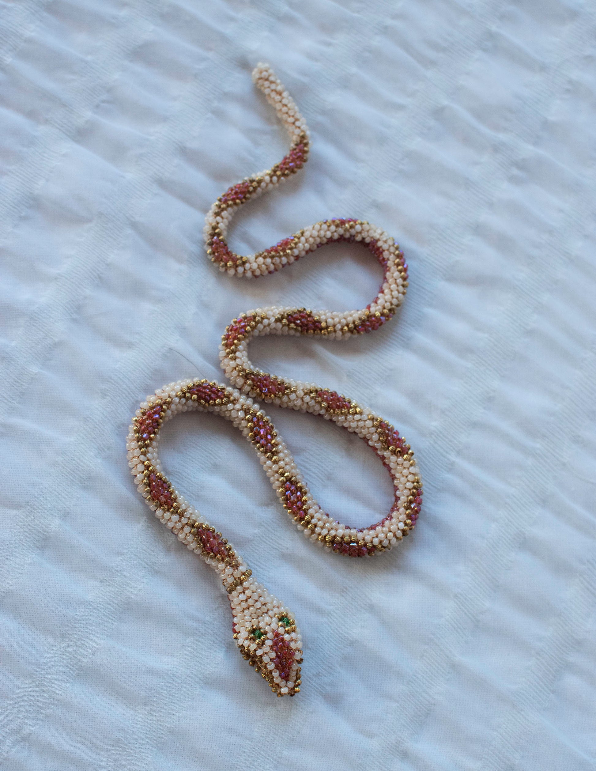 Antique faux pearl bead crochet snake necklace in the diamond pattern with iridescent rose and gold tone accents. Fashioned from antique glass and metal seed beads, some deadstock and some salvaged from 1920s beaded purses. Tail pulls through the mouth, adjust to fit.