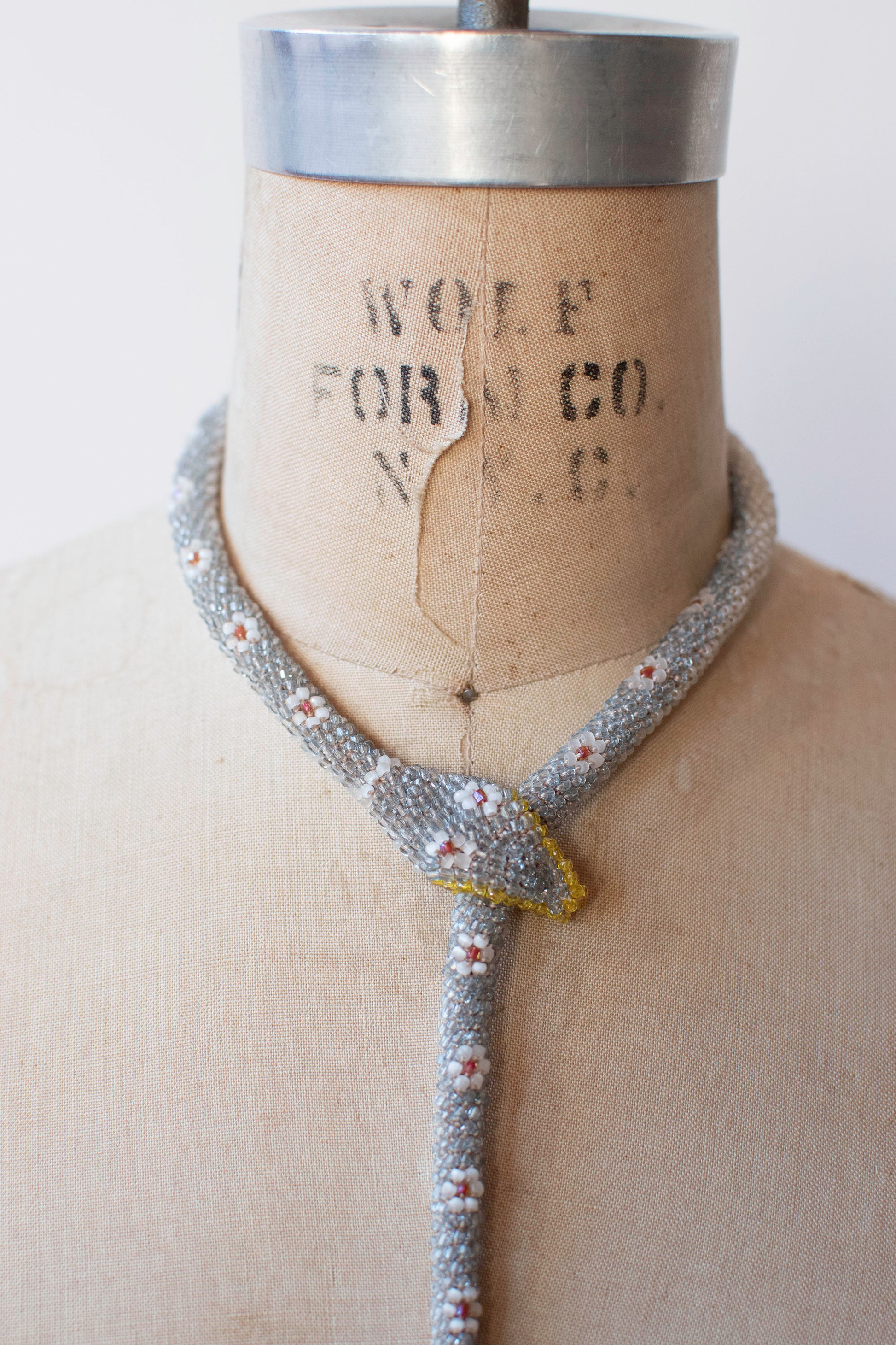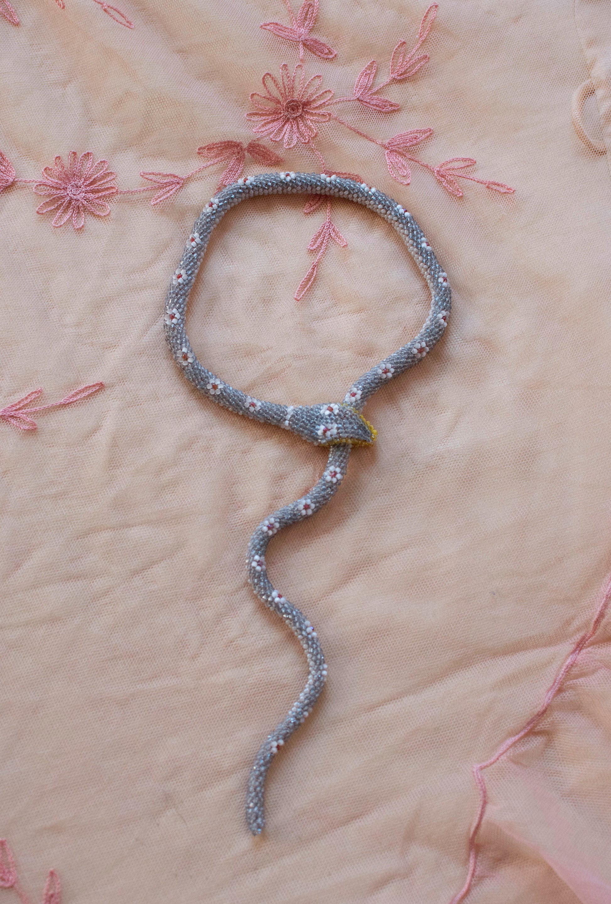 Icey pale blue bead crochet snake necklace in the flower pattern with pearl and iridescent rose accents and yellow teeth. Fashioned from antique and vintage glass seed beads, some deadstock and some salvaged from 1920s beaded purses. Tail pulls through the mouth, adjust to fit.
