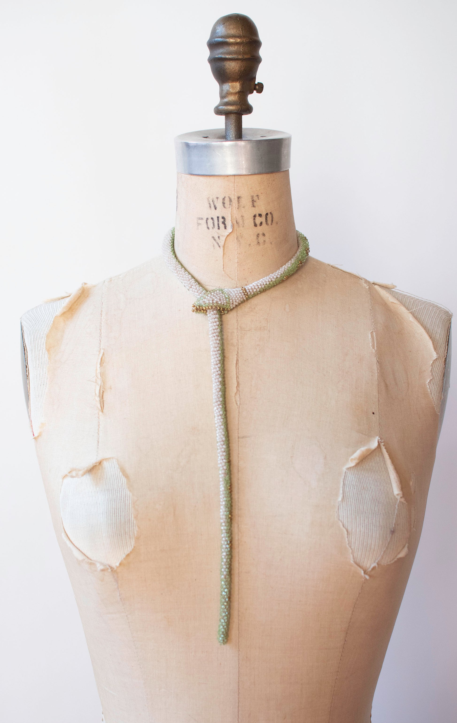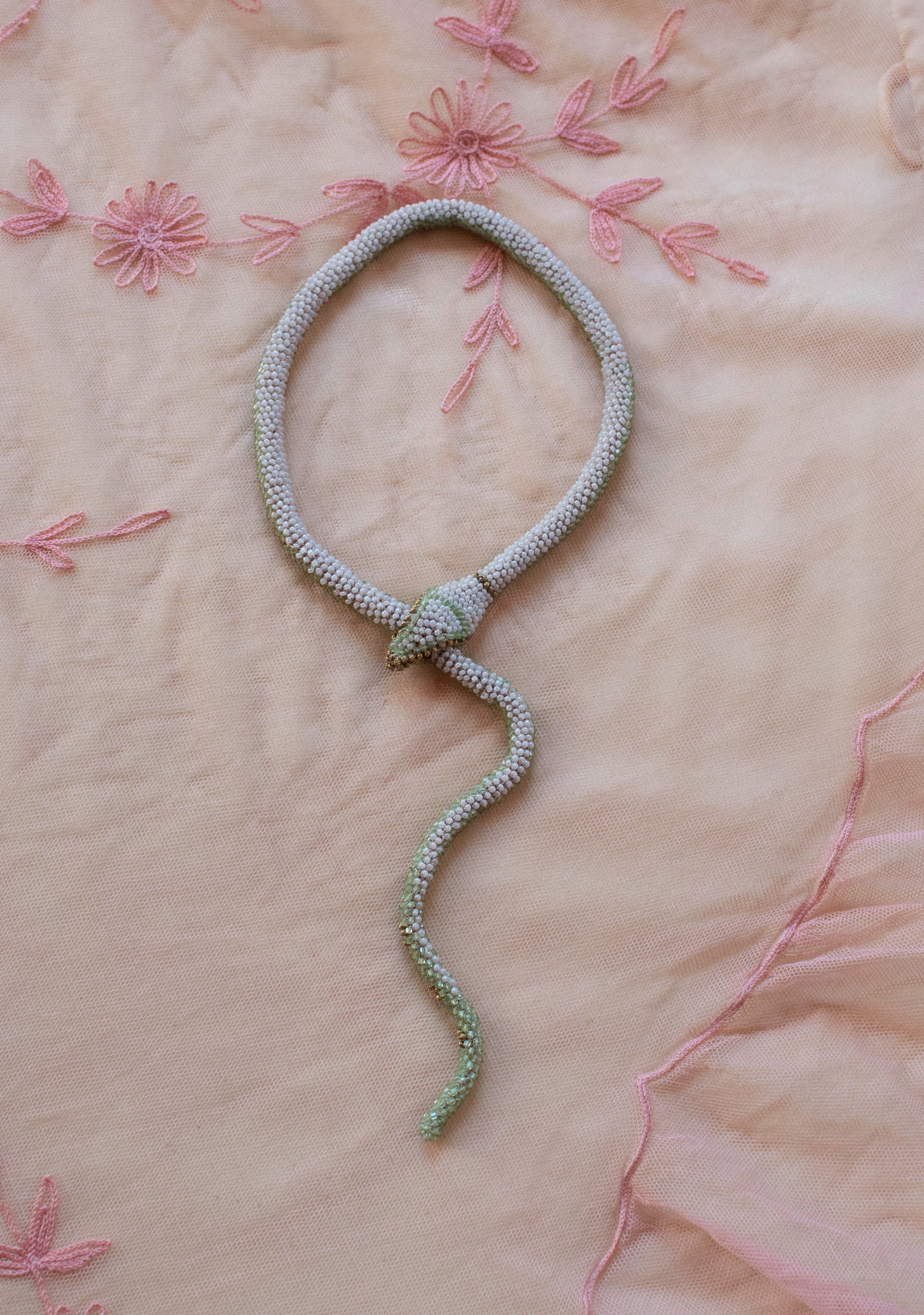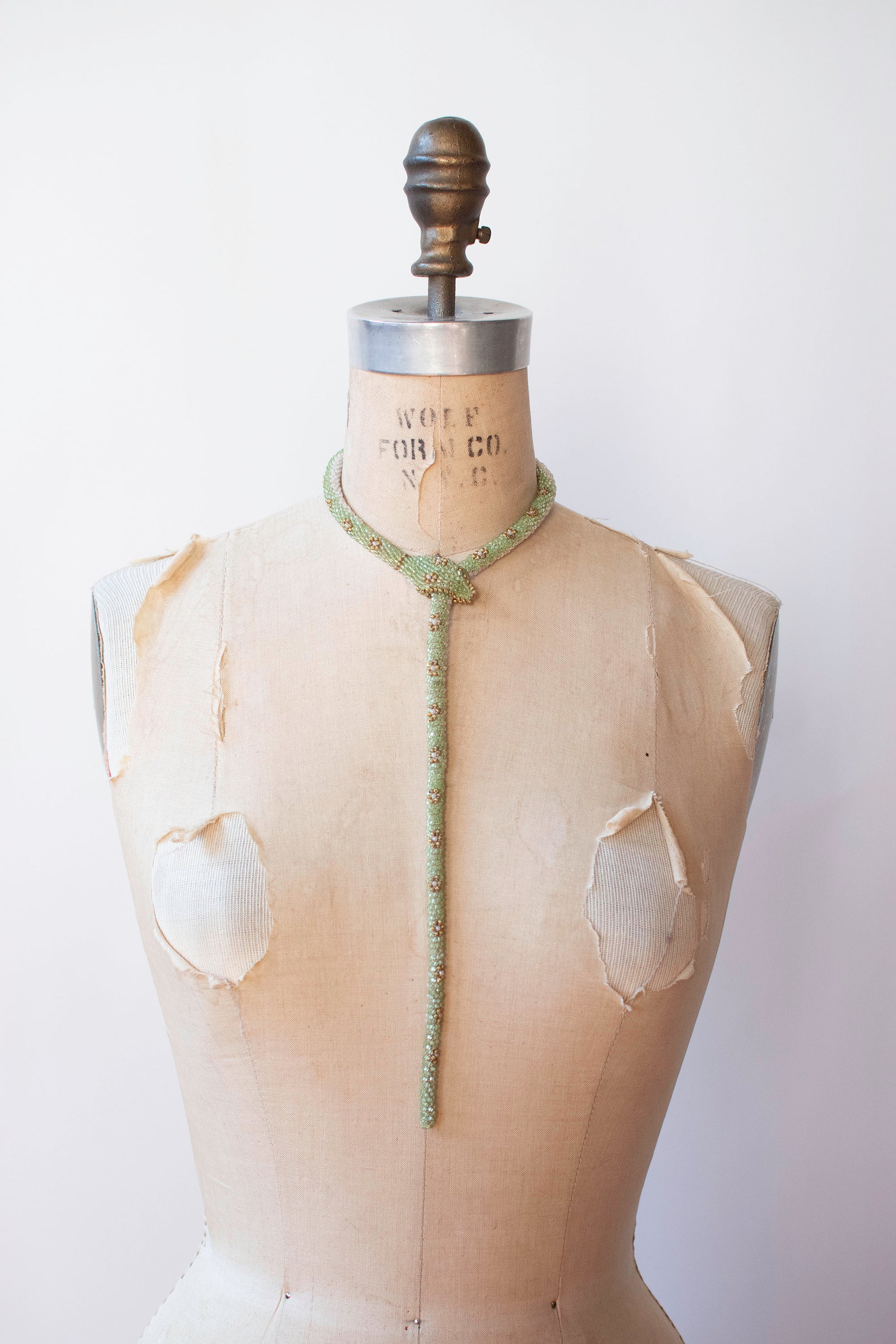 Pale green bead crochet snake necklace in the flower pattern with pearl and gold accents and a pearl belly. Fashioned from antique glass and metal seed beads, some deadstock and some salvaged from 1920s beaded purses. Tail pulls through the mouth, adjust to fit.