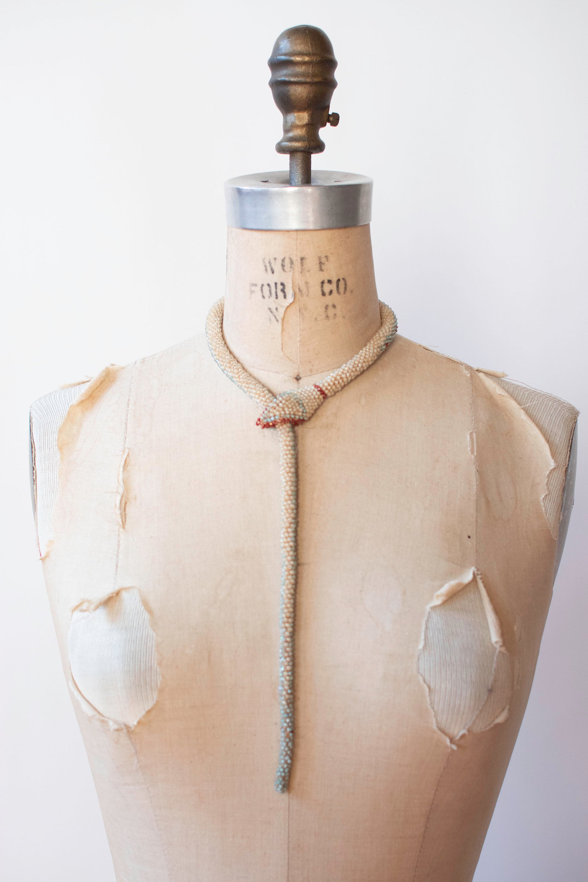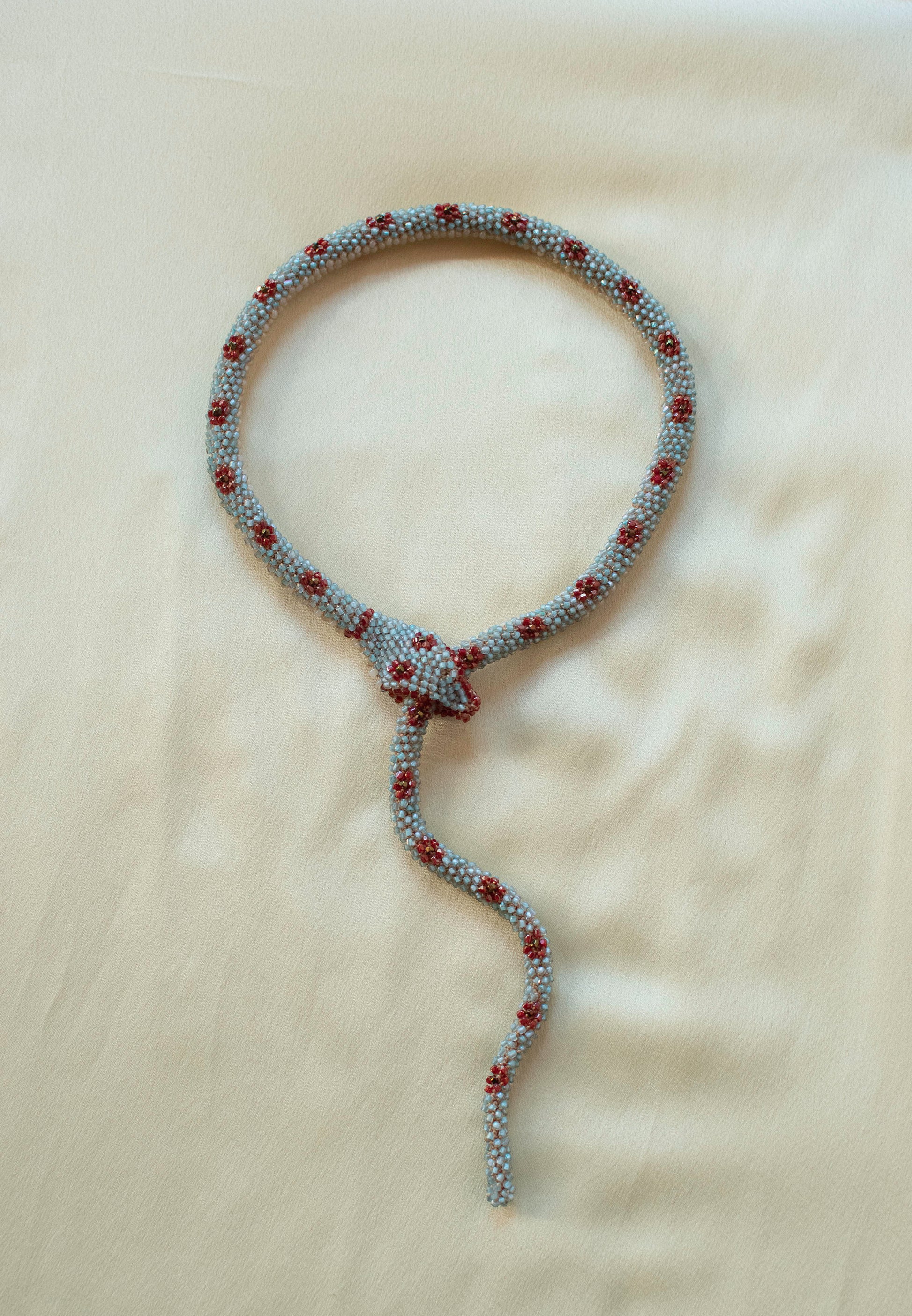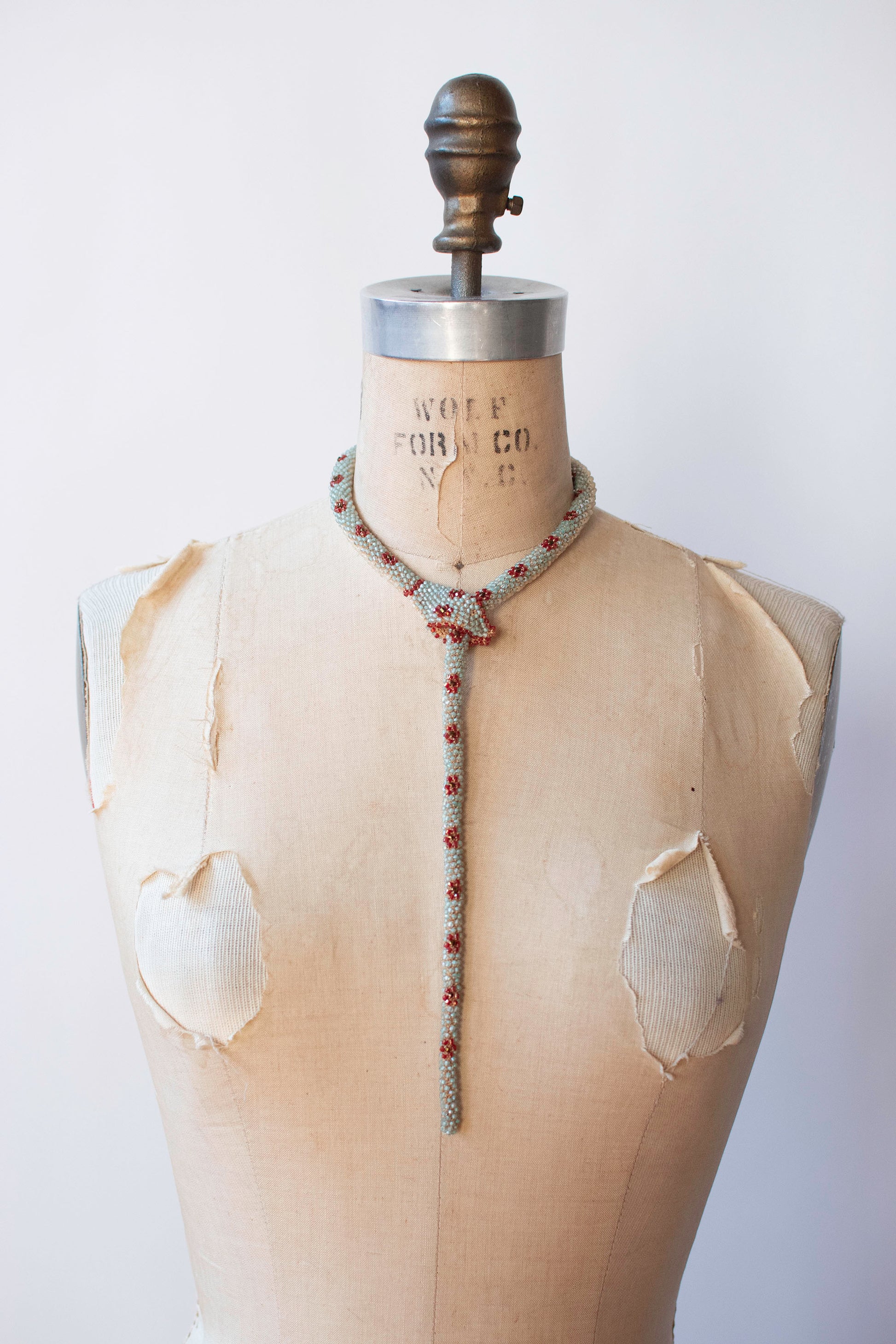 Seafoam bead crochet snake necklace in the flower pattern with red and brown accents and a pearl belly. Fashioned from antique glass seed beads, some deadstock and some salvaged from 1920s beaded purses. Tail pulls through the mouth, adjust to fit.