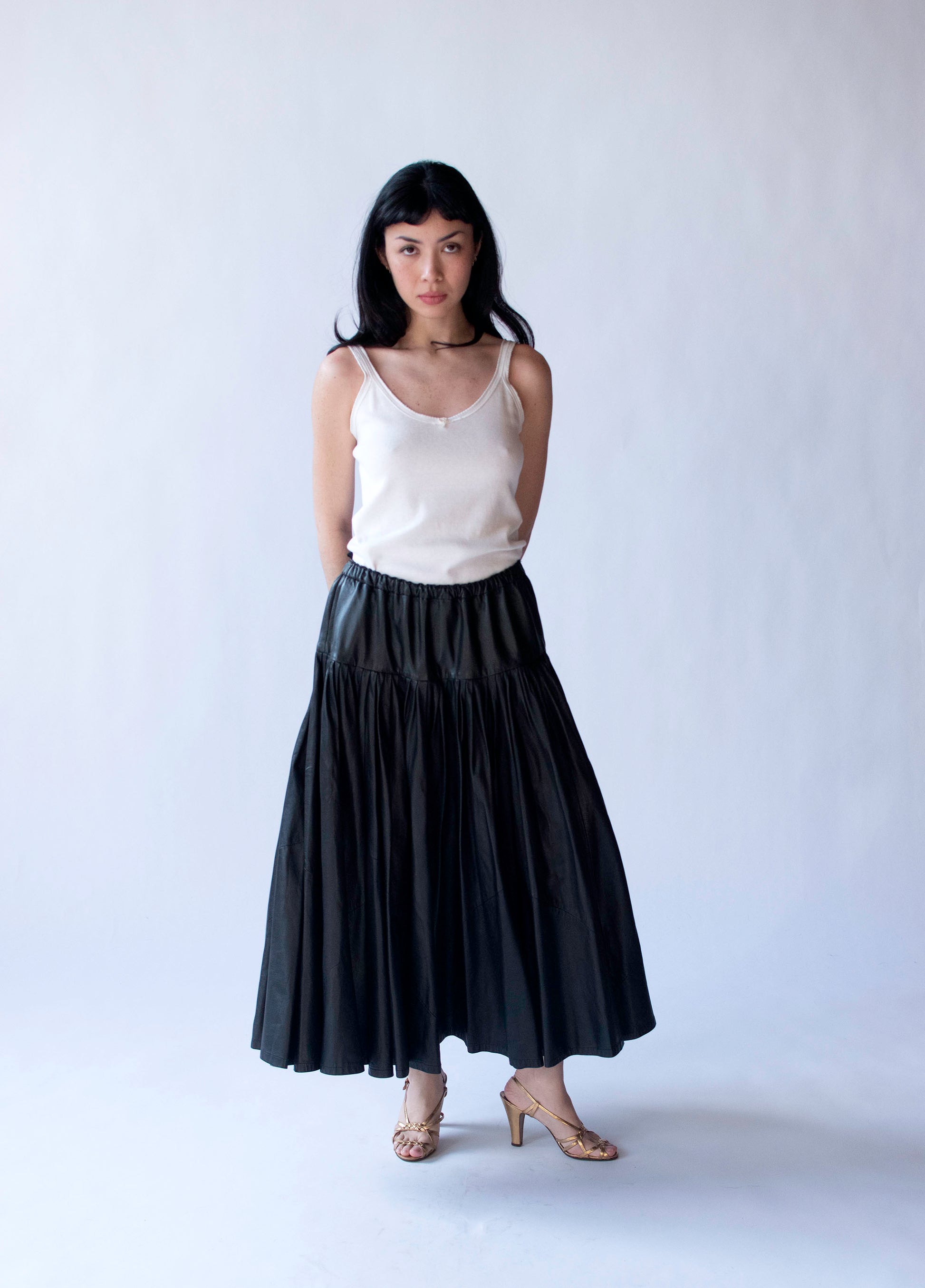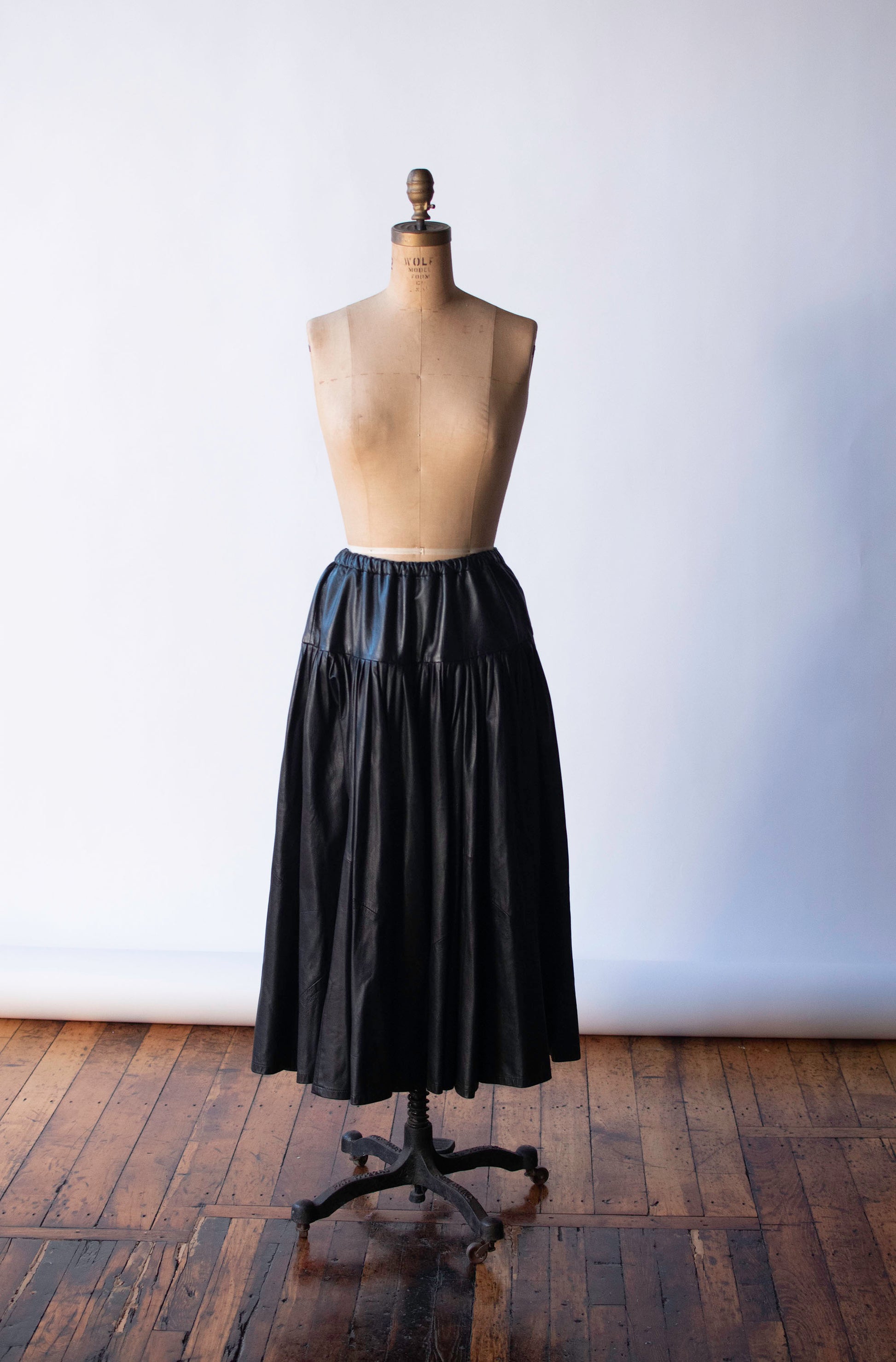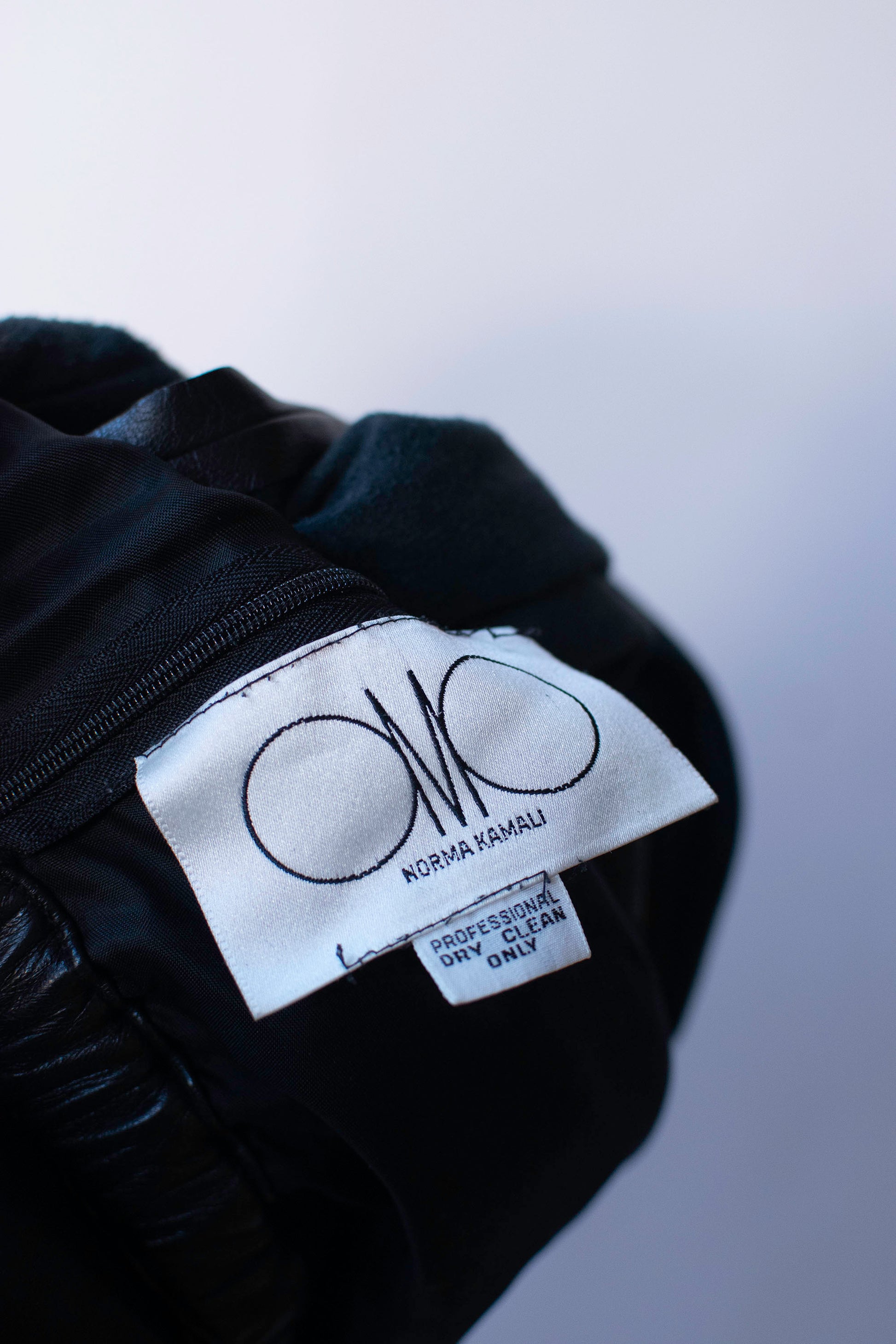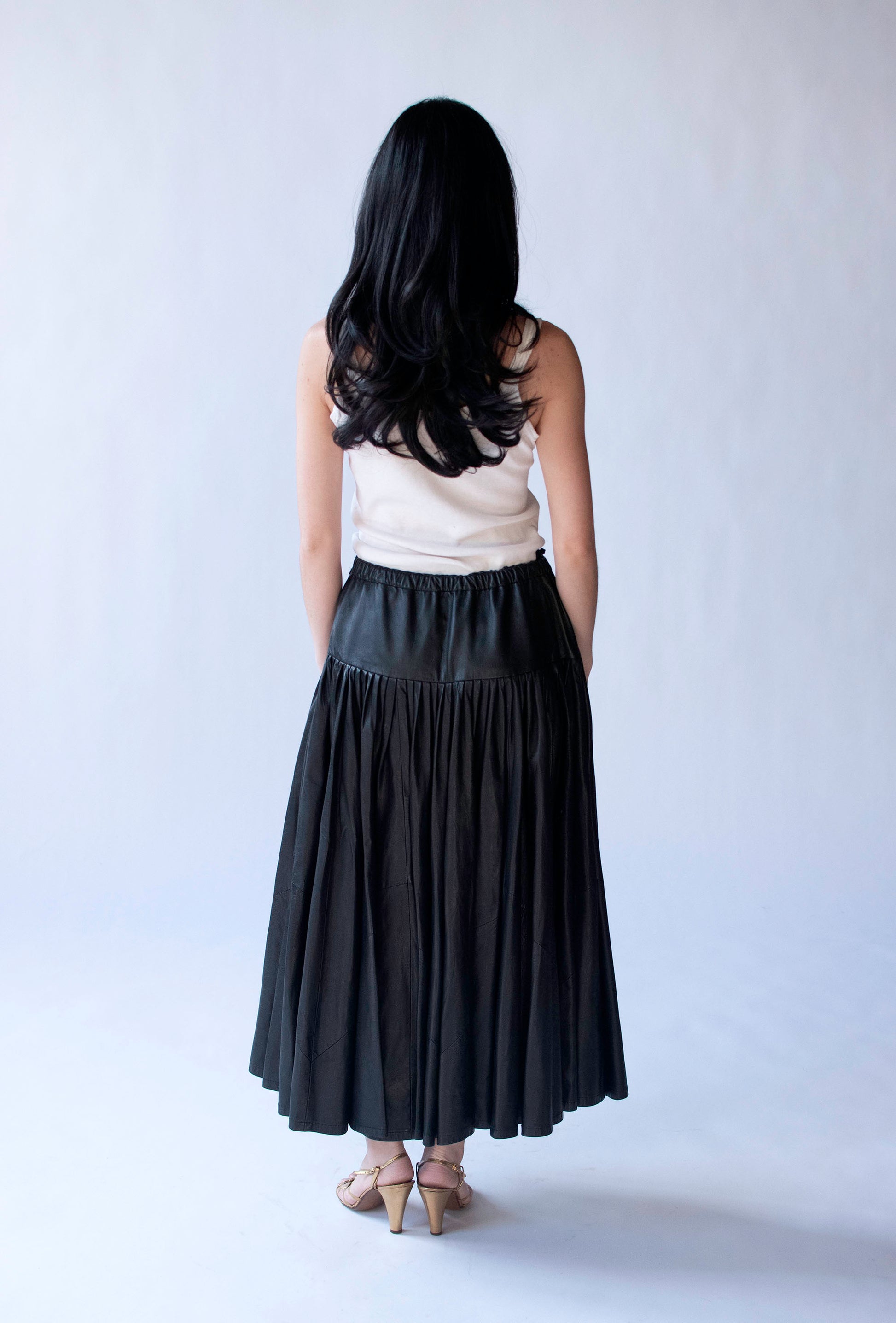 1980s - early 90s pleated black leather skirt by Omo Norma Kamali. Elastic waist and plastic side zipper.