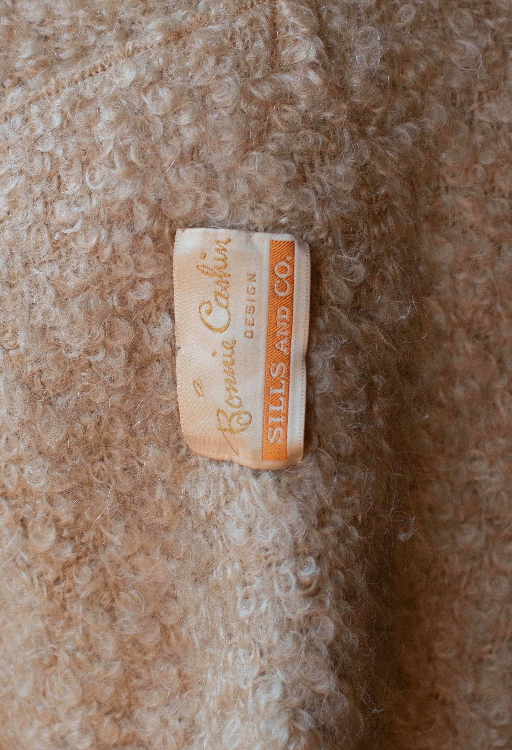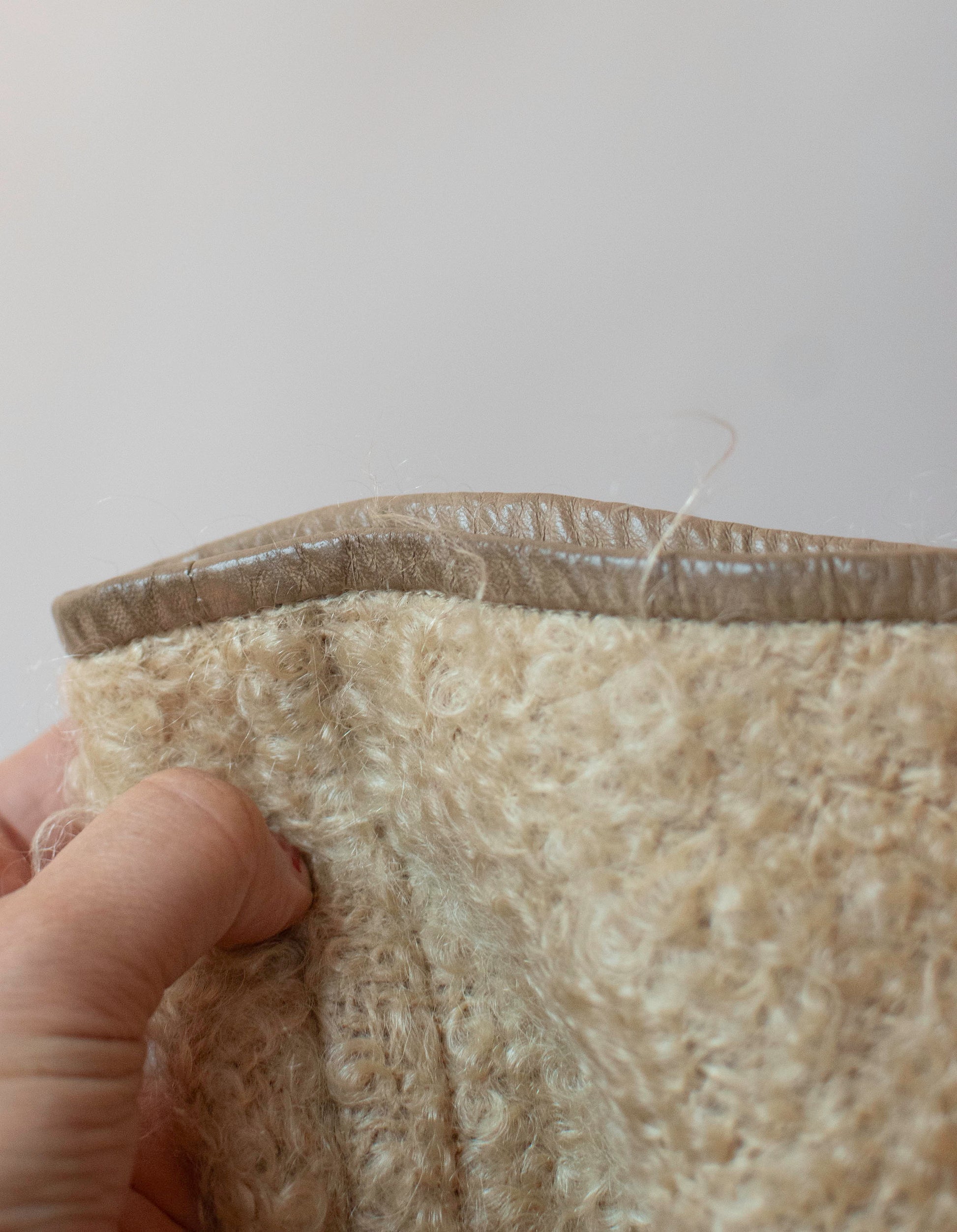 1960s cream curly wool coat with beige leather trim by Bonnie Cashin. Leather strap and buckle closures at collar and upper bodice. Large hip pockets. Unlined.