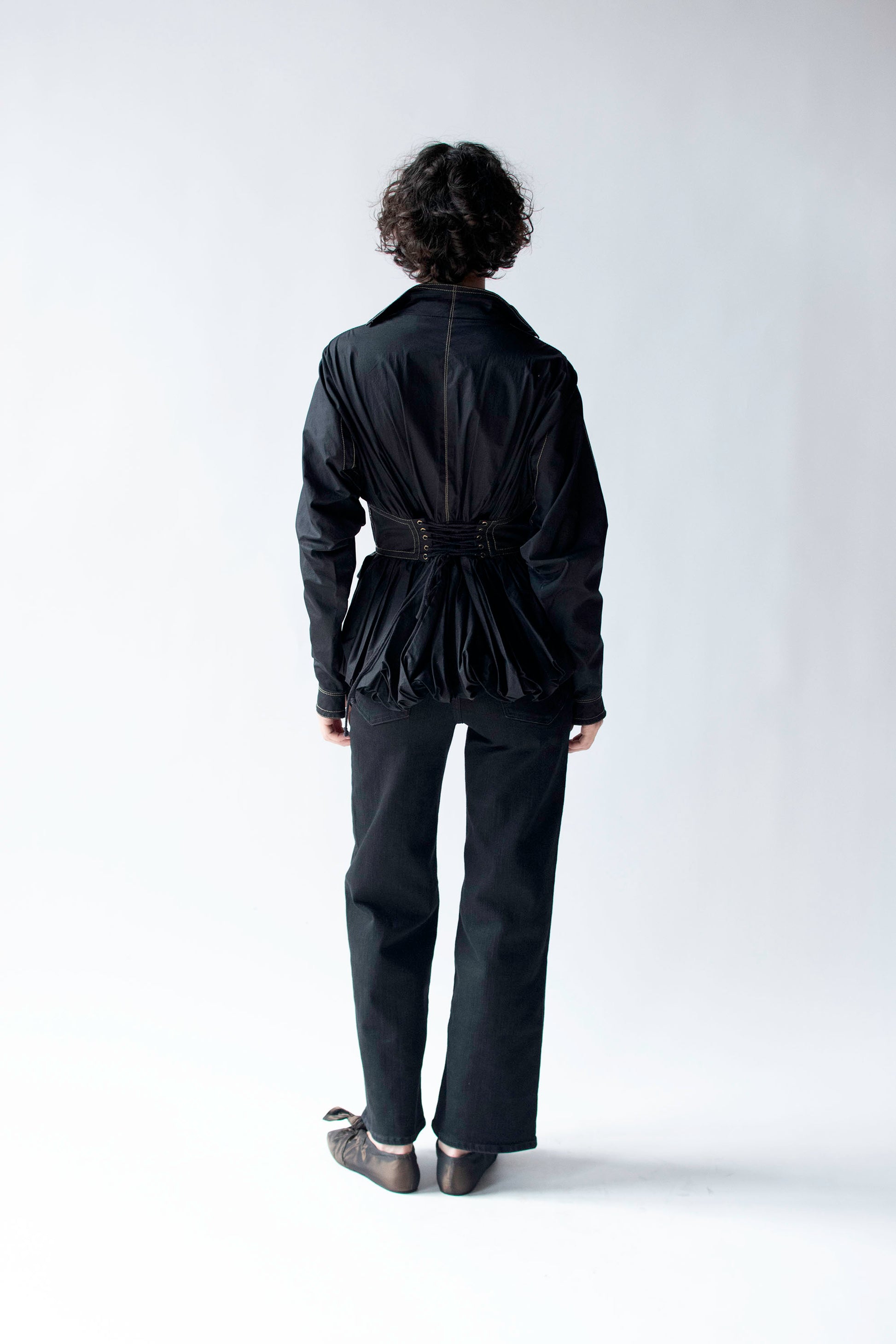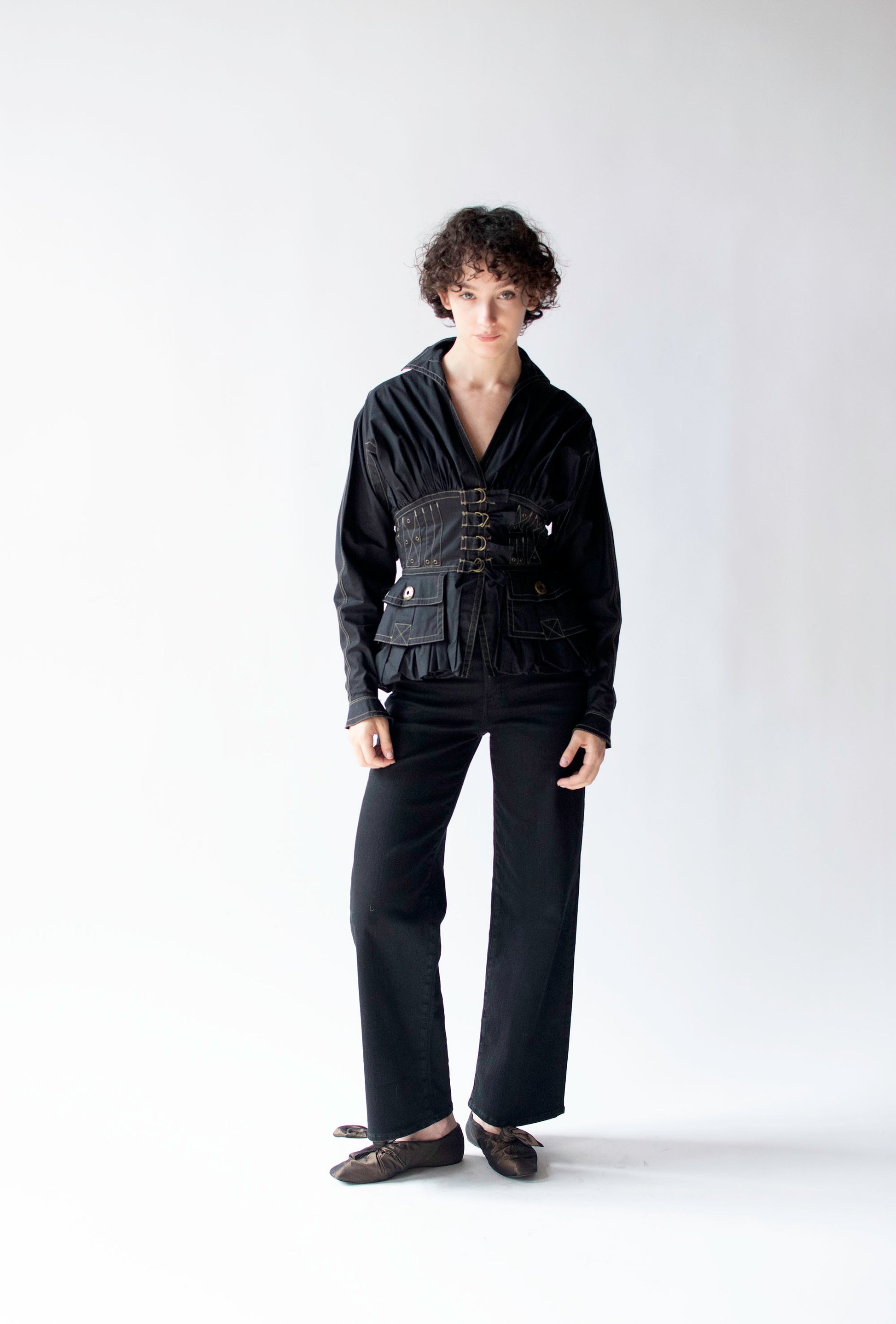 Y2k black corset top with many bells and whistles by Byron Lars for his Beauty Mark brand. Features contrast stitching, a gathered bust, banded waist, peplum hem, lace up back, and semi-attached front cargo pockets. Metal zippers at the sleeve cuffs. Hook and eye closures and buttons up front. Lightweight 97% cotton 3% spandex blend.