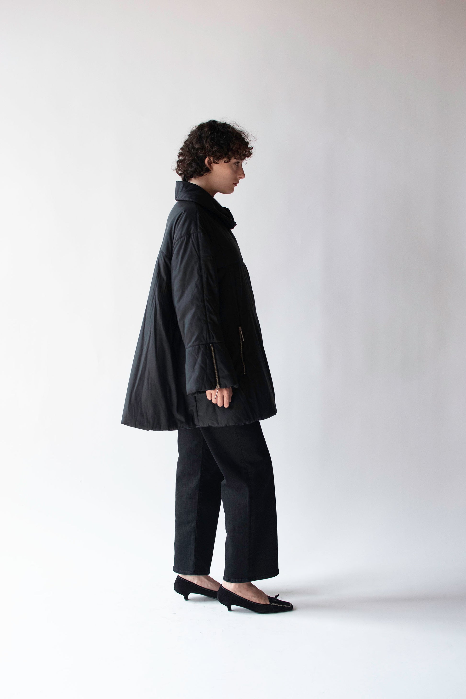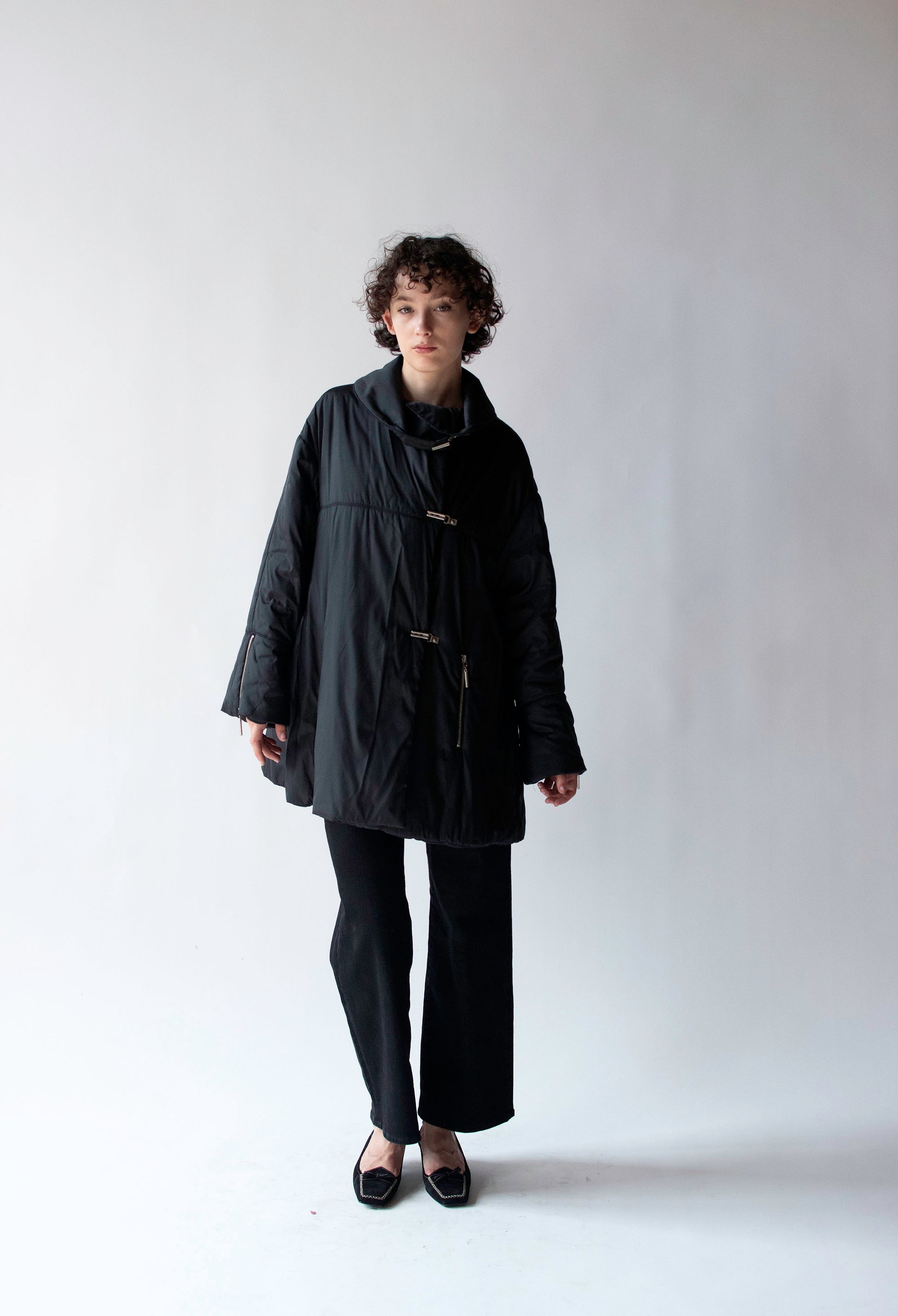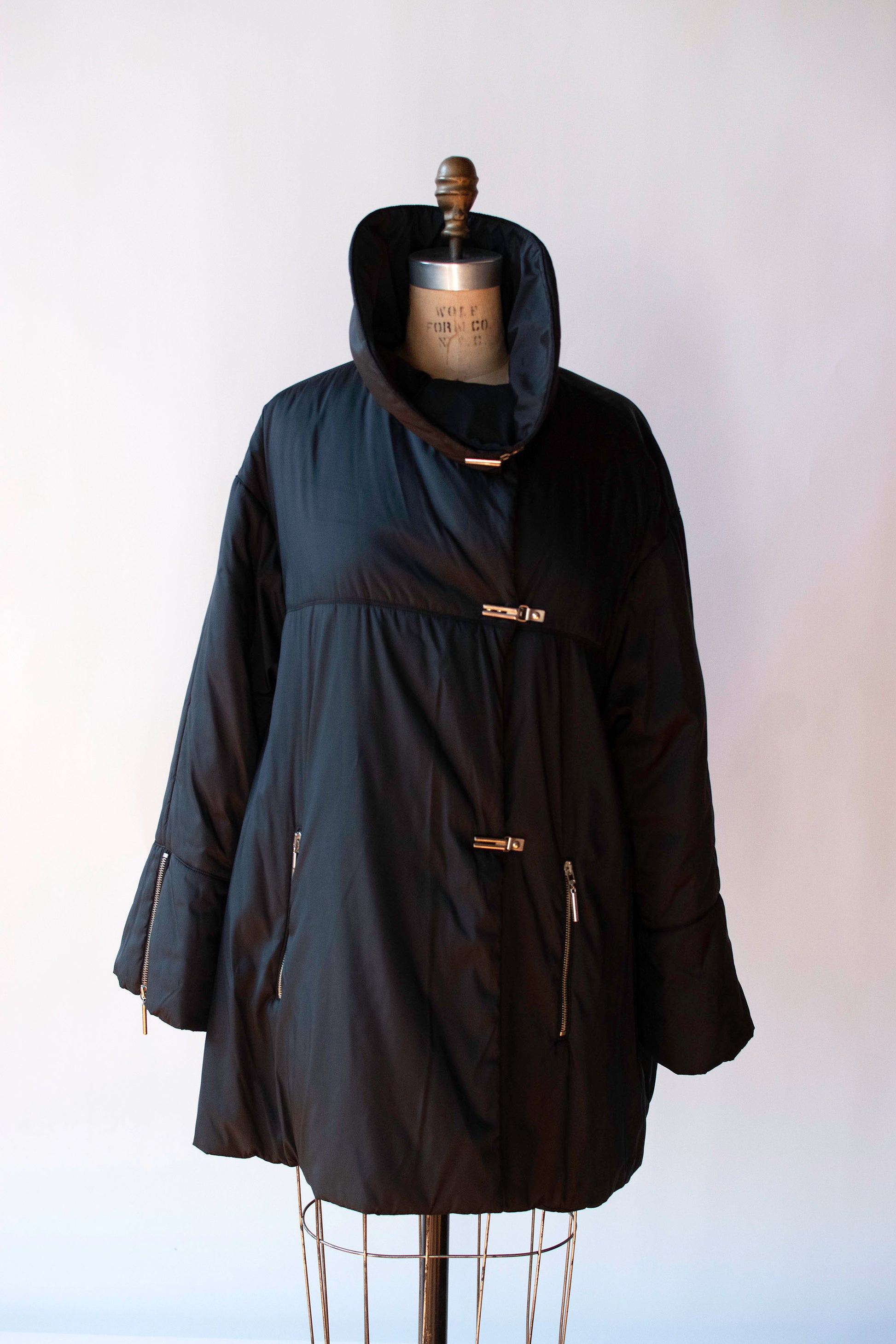 Early 1990s black down coat with metal clasp closures by Claude Montana. A-line shape with a funnel collar. Metal zippers at pockets and cuffs. Missing content and size labels. Made in Italy.
