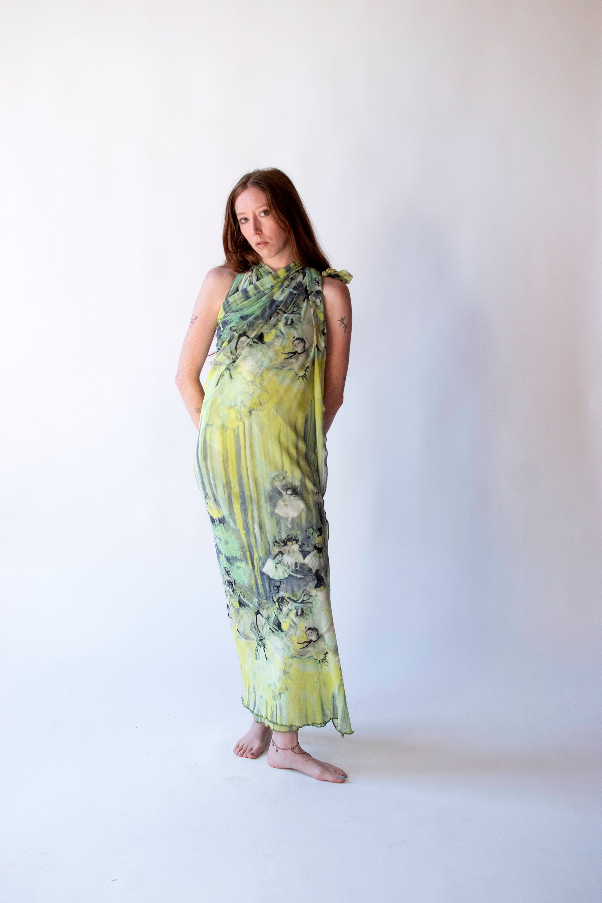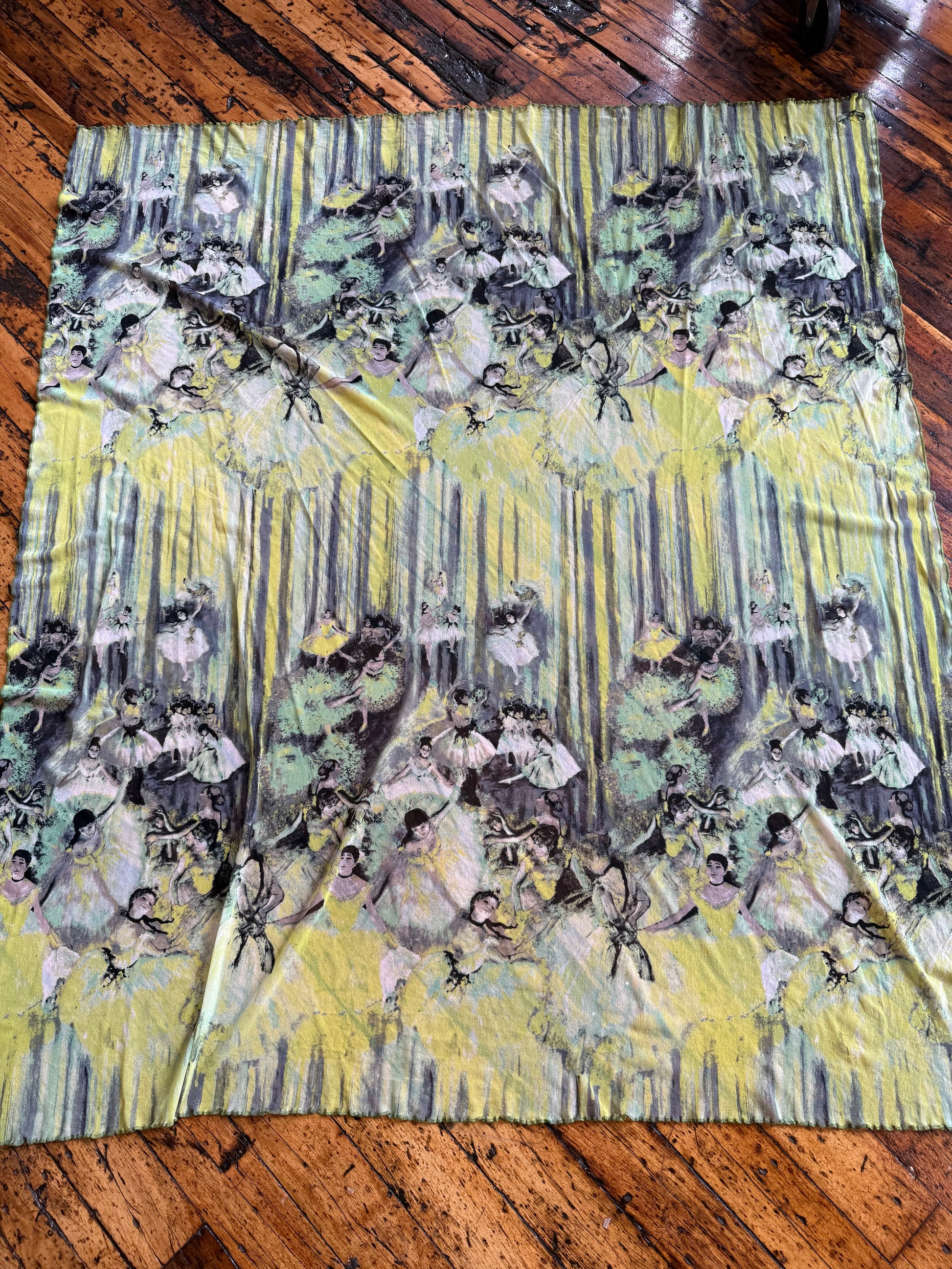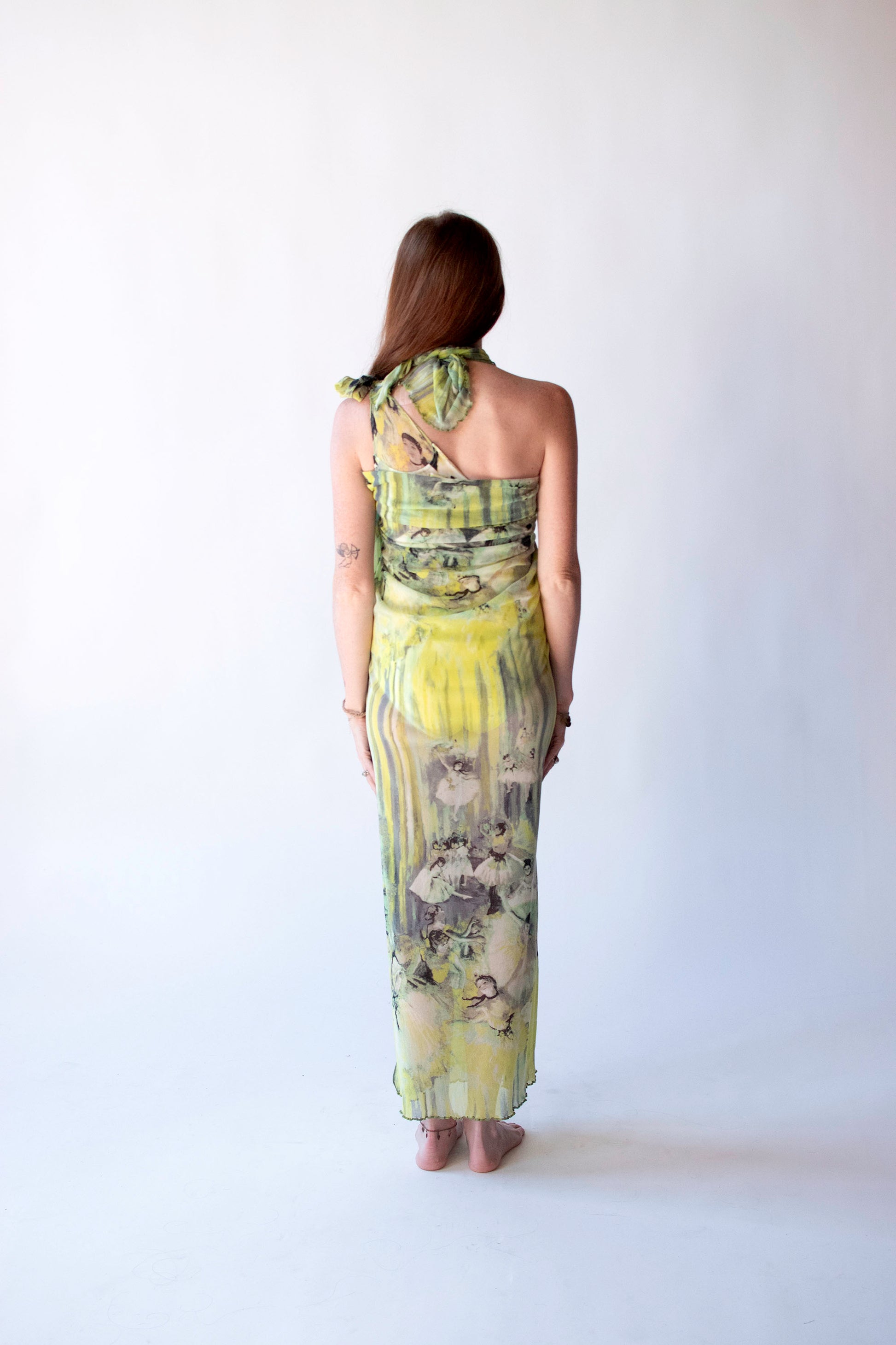 2000s Degas ballerina print Pareo and swimsuit set by Jean Paul Gaultier from his Soleil label. One shoulder swimsuit with mesh tie at shoulder. Large Pareo scarf that can be worn in a variety of ways.