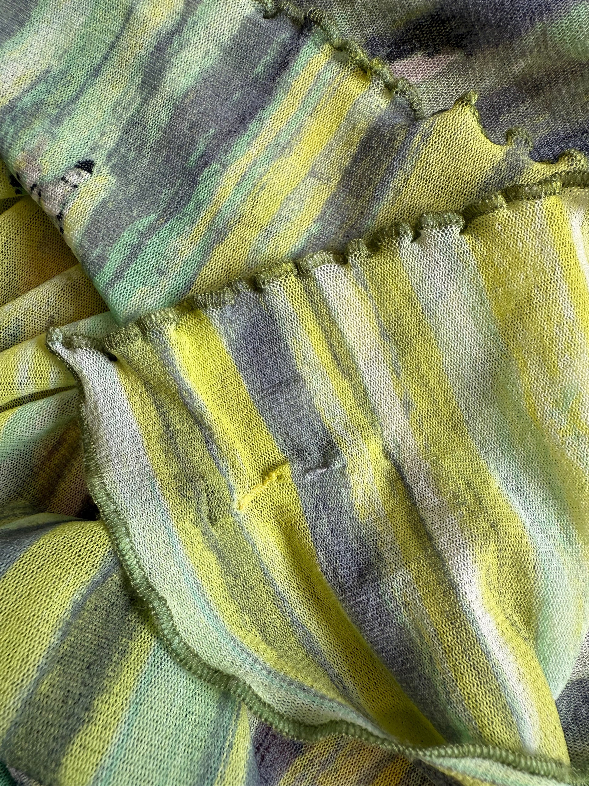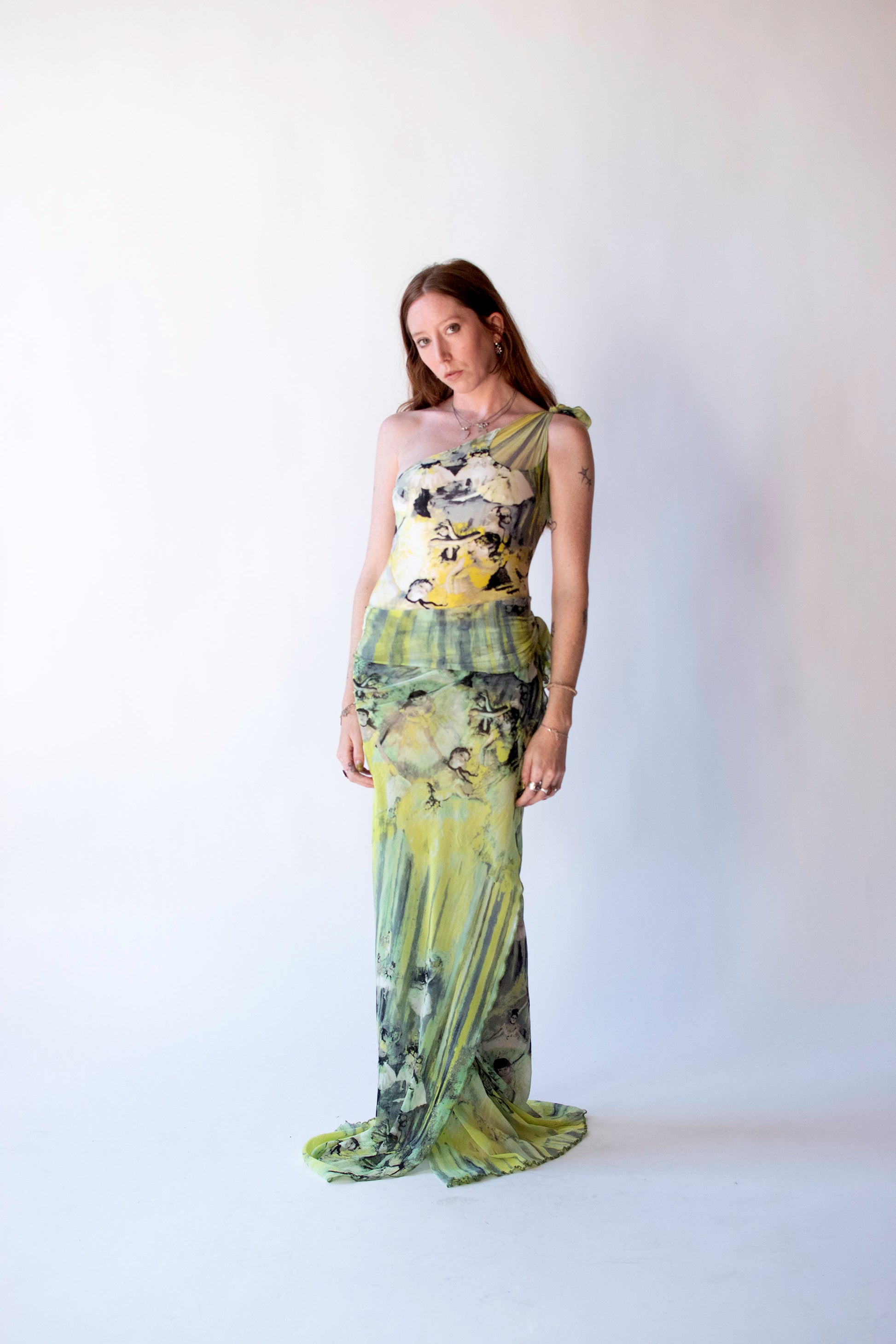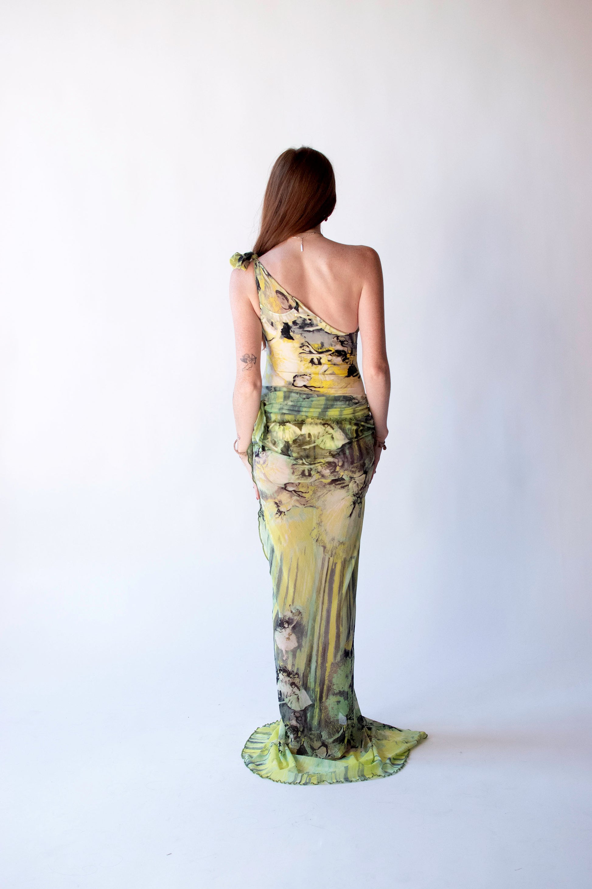 2000s Degas ballerina print Pareo and swimsuit set by Jean Paul Gaultier from his Soleil label. One shoulder swimsuit with mesh tie at shoulder. Large Pareo scarf that can be worn in a variety of ways.