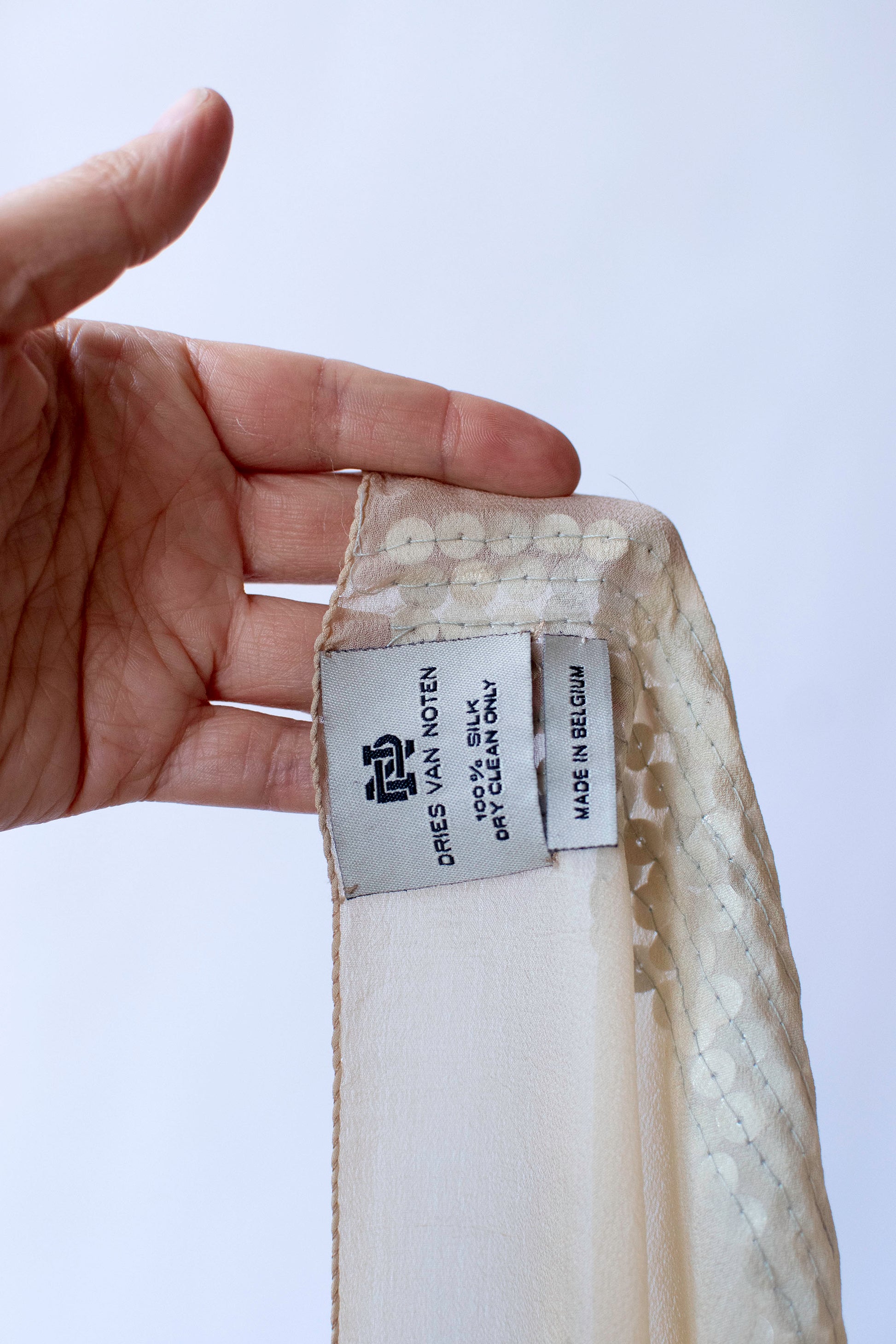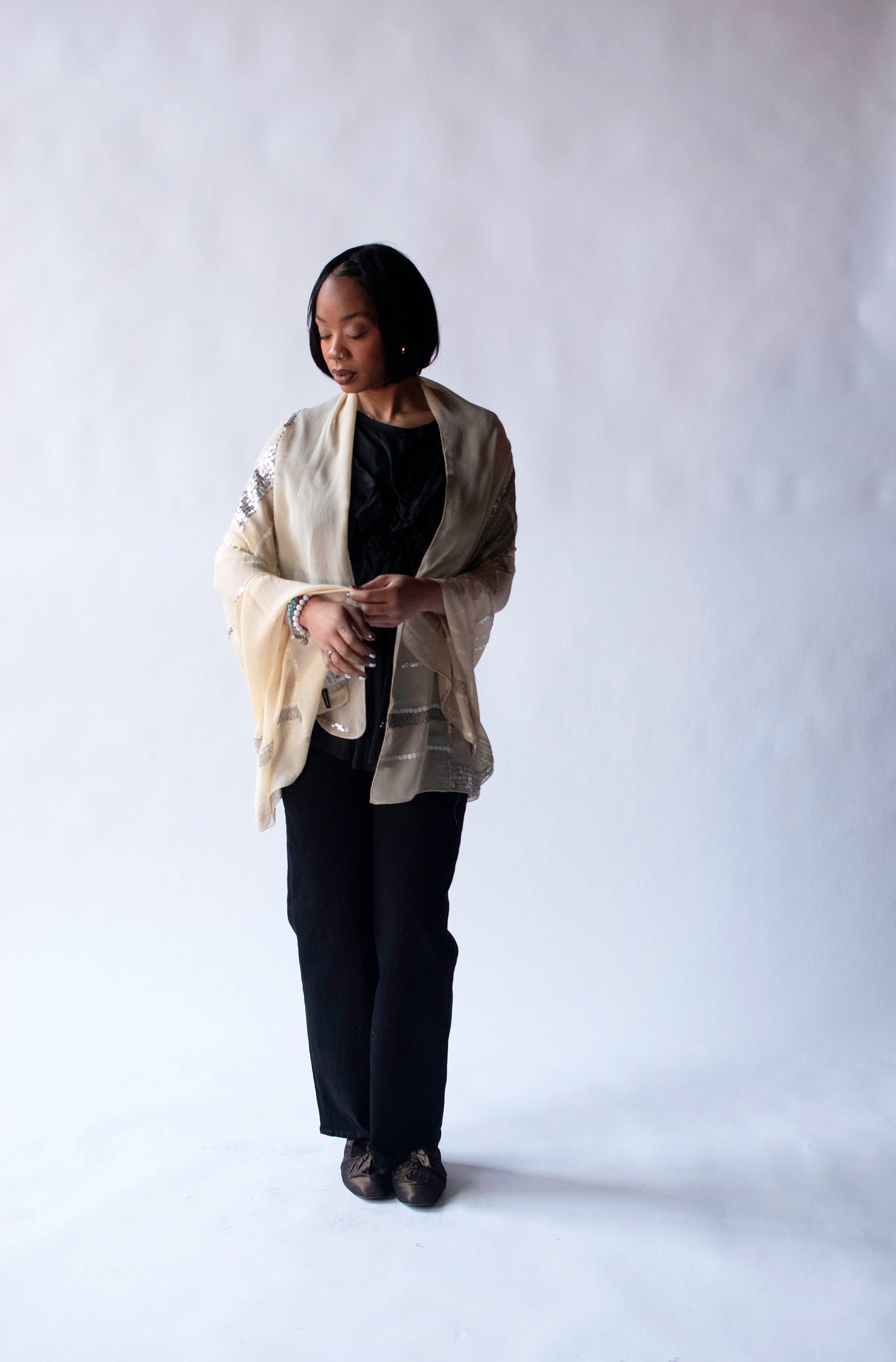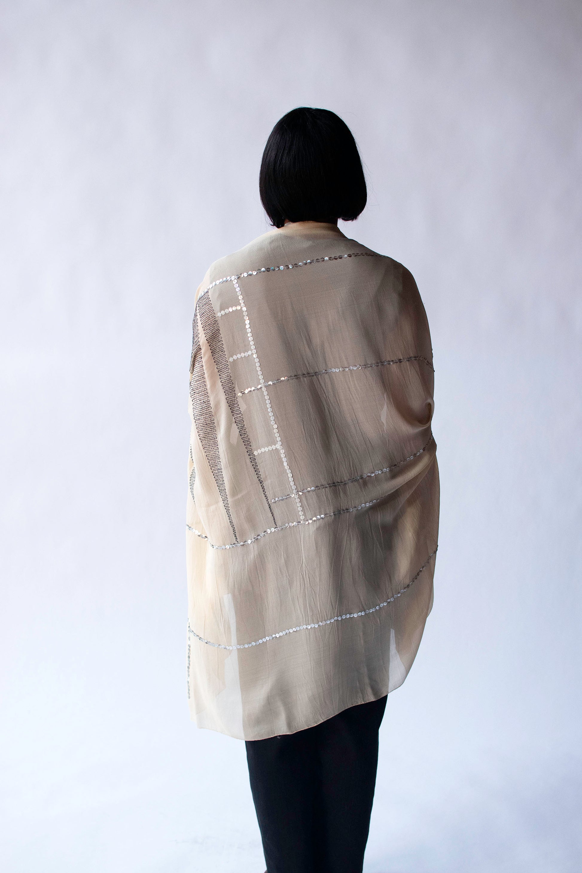 Large cream silk chiffon shawl with black metallic embroidery and iridescent white and silver sequins by Dries Van Noten.