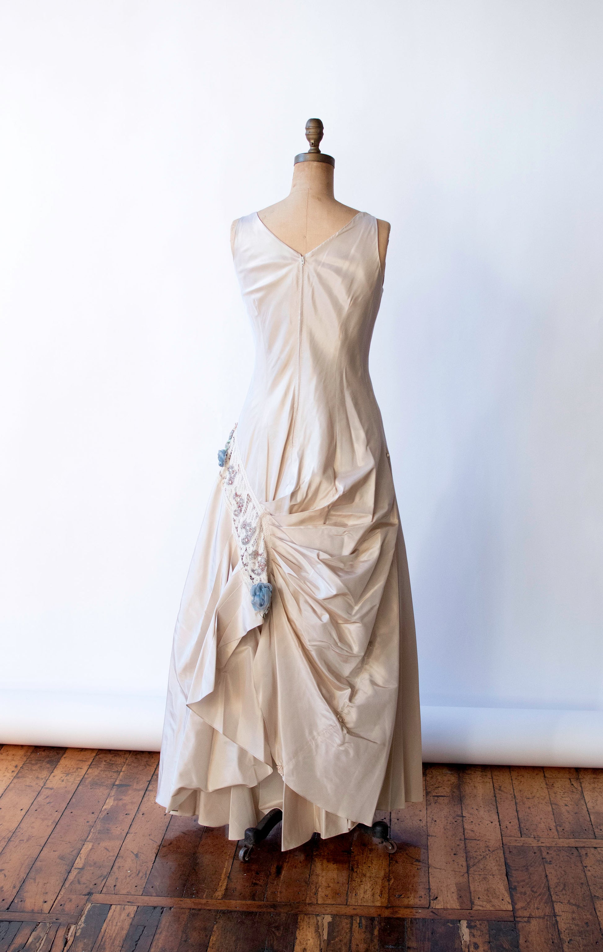 2000s beige silk gown by Carol Peretz. Rosette, bead and lace accents. Gathered bustle back. V-neck. Fully lined. Hand picked plastic back zipper. 100% silk. Made in U.S.A of imported Fabric.