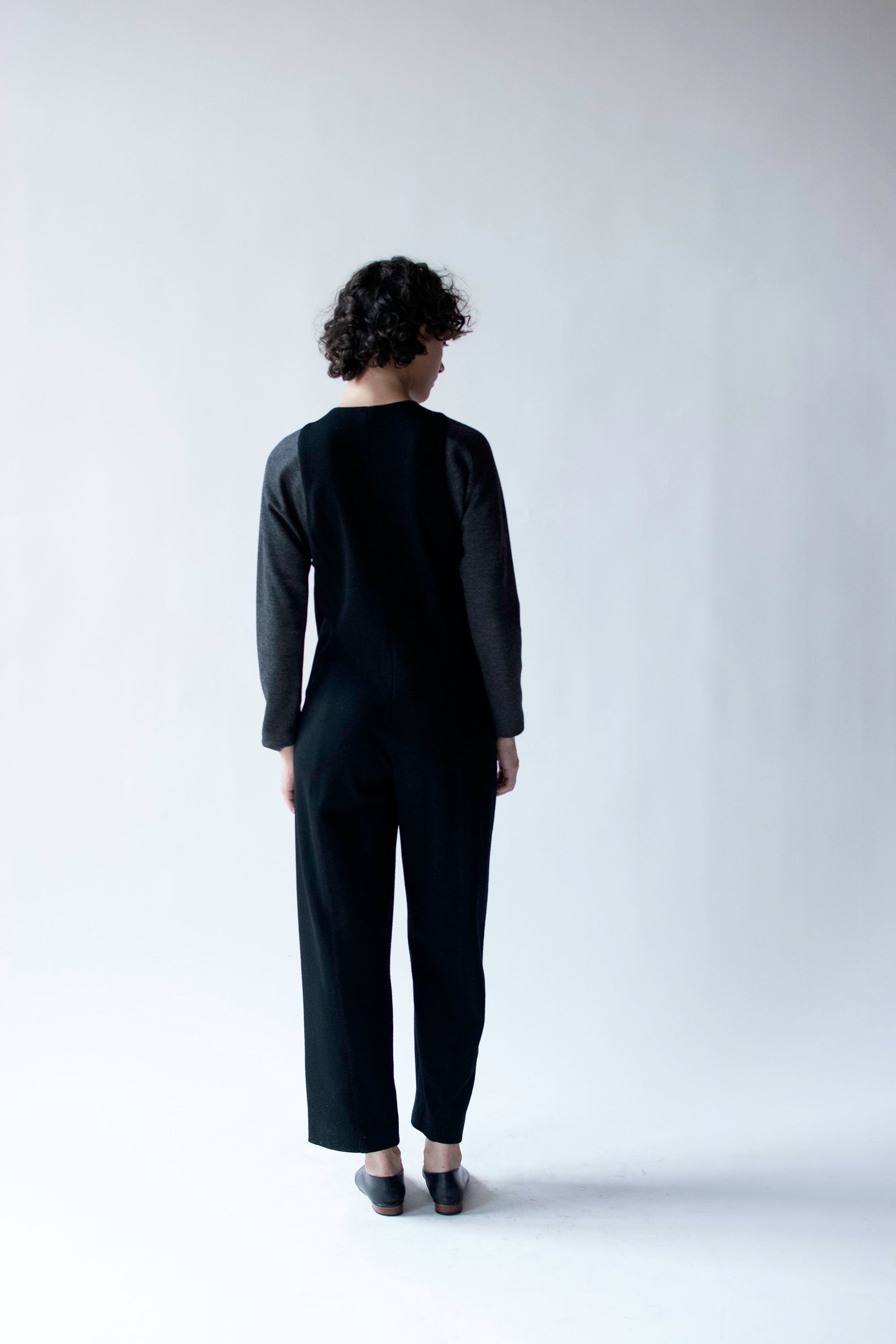 1990s black and gray color block jumpsuit by Geoffrey Beene. Plastic zipper at the front. Feels like wool, unlabeled.