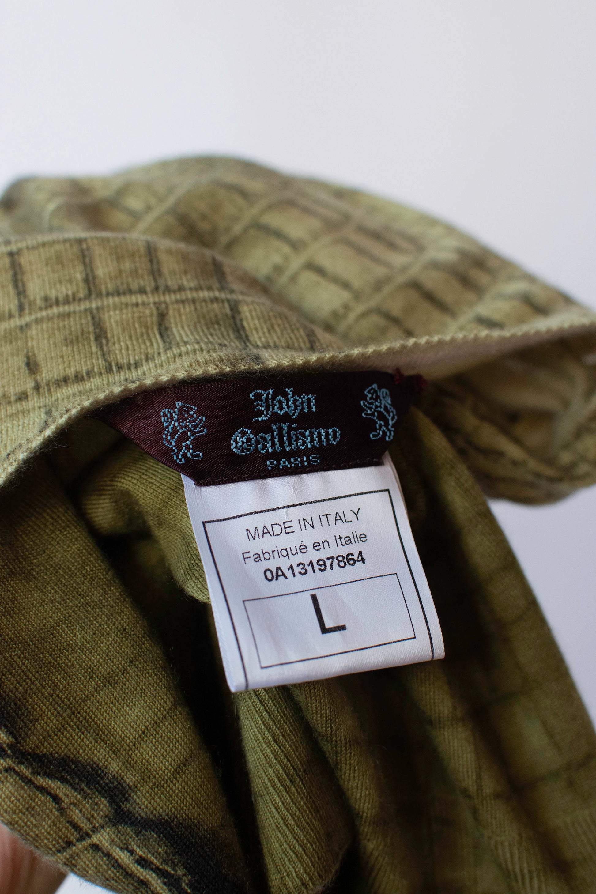 Alligator print cardigan by John Galliano. Self fabric covered buttons with loop closures. 100% Cashmere.