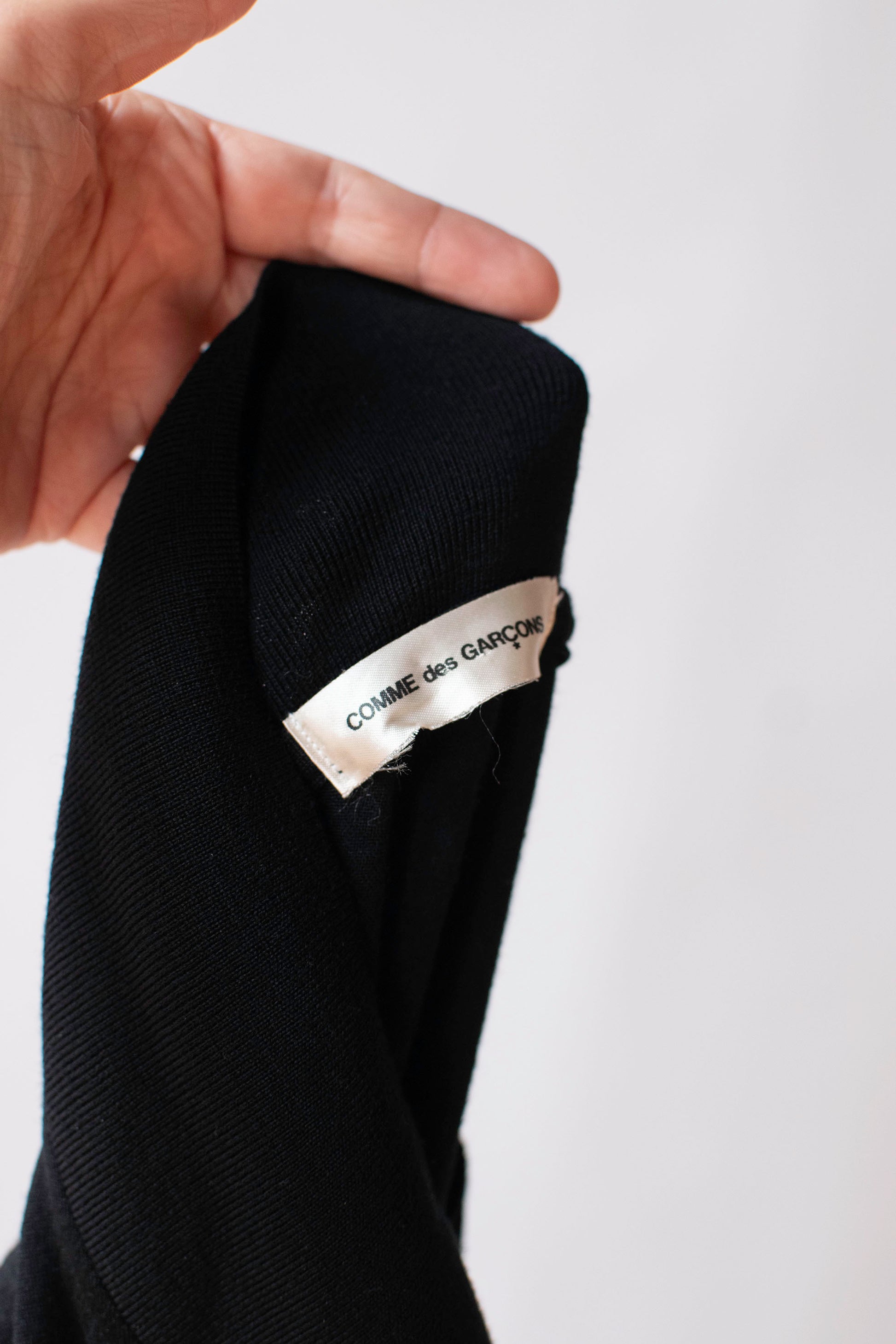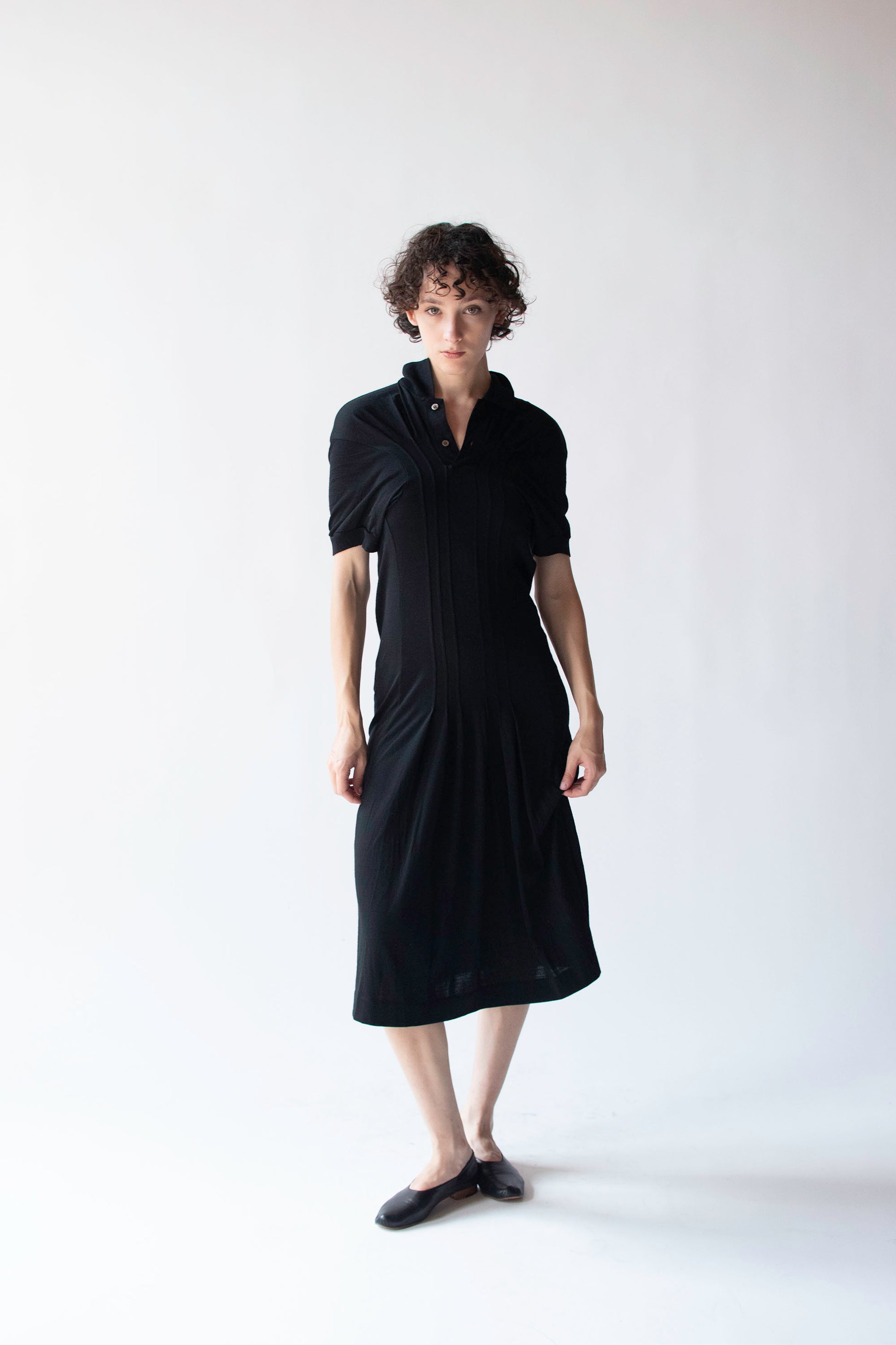 1990s black wool dress with an intentional "Shrunken" bodice by Comme des Garçons. Pintuck pleating down the center. Short sleeves and button collar. Pullover style. 100% wool. Dated AD 1994.