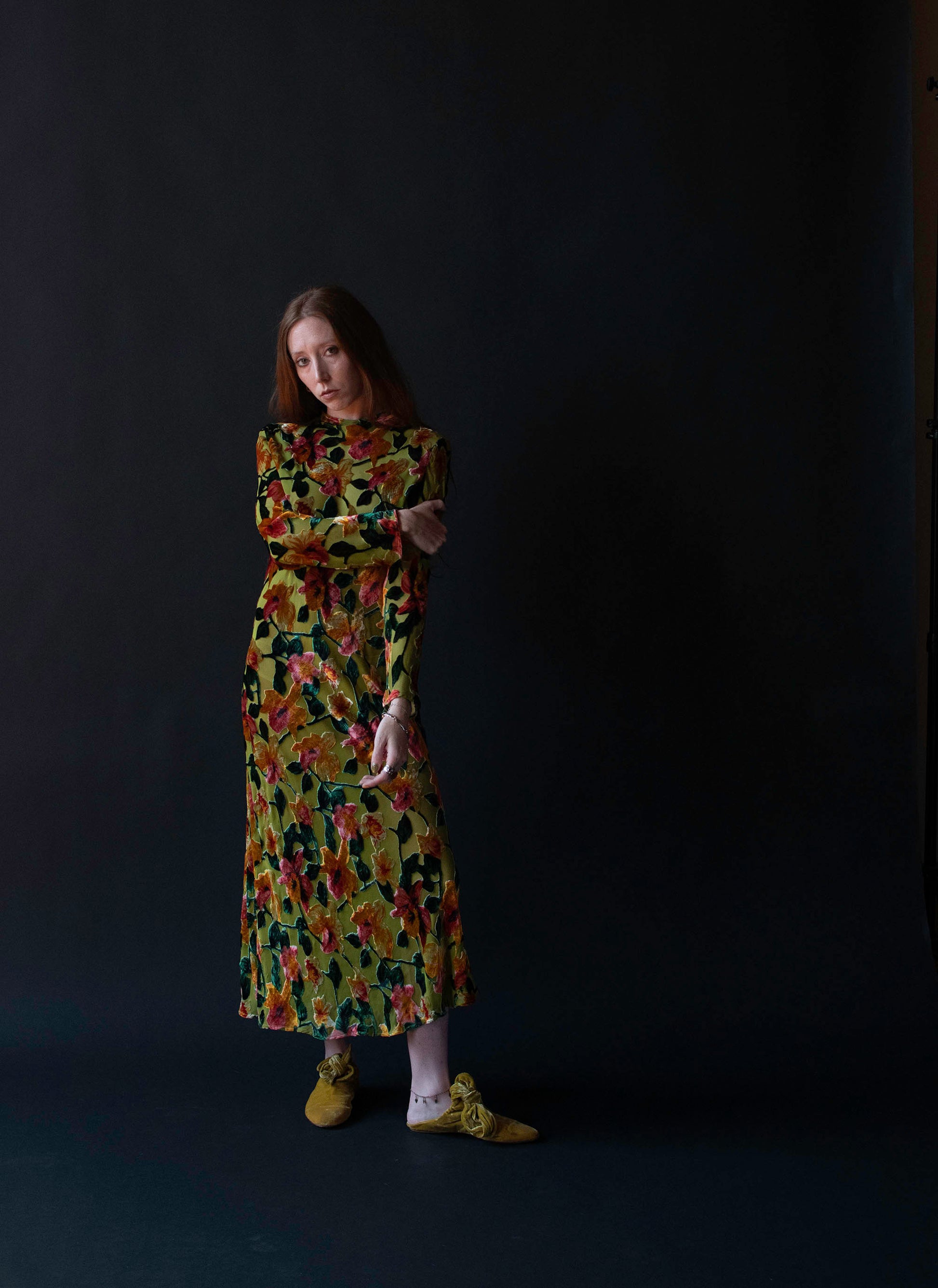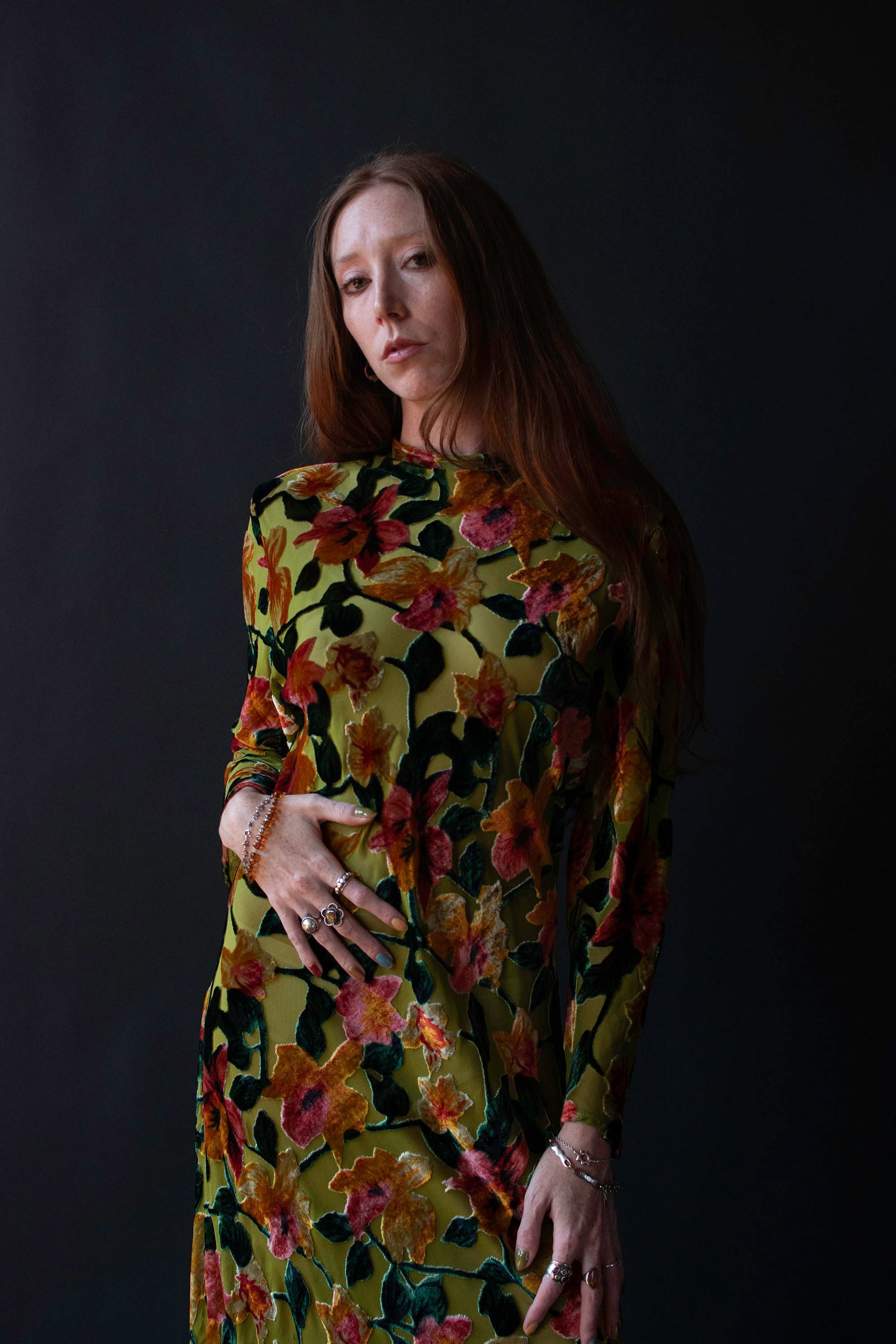 1990s burnout velvet dress by Laureano. Sheer green chiffon with orange pink, red and dark green velvet flowers. Bias cut with a fitted collar, long sleeves and self fabric buttons partially down the back. 82% rayon 18% silk.