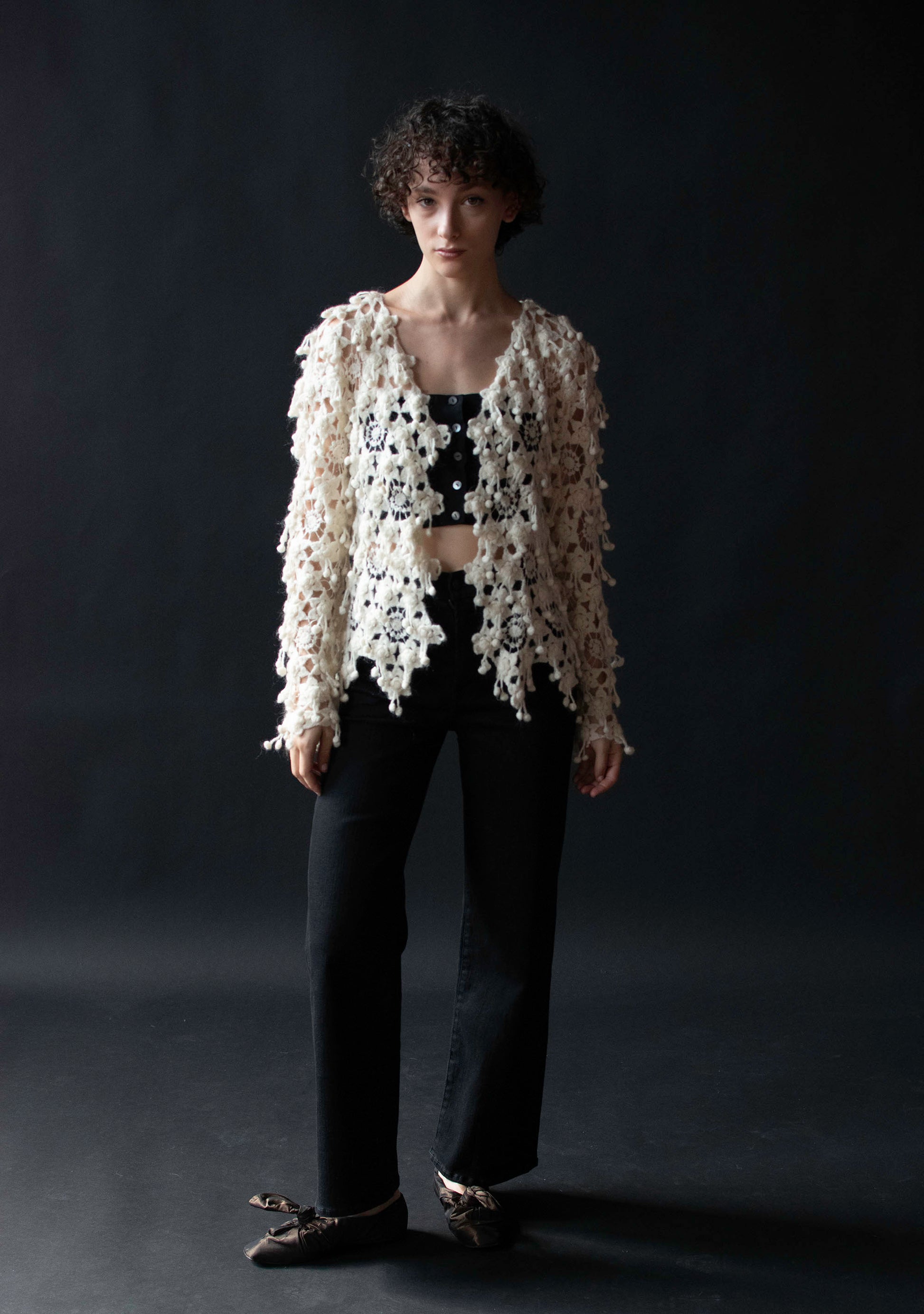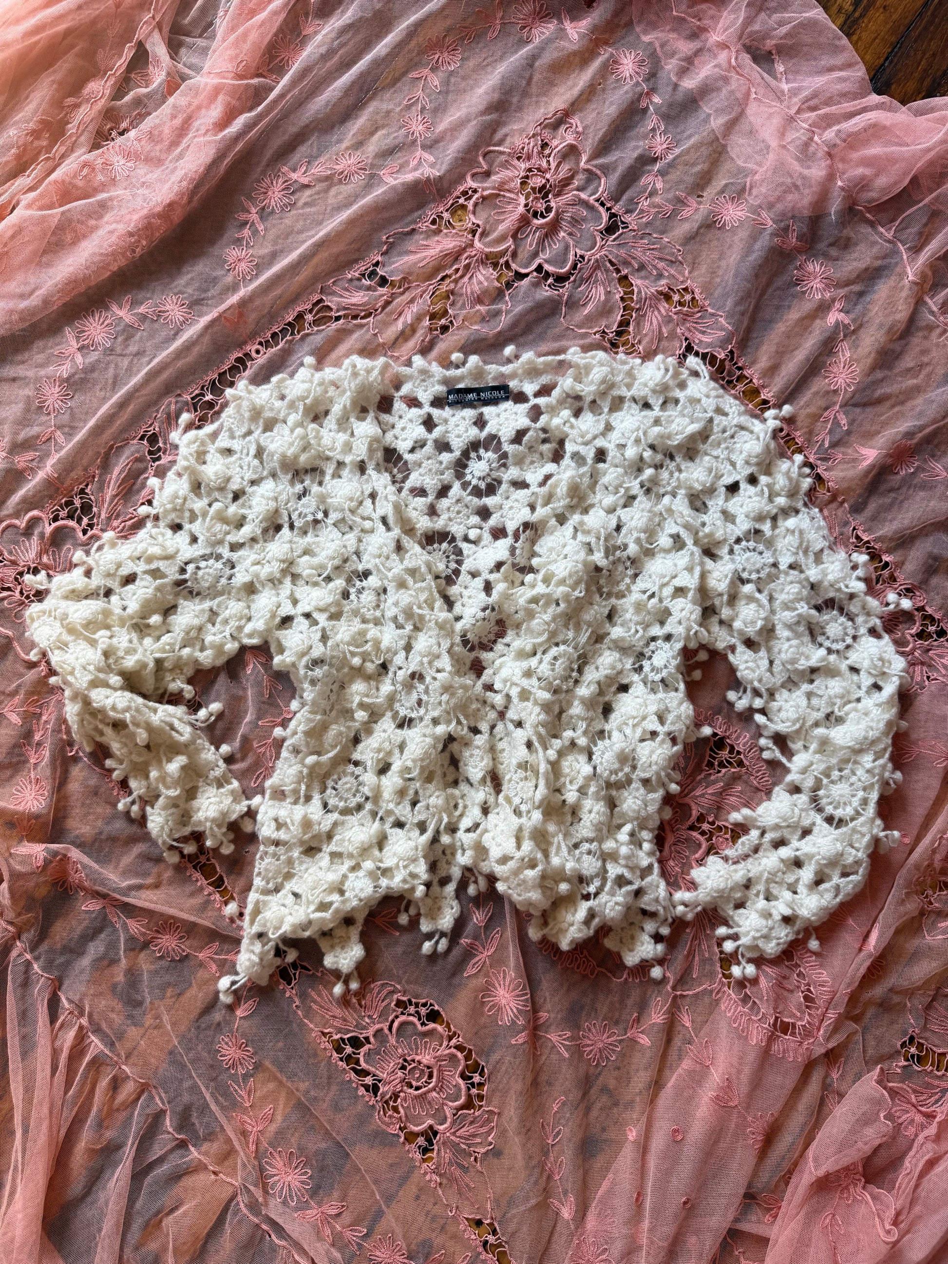 1990s delicate snowflake pompom knit cardigan by Madame Nichole. Open front with no closures. 85% wool 15% nylon.