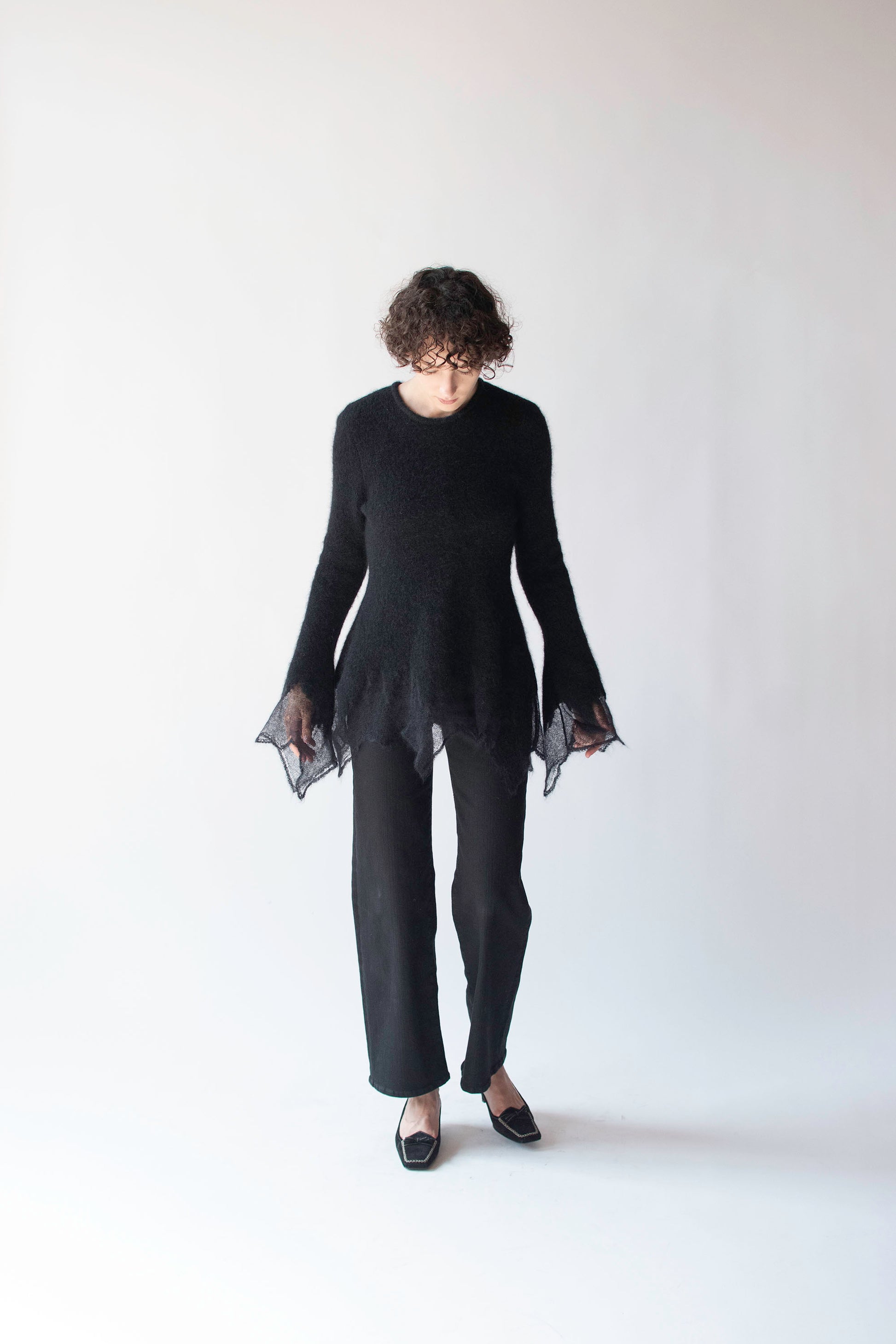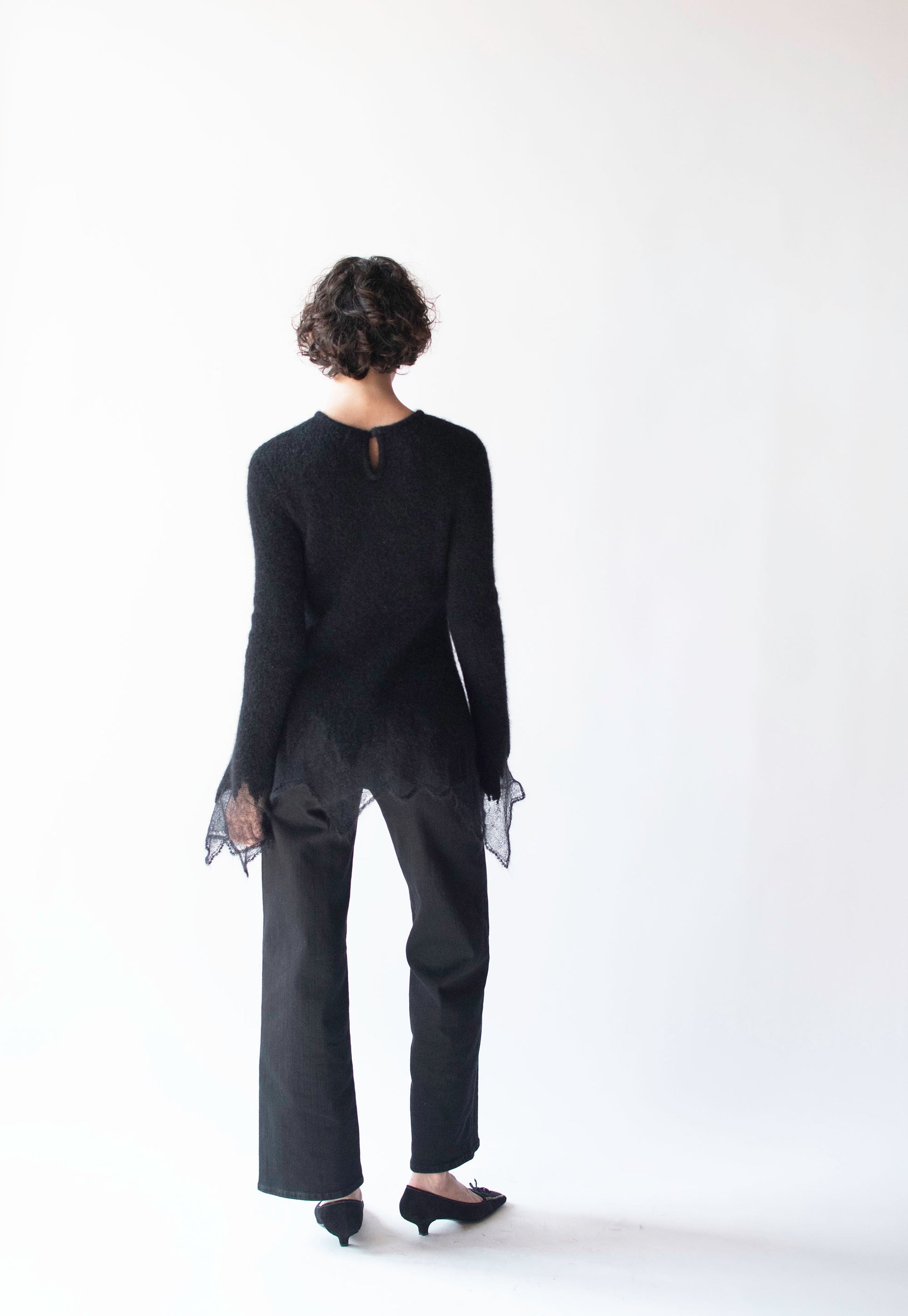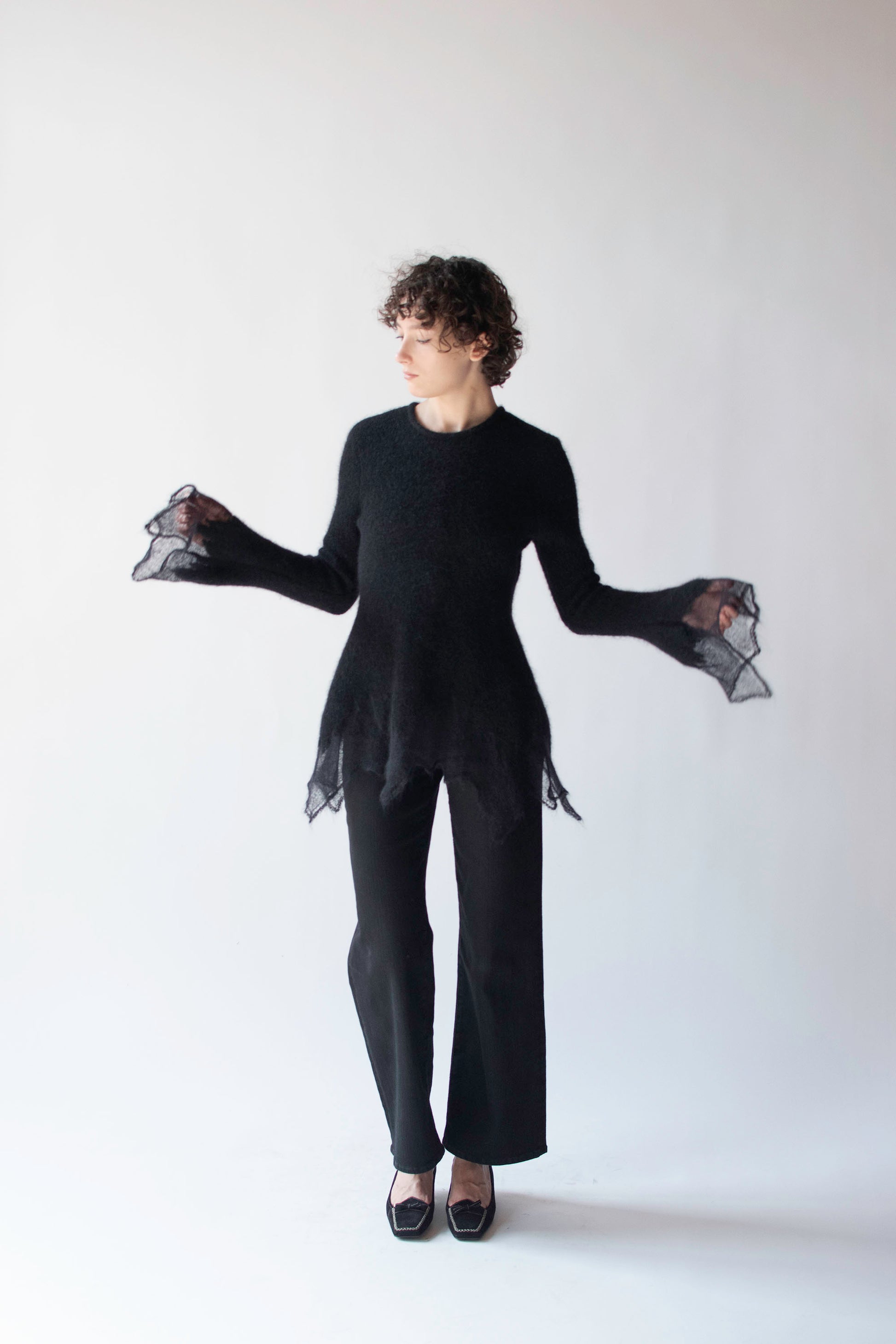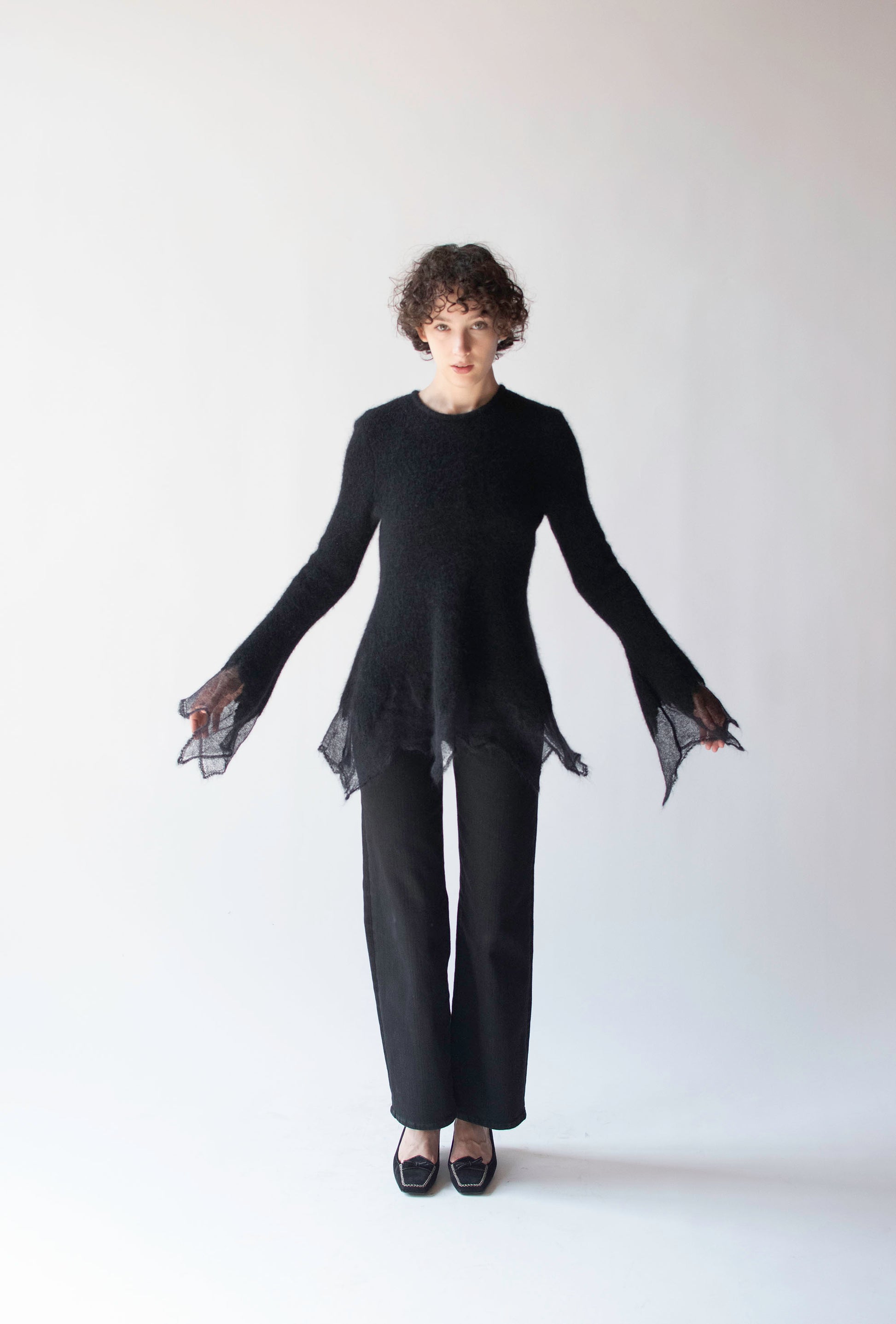 Gossamer black mohair blend sweater with jagged cuffs and hemline by Chanel from the FW 2009 runway collection. Pullover style with CC logo button and keyhole detail at the back of the collar. 52% mohair 24% nylon 21% rayon 3% spandex.