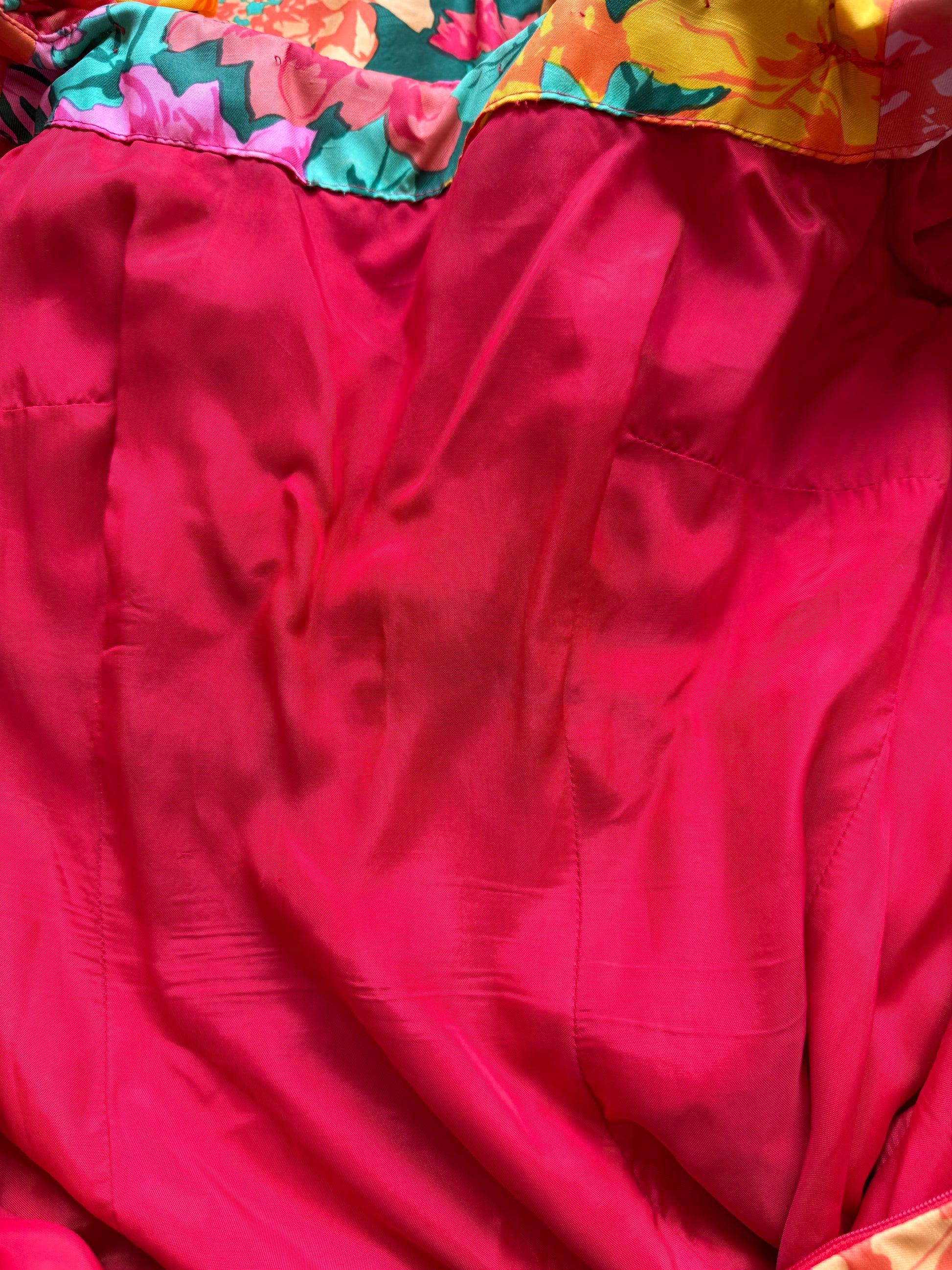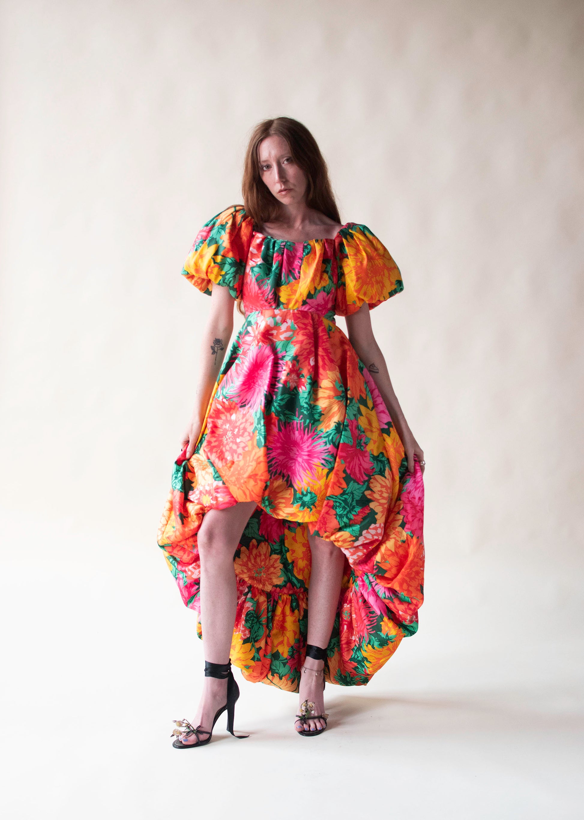 Exceptional 'Moonflower Dahlia' dress by Arnold Scaasi from his SS 1987 collection. Features puff sleeves with elastic at shoulders, a draped empire bodice and very full high low skirt. Tulle lining at the sleeves and skirt. Boning at bodice. Silk with red acetate lining. Fastens with a concealed plastic zipper at the back.