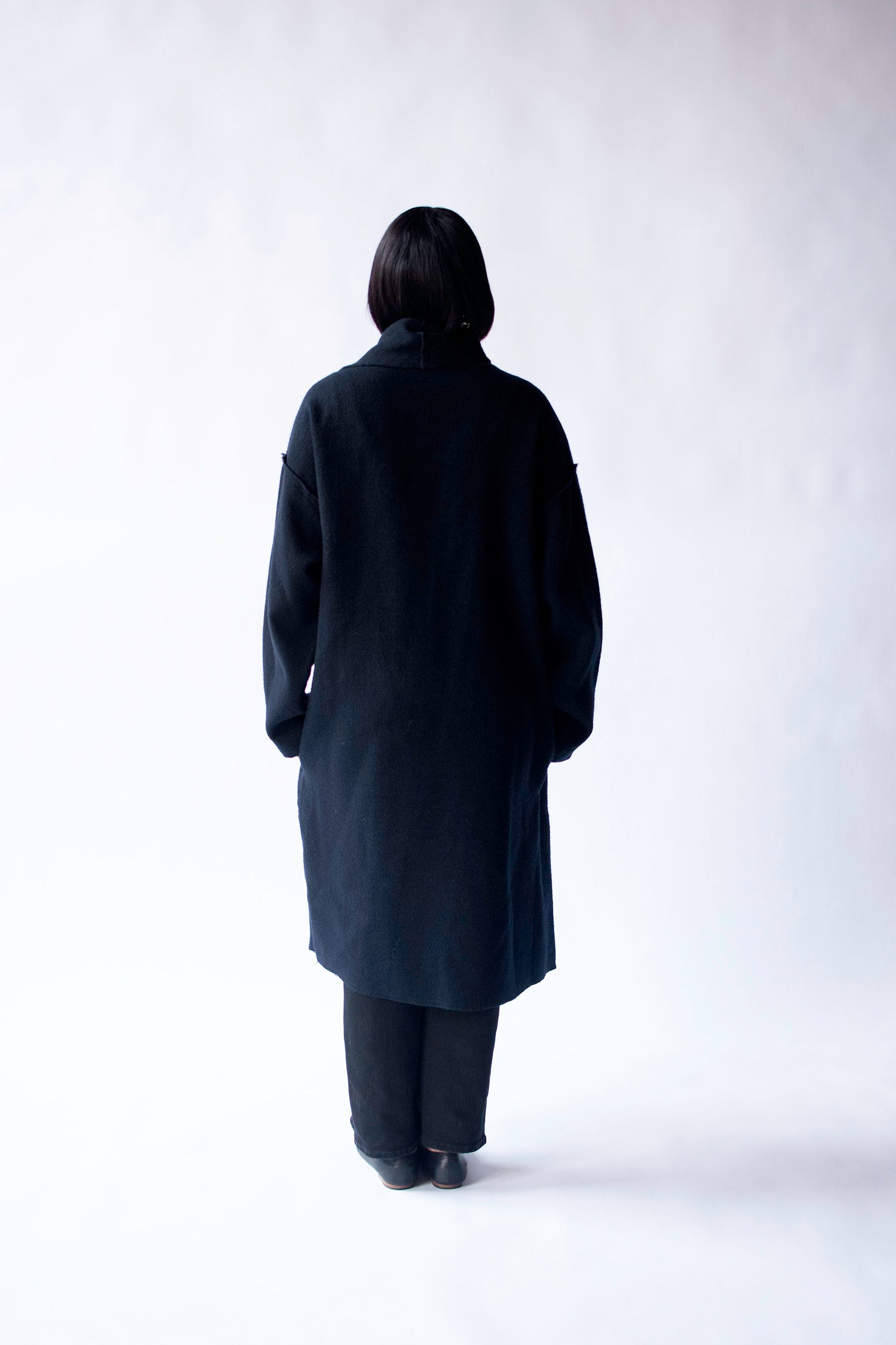 Soft black blanket weight open front coat by Lanvin, dated 2010. metal hook and eye closure and saftey pin closure at front. Intentionally unfinished edging. hip pockets. 59% wool 39% linen 2% cotton blend.