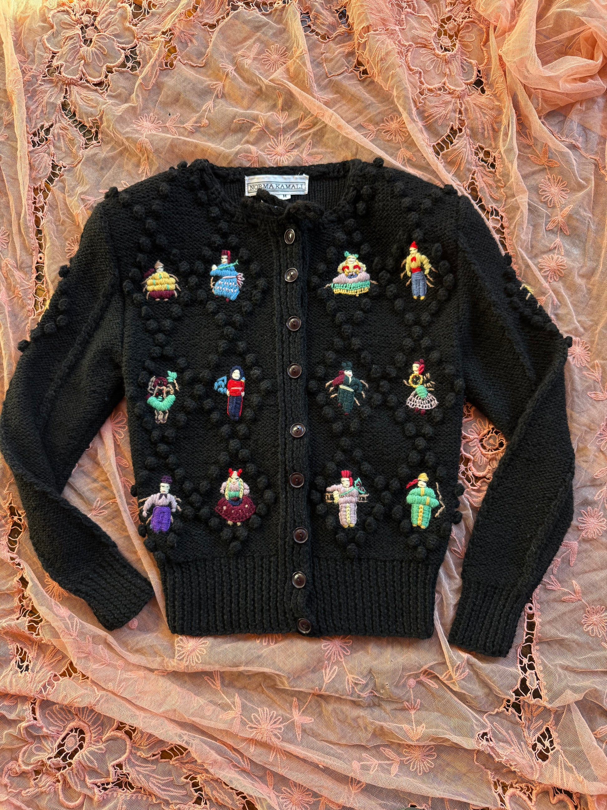 1980s - early 90s folk inspired embroidered popcorn knit cardigan by Norma Kamali. Ties at collar. Buttons down the front. Shoulder pads. 100% wool.