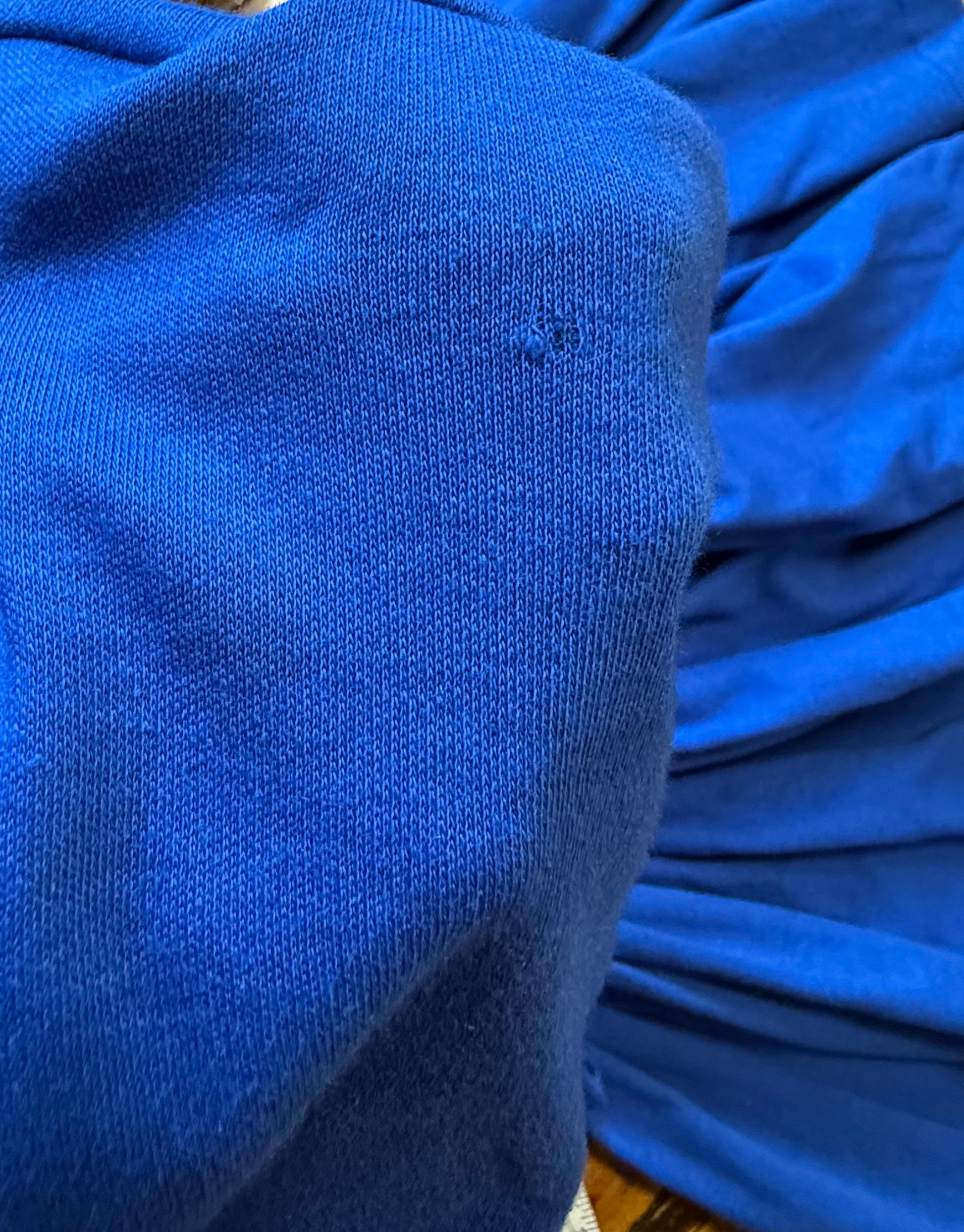 - Small snag hole / imperfection on left shoulder.