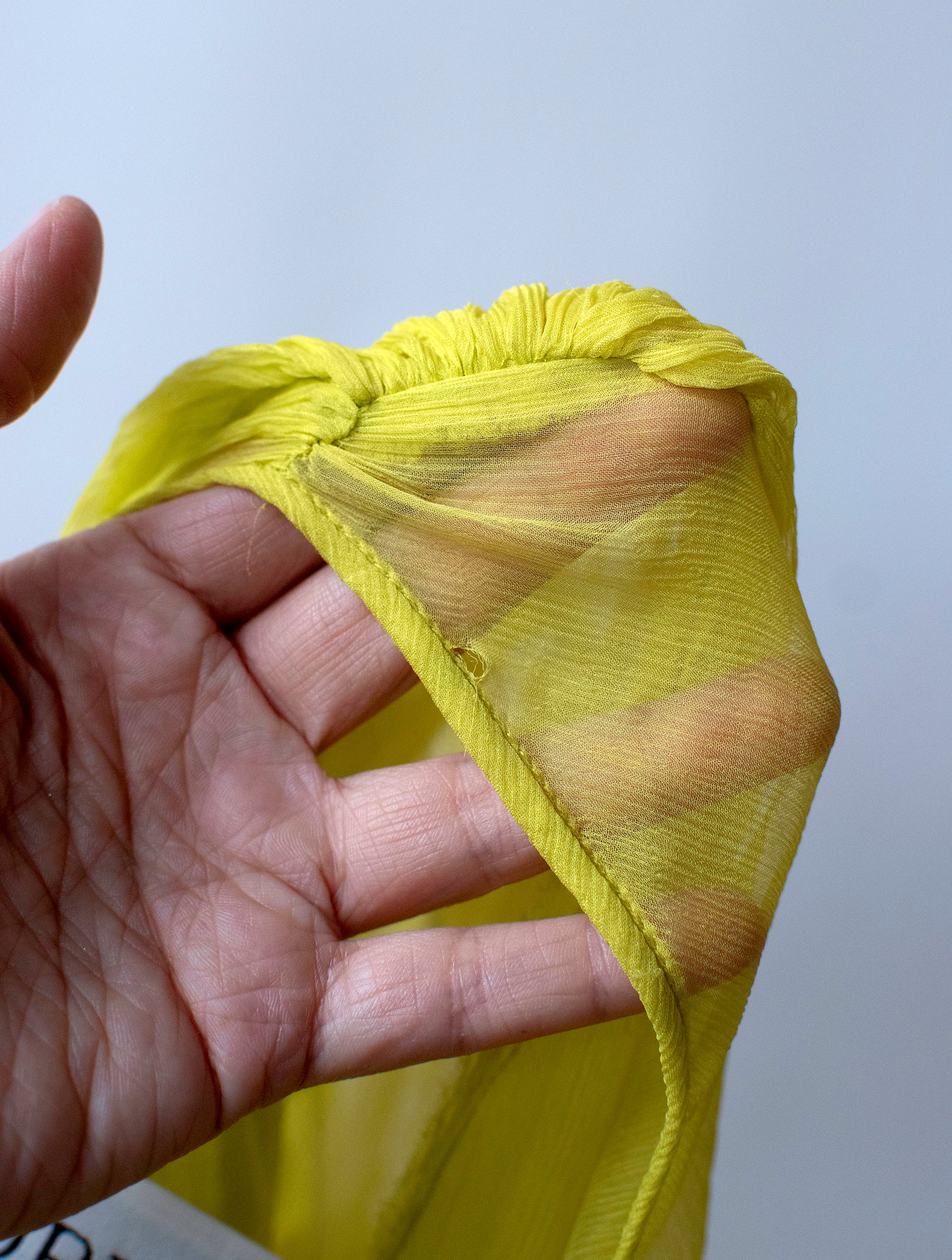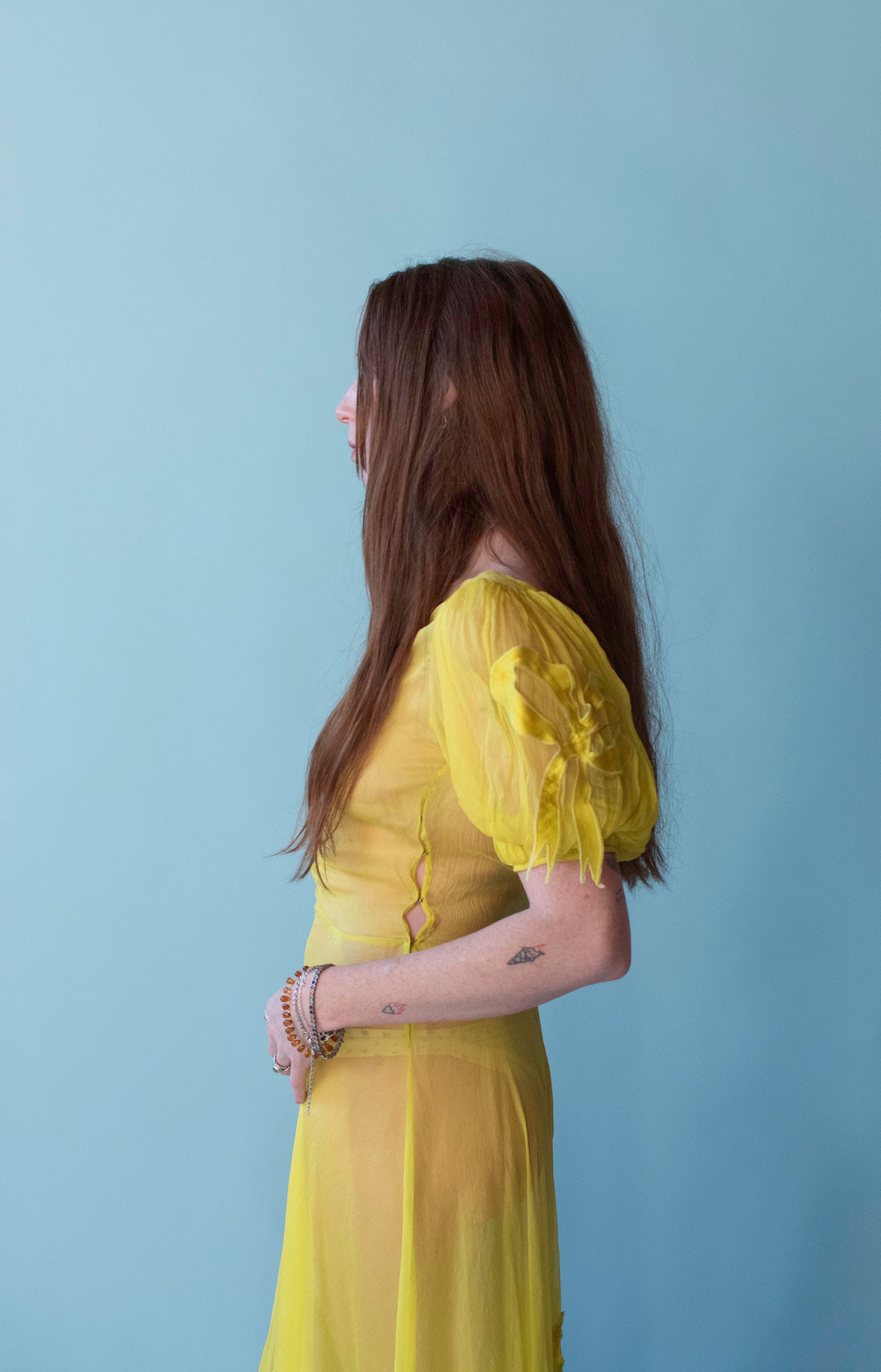 Chartreuse chiffon 1930s inspired dress with applique bows and puff sleeves by Norma Kamali. Sheer. Features a ruched bodice, nip waist and full skirt. Metal hook and eye closure at back of collar and side of bodice. Feels like silk. Sleeves lined in white tulle.
