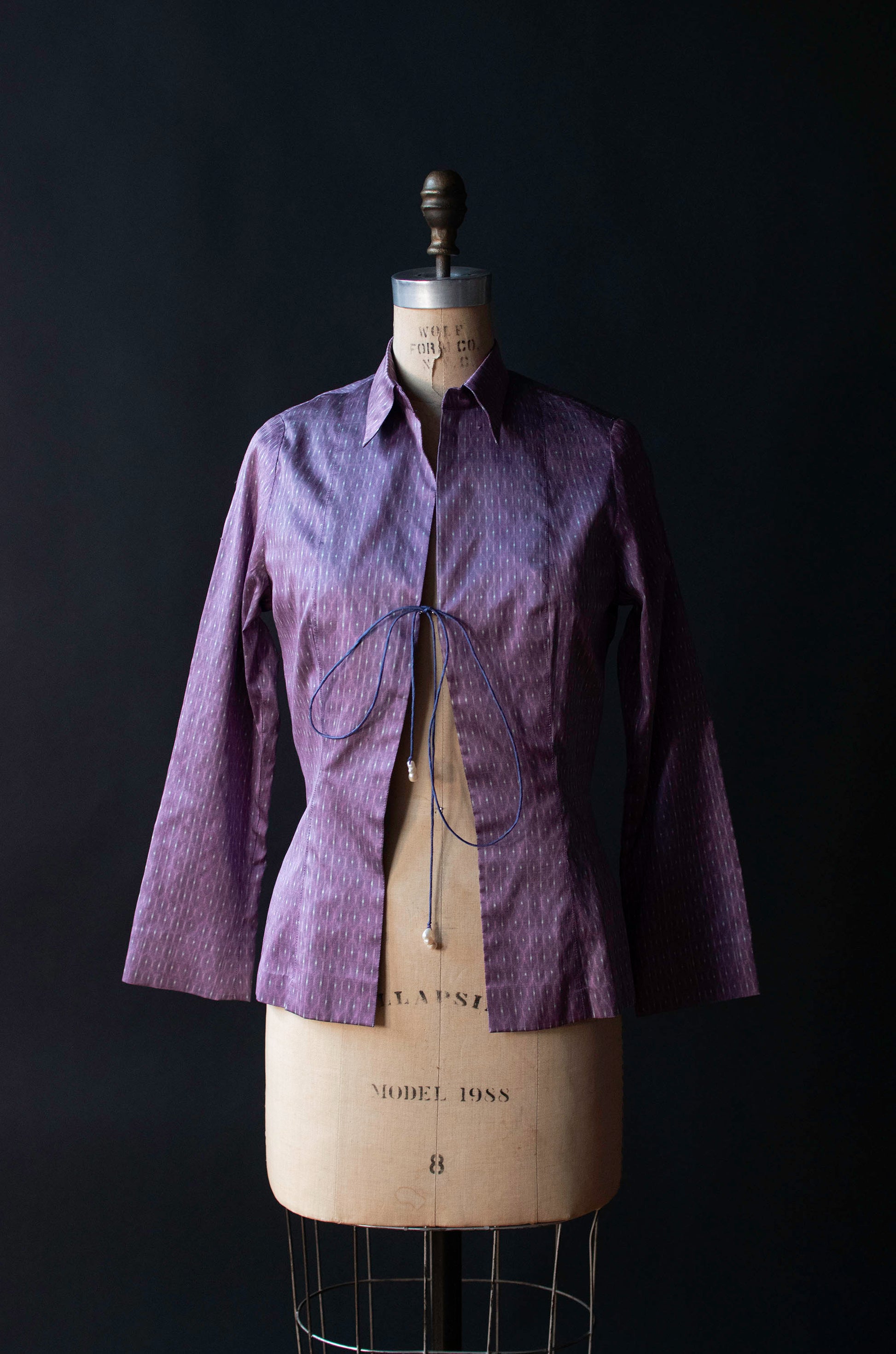 Lavender 100% handloomed silk shirt by Marianne Kooimans. Open front with pearl accents on cord ties.