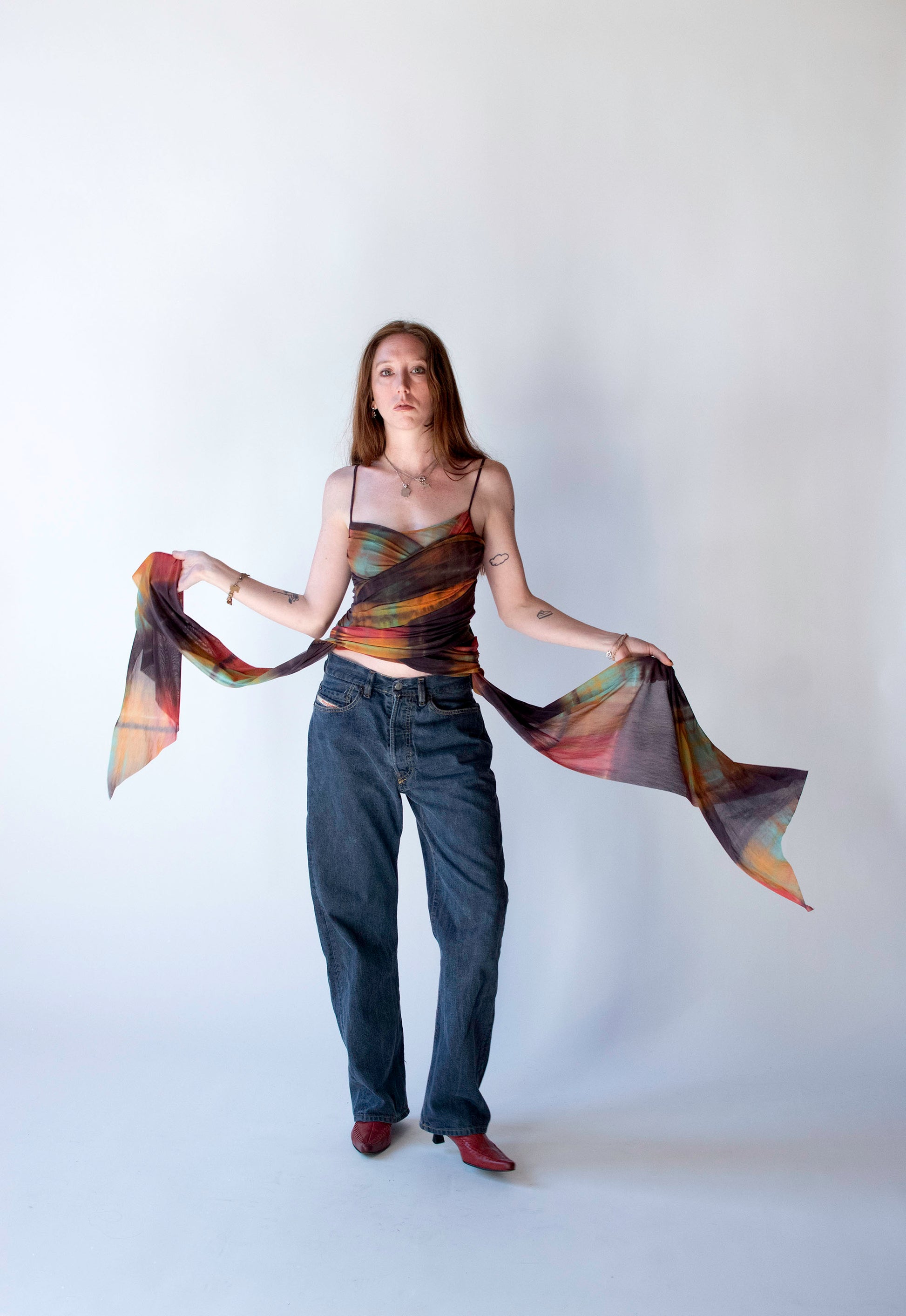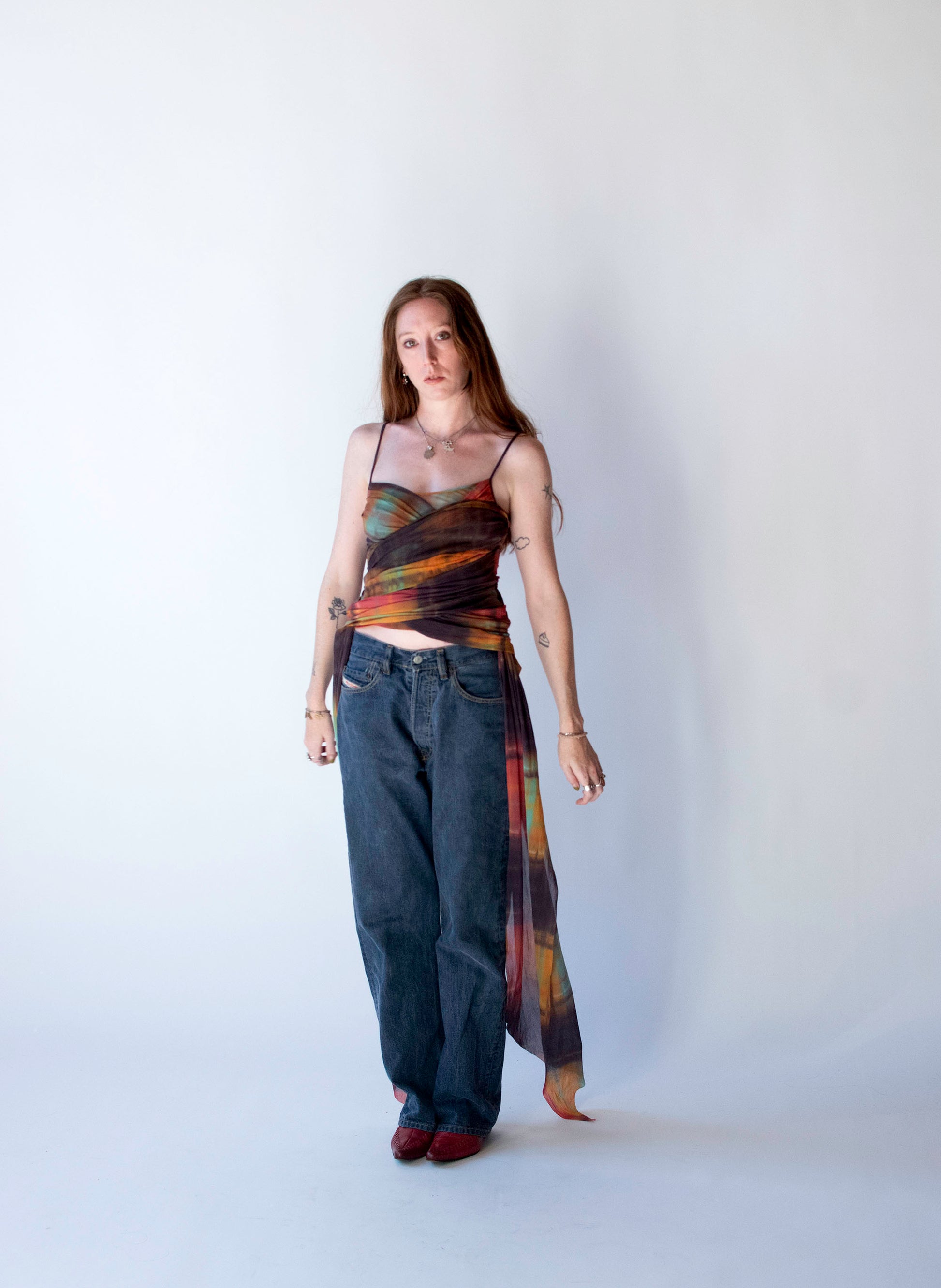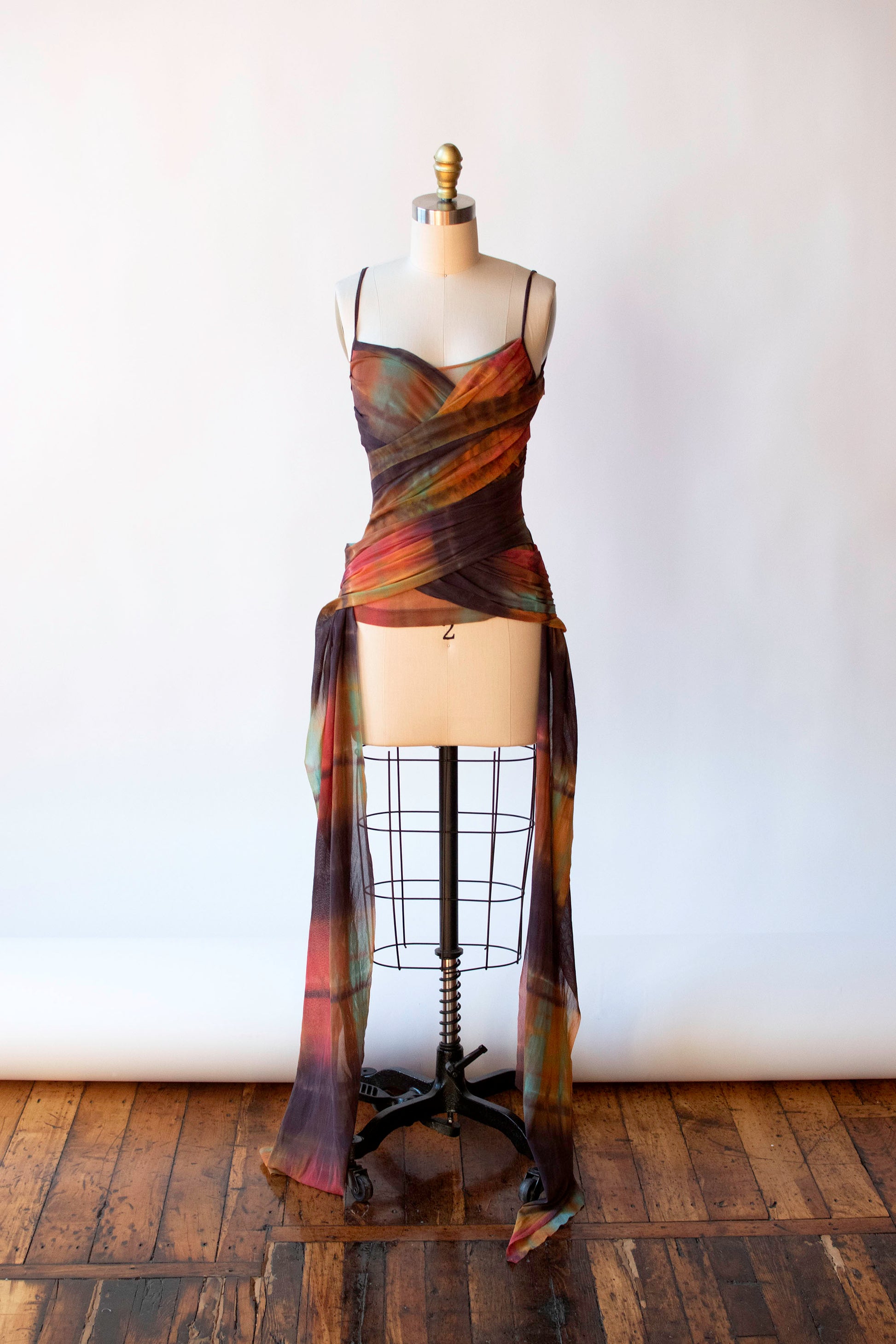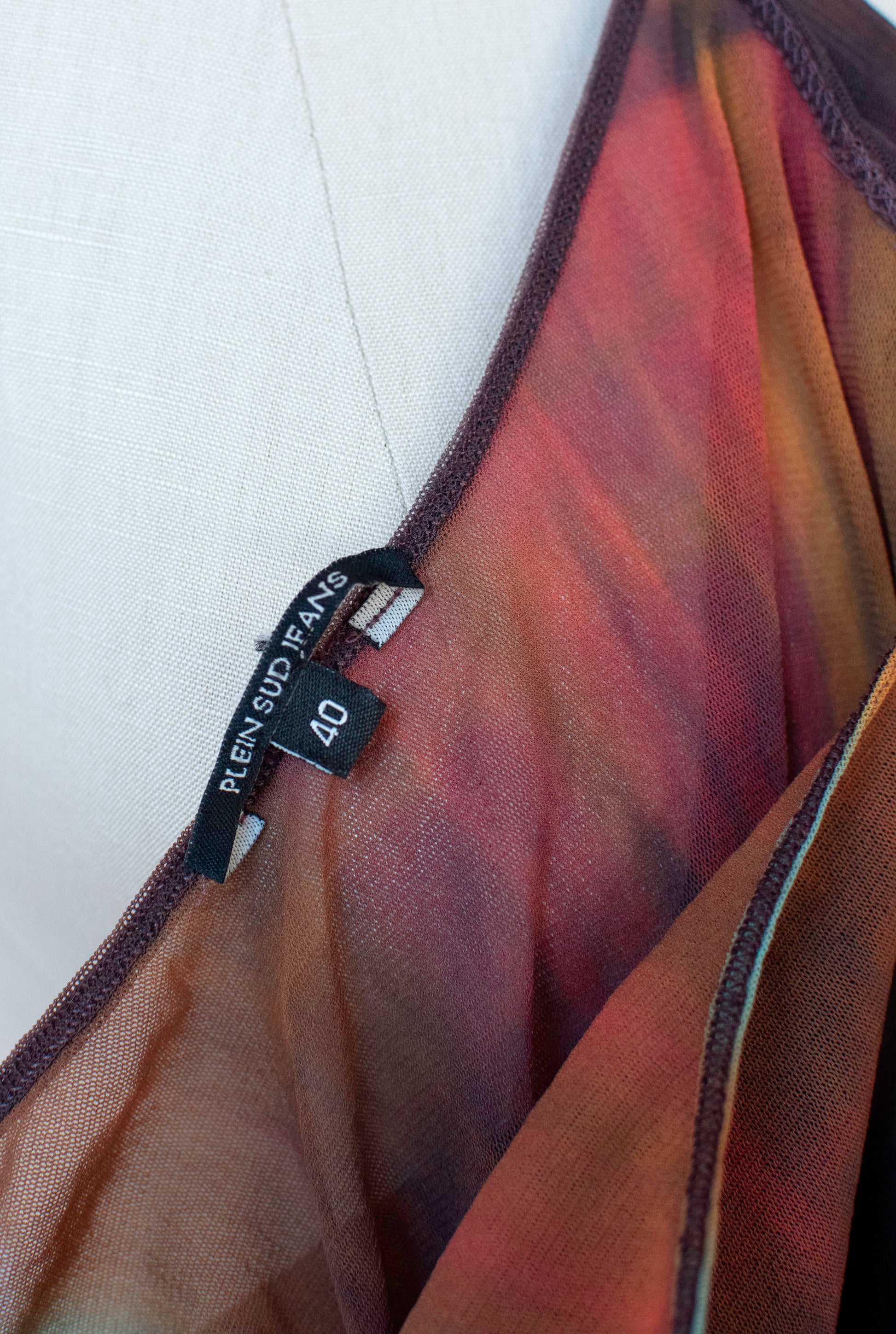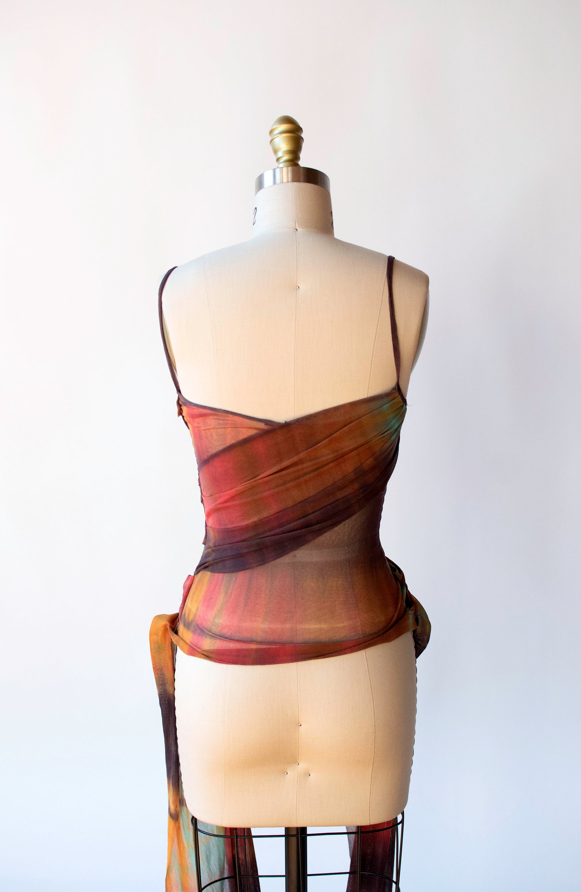 Y2K gradient earthy yet vibrant watercolor mesh tank with wrapped front and side trains by Plein Sud Jeans. Pullover style. Semi sheer at back. Fabric feels like a stretchy nylon, content labels removed.