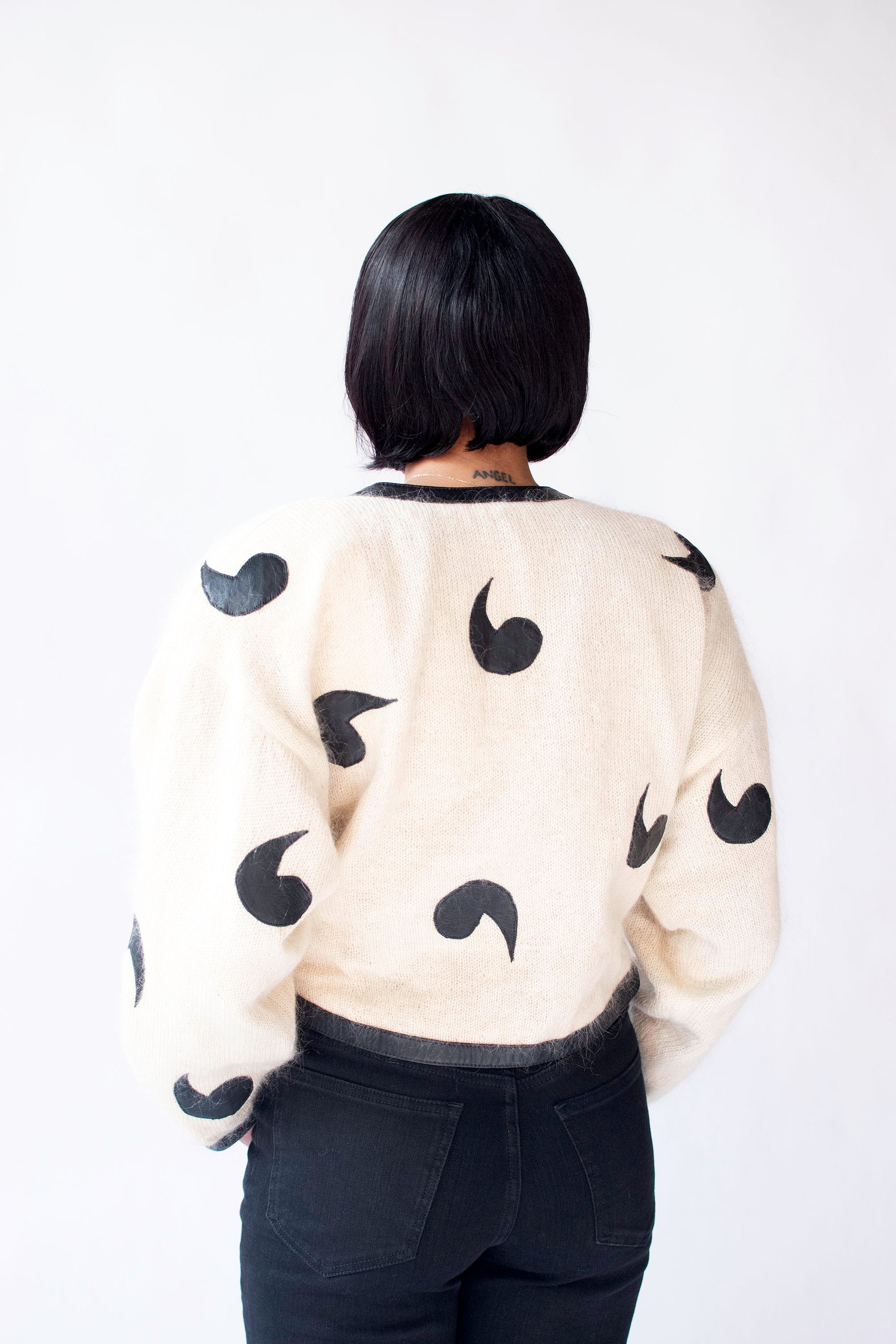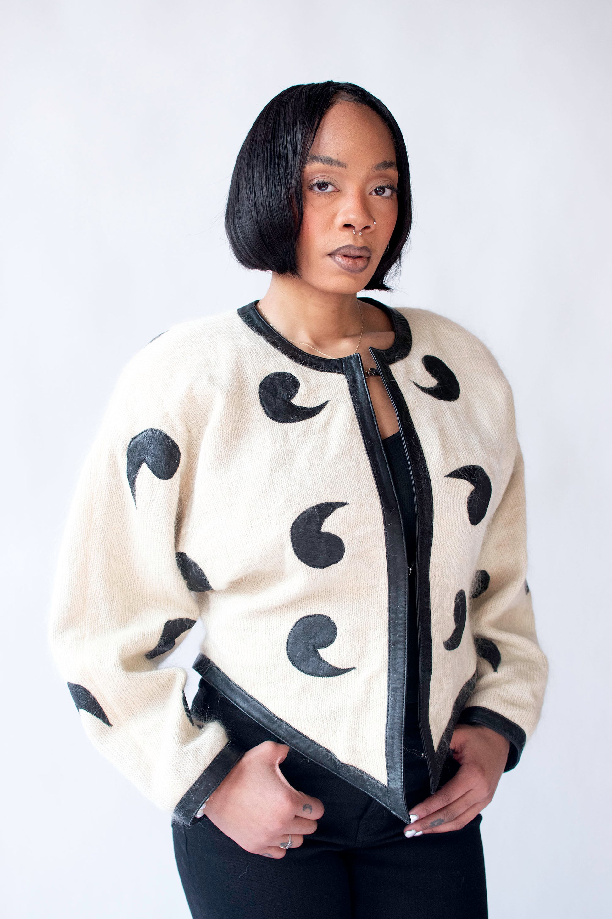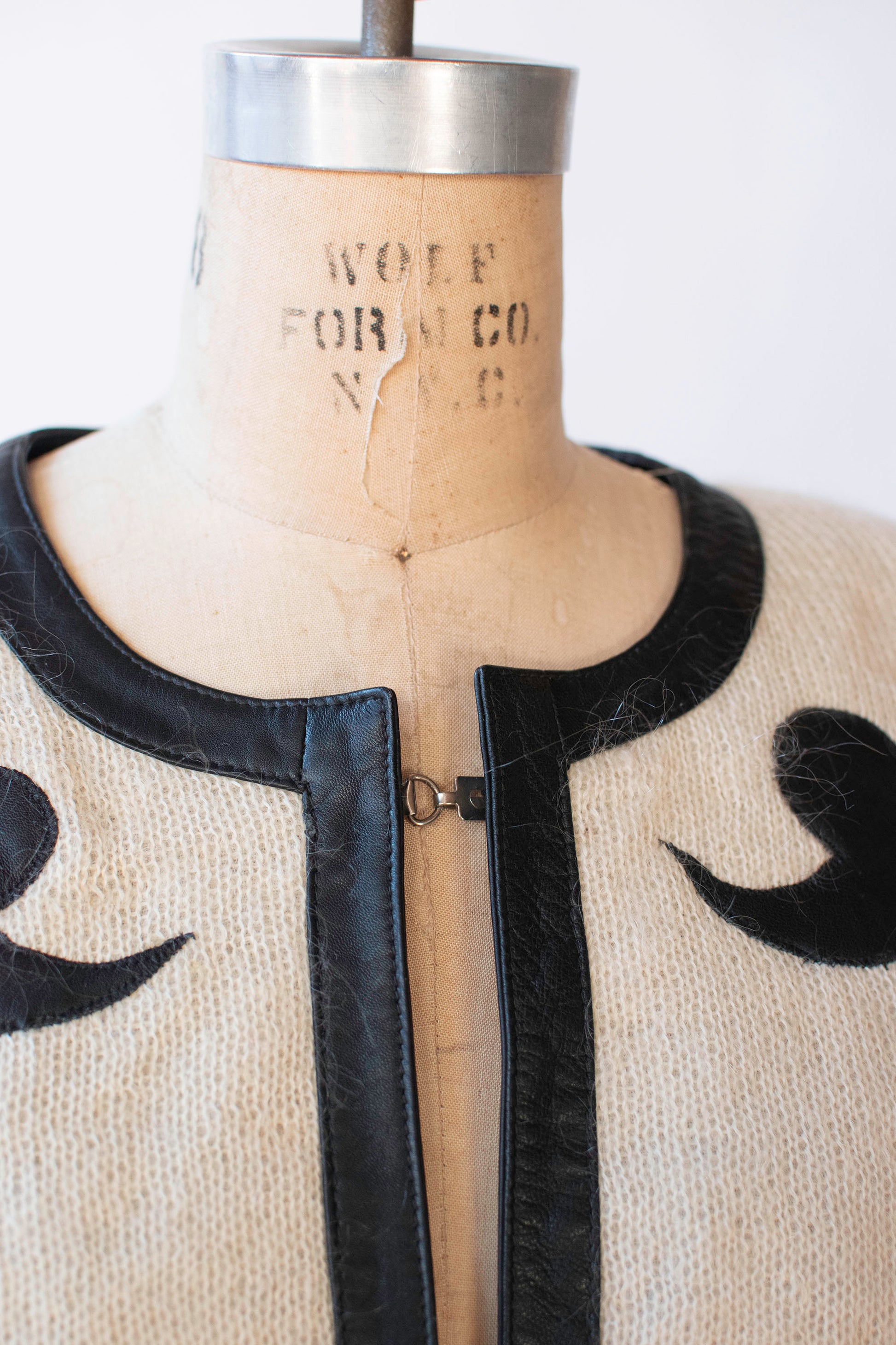 1990s Applique Jacket. Fabric content missing feels like, wool and leather with acetate lining Metal hook and eye closures at front. Padded shoulders.
