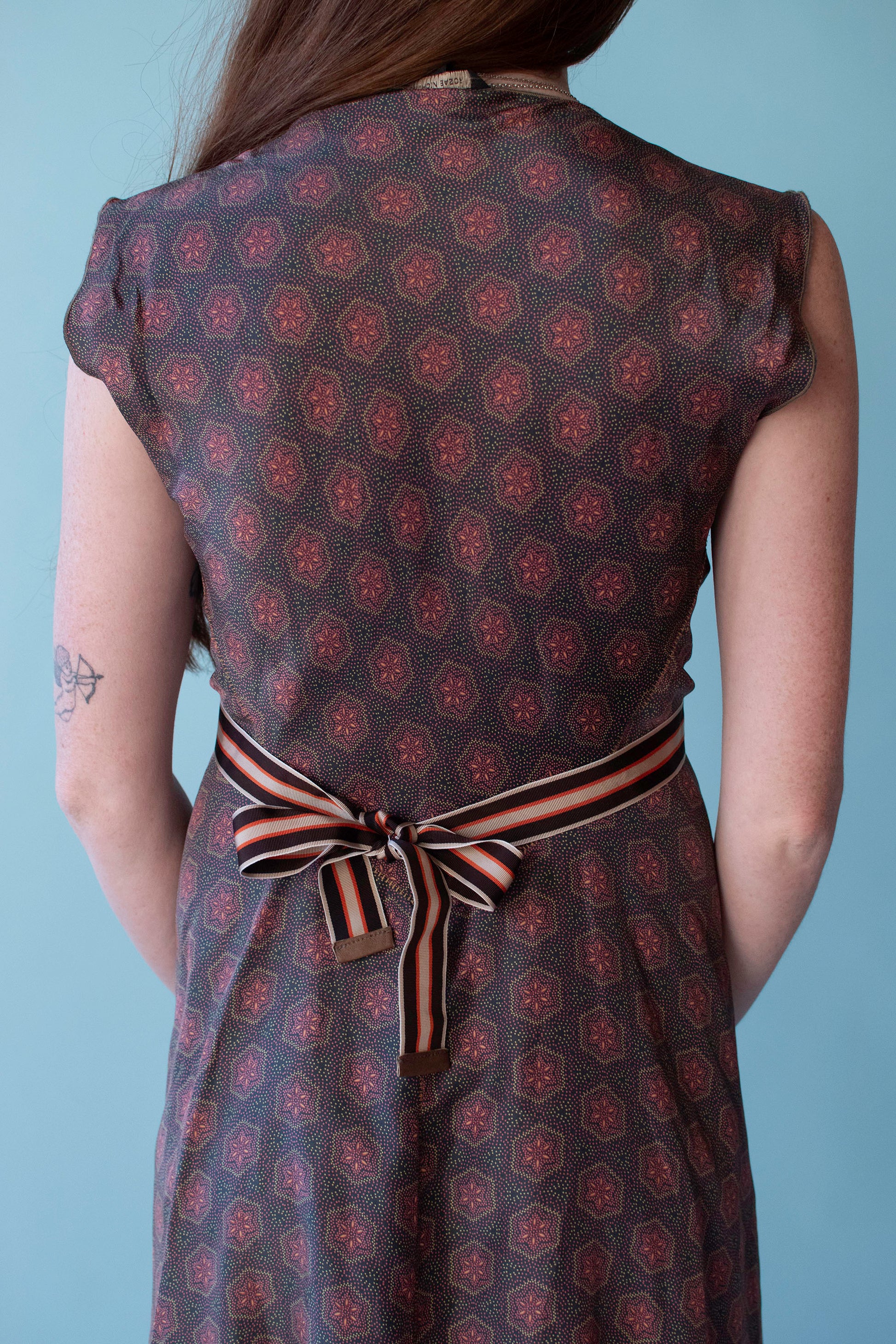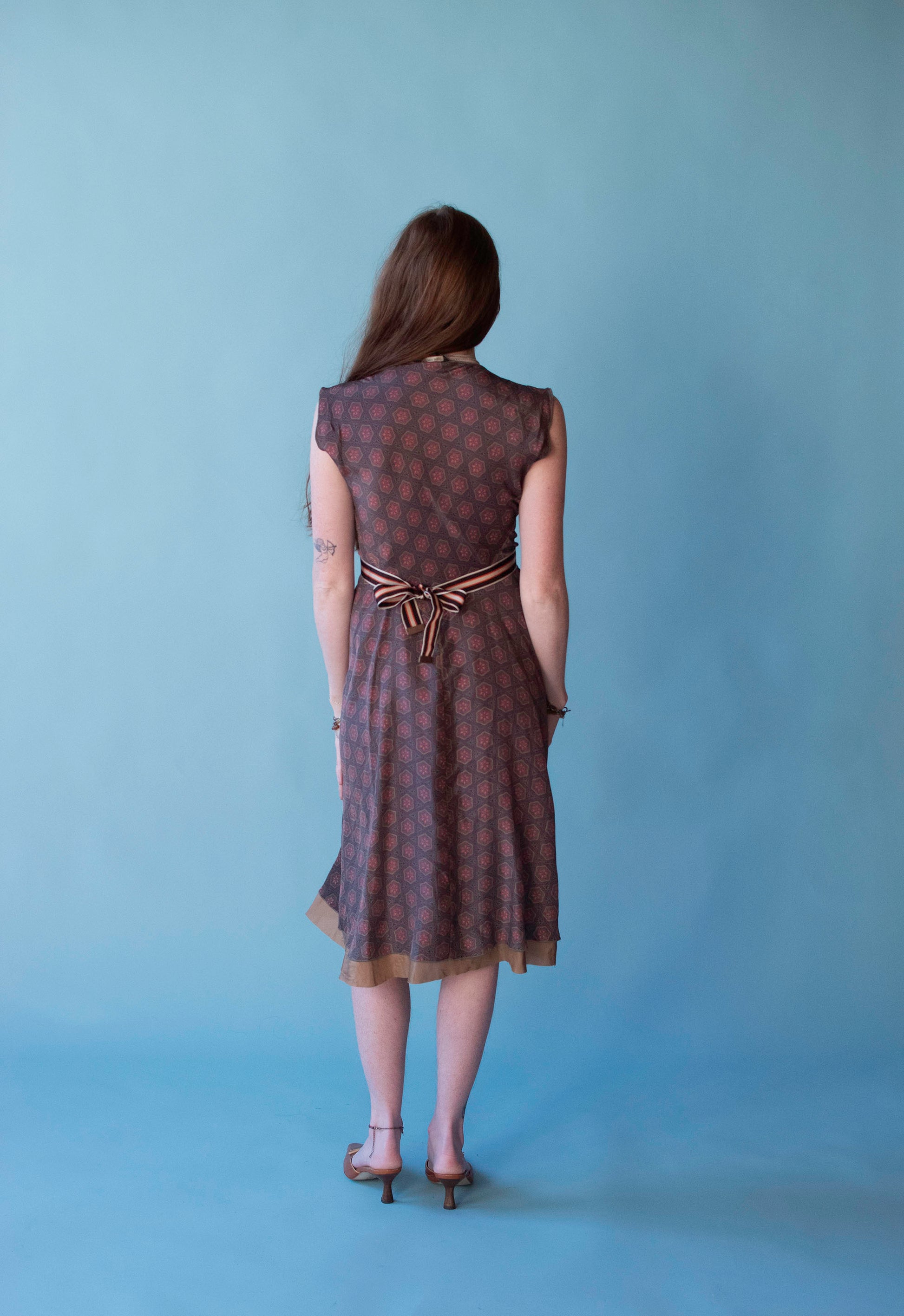 Y2K printed silk dress with hand sewn accents by Rozae Nochols. Attached grosgrain waist ties. 100% silk. Pullover style with no closures.