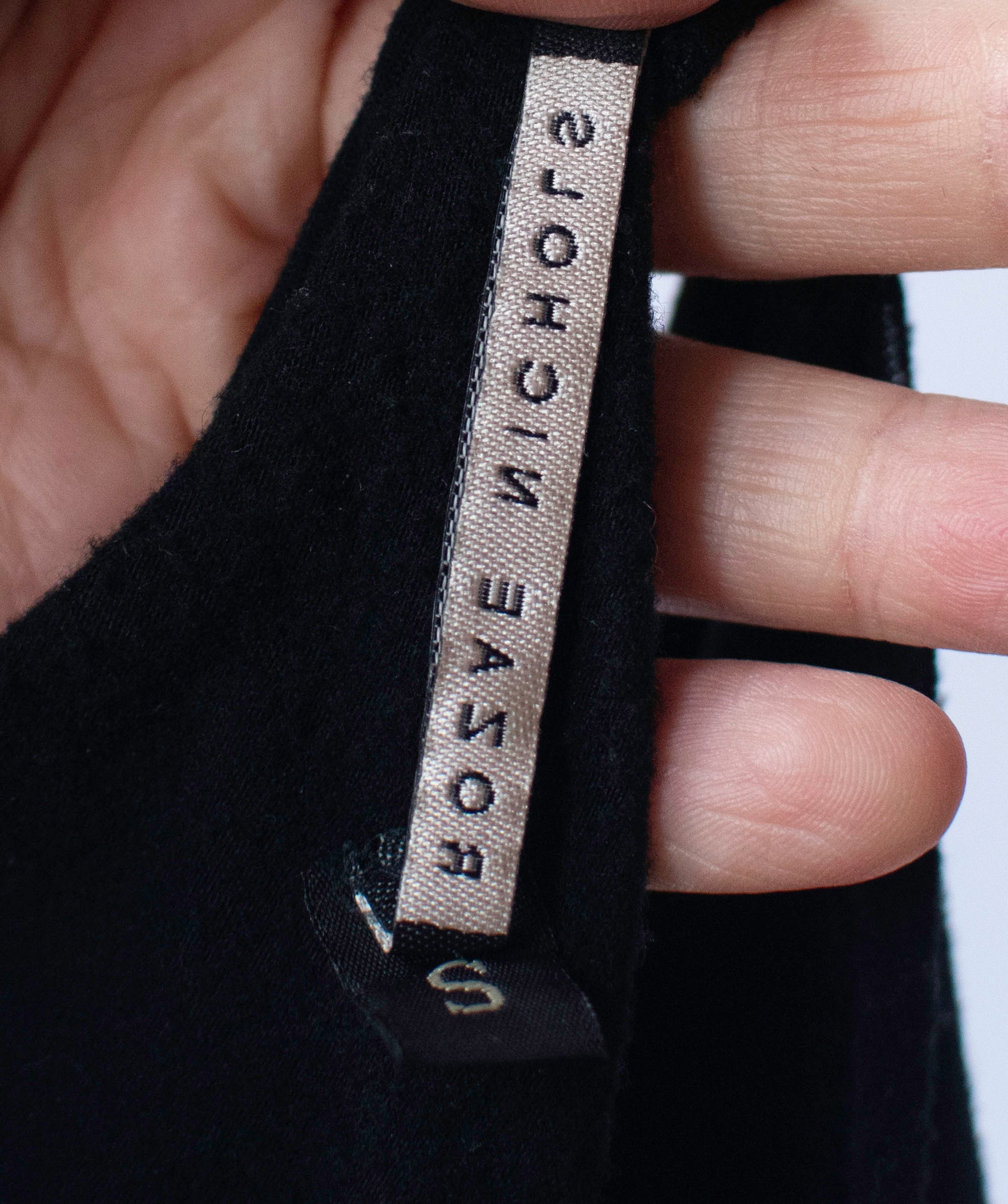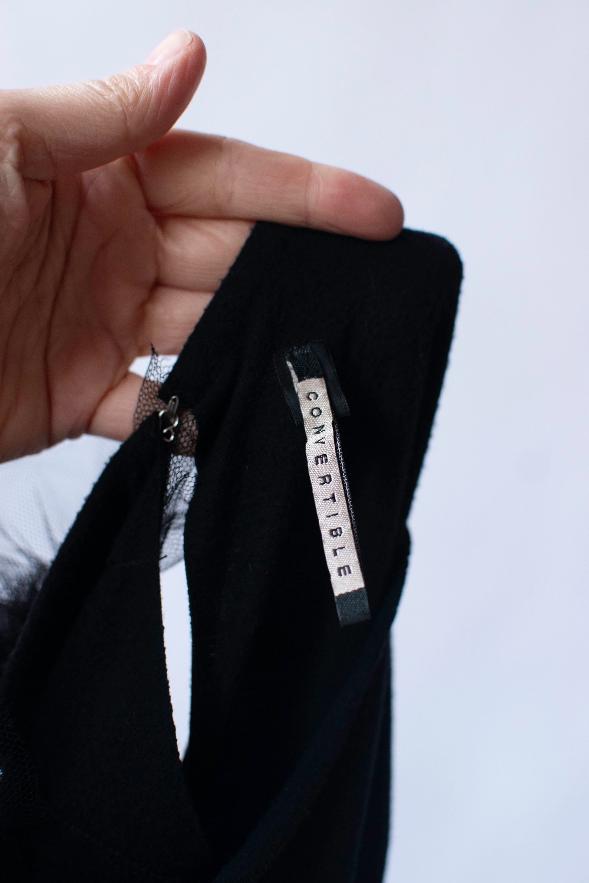 Black dress with ruffled trim detail by Rozae Nichols. Labeled "convertible" elastic patches with gathering at the hips that can be pulled up to wear as a shorter dress. Pullover style, with hook and eye closure at back of collar. Jersey fabric with a fuzzy "pilly" flannel feel on the inside. 60% polyester 33% viscose 7% elastane contrasts: Silk, cotton and polyester cotton mesh and chiffon ruffles.
