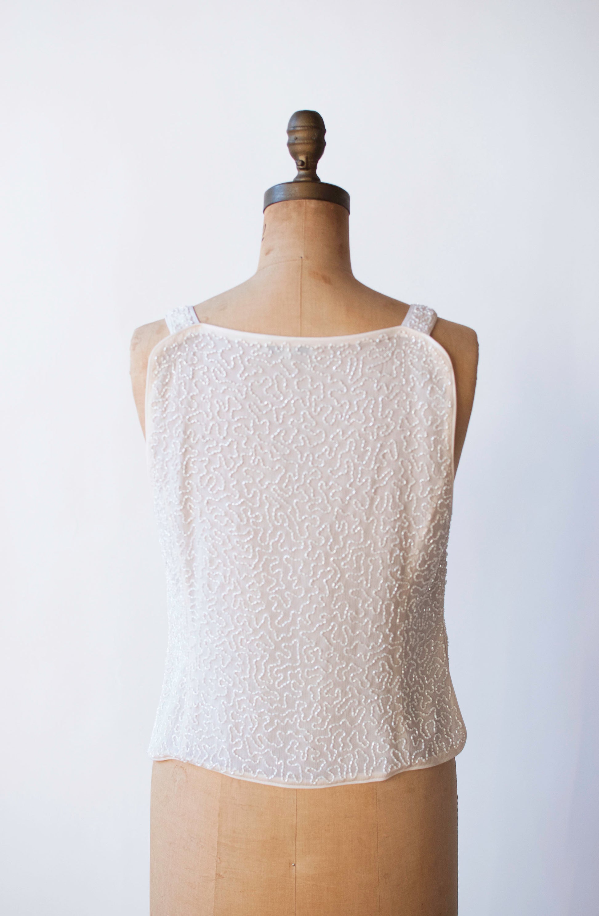 1990s Beaded white shell by Giorgio Armani. Self fabric buttons down front. Wide straps. Side slits. 67% silk and 33% acetate outer with polyester lining.