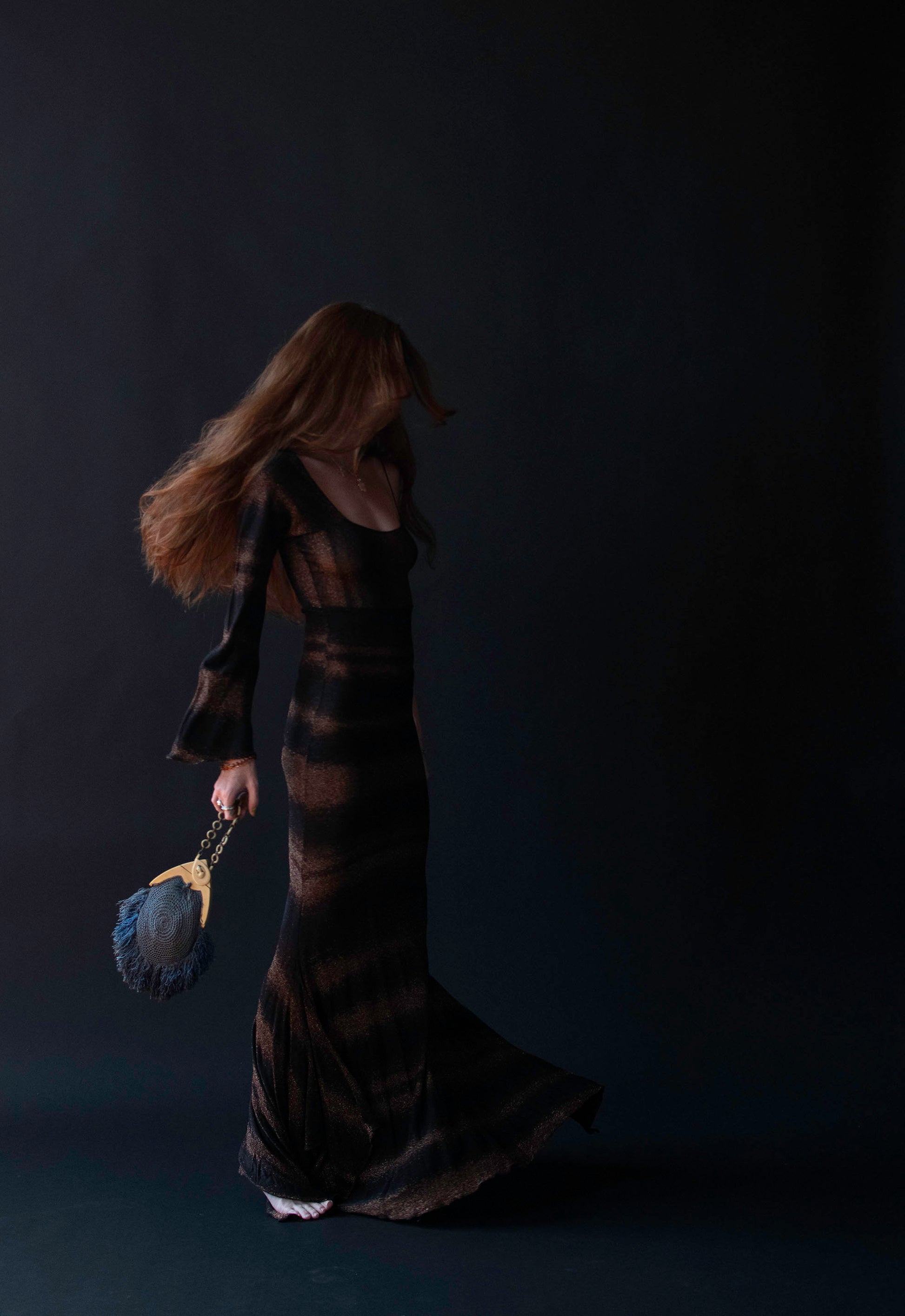 Y2K sheer black knit and sparkly copper lurex one sleeve dress by Roman Keflay. Fitted throughout with slits at sides of skirt. Pullover style.