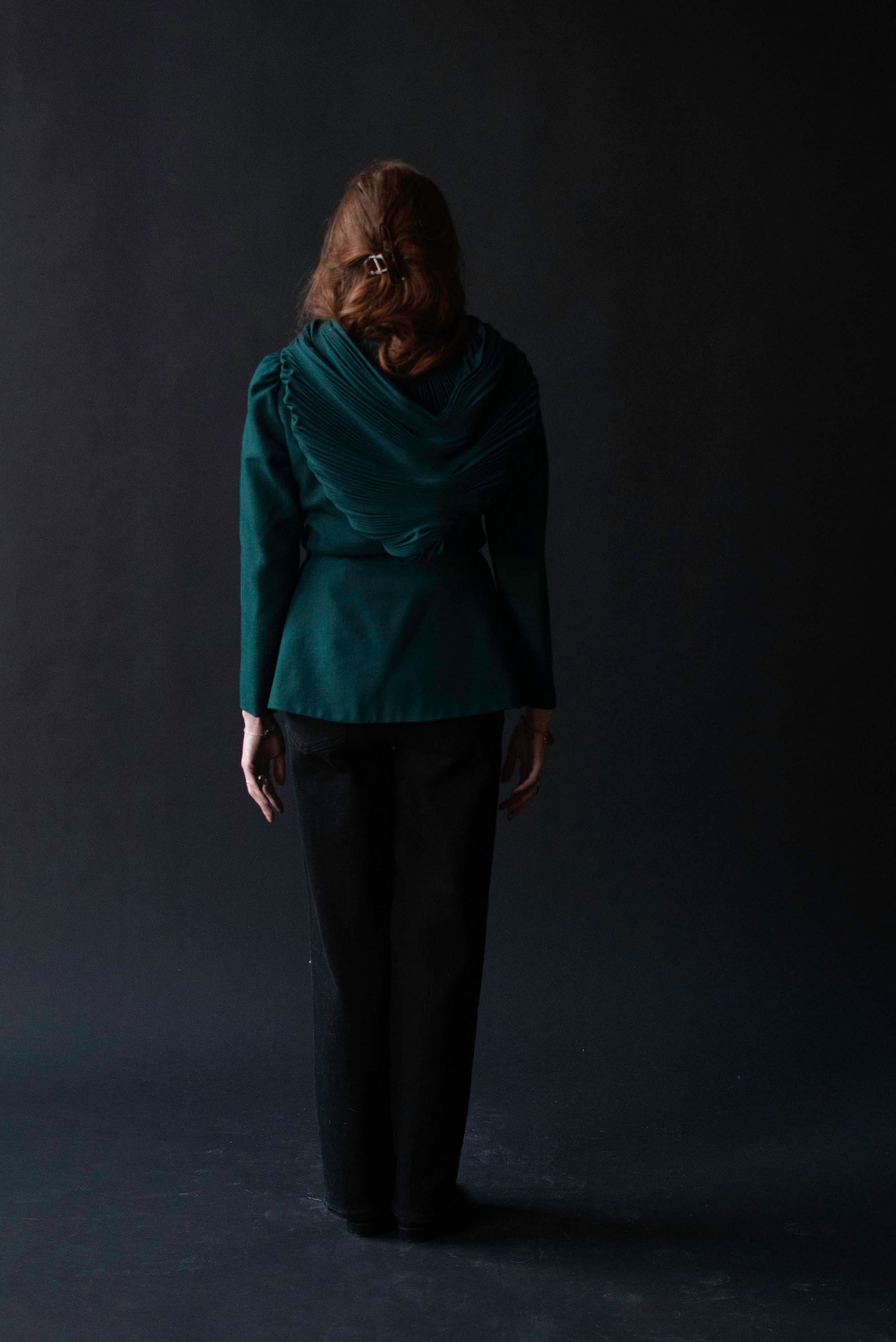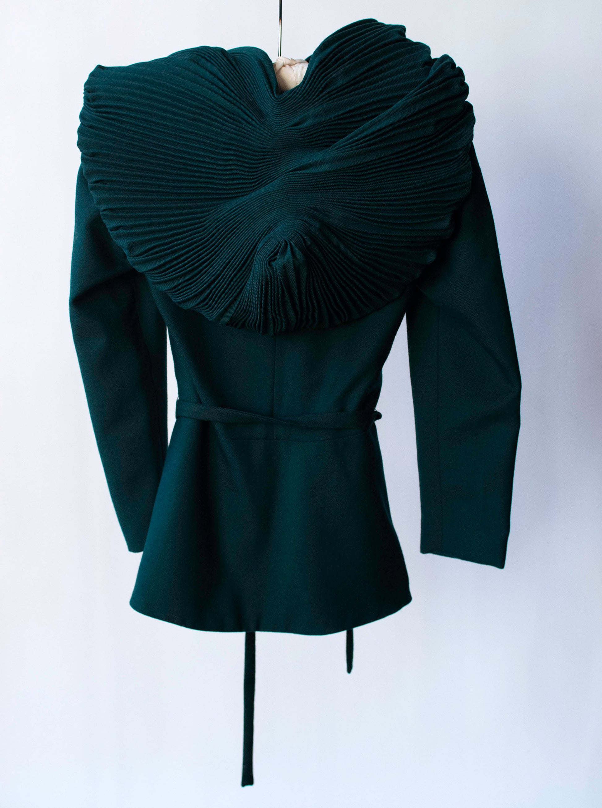 1970s dramatic dark green jacket with a huge pleated hood by Thea Porter. Fitted throhgout with slight puff gathered shoulders and a self fabric belt. Fabric feels like wool with rayon lining. Fastens with hook and eye closures.