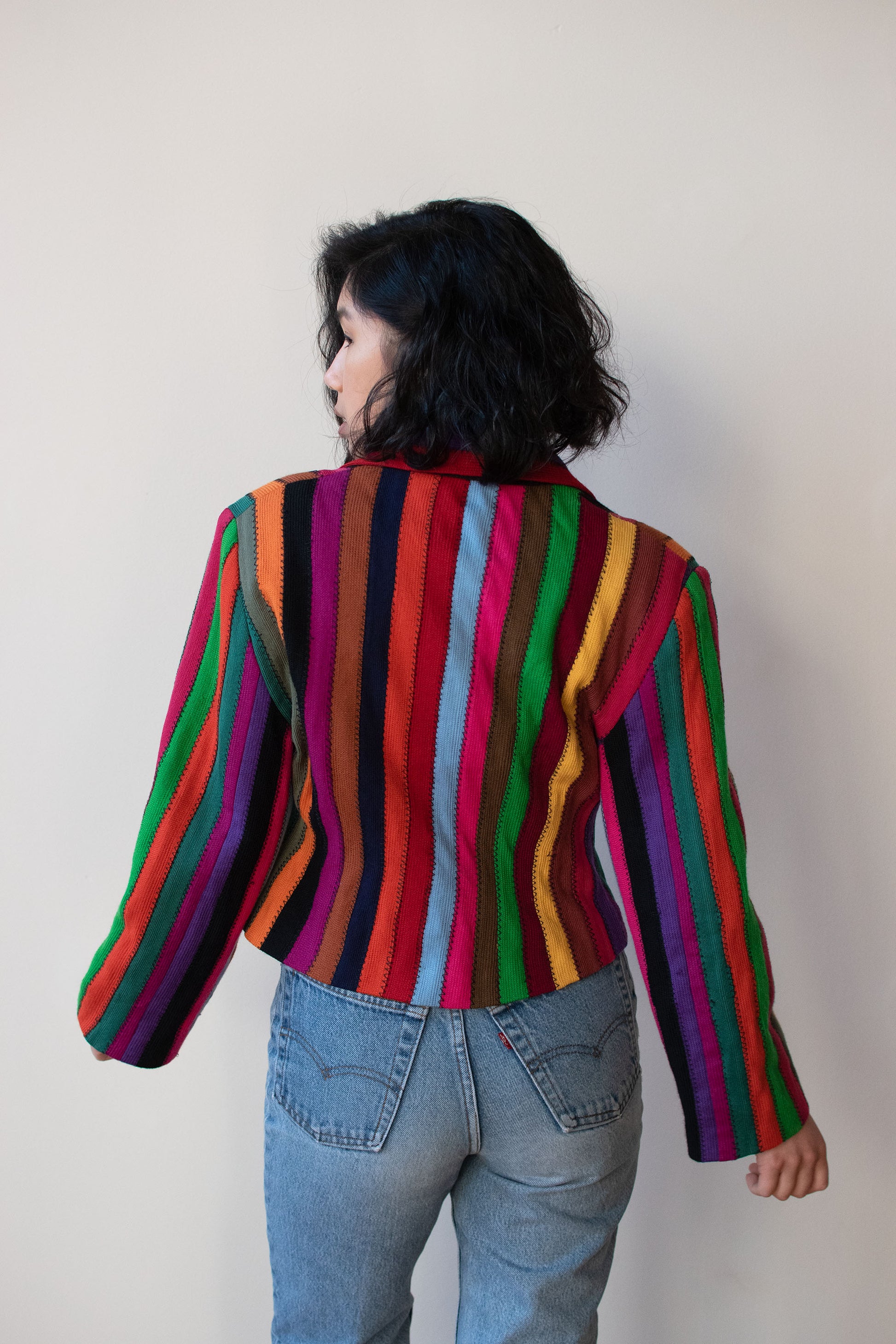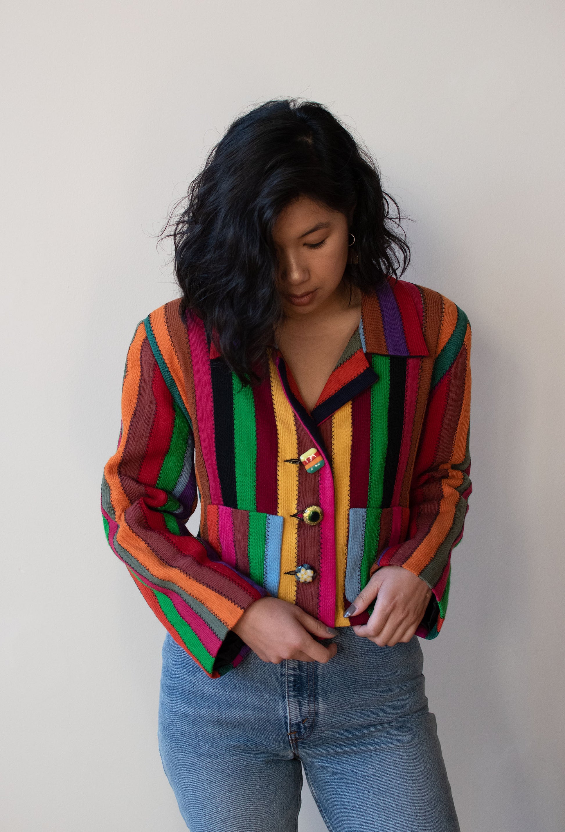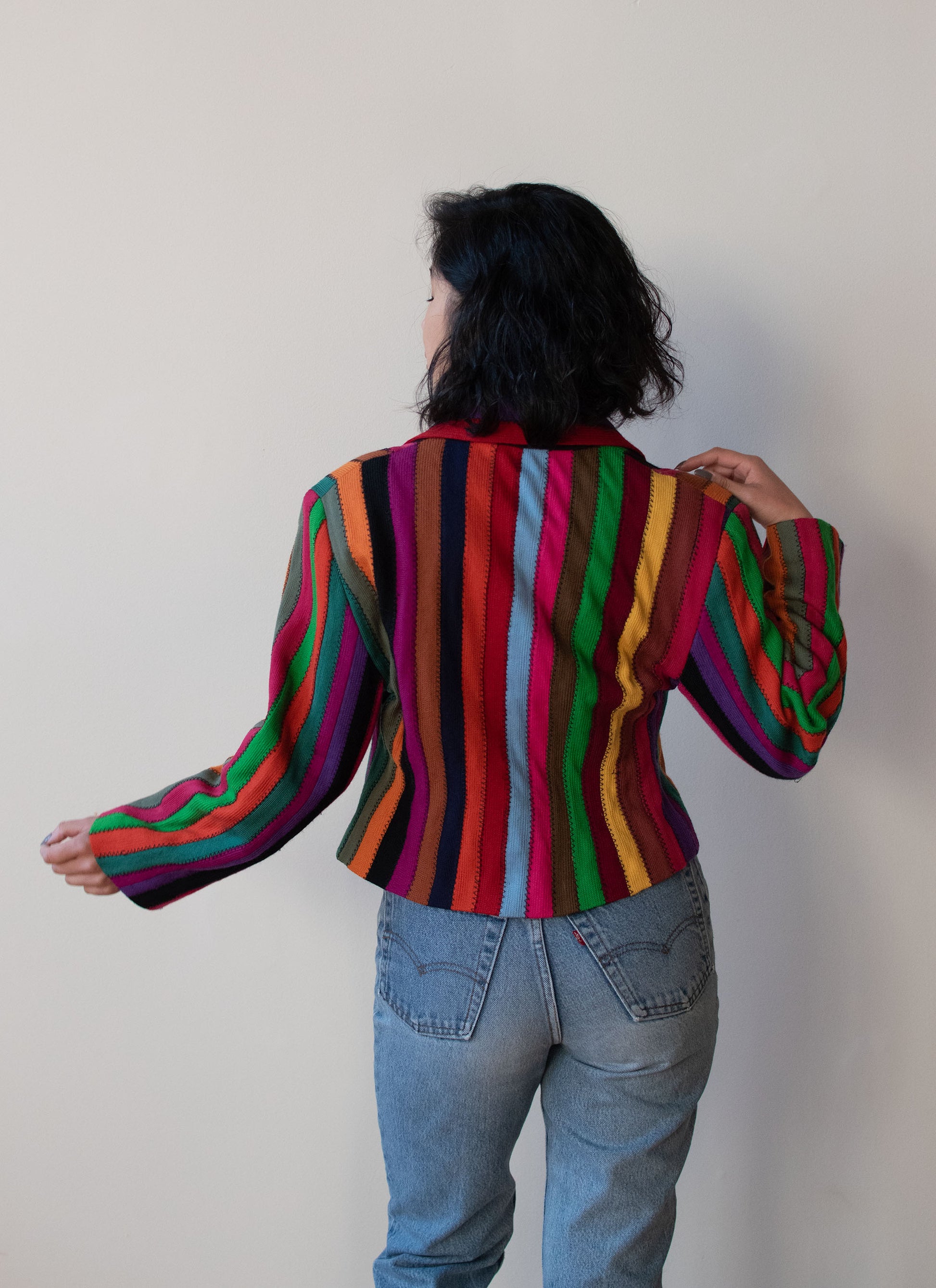 1990s rainbow stripe blazer with Glass buttons by Todd Oldham. Padded shoulders. Patch pockets. Wool with black acetate lining.