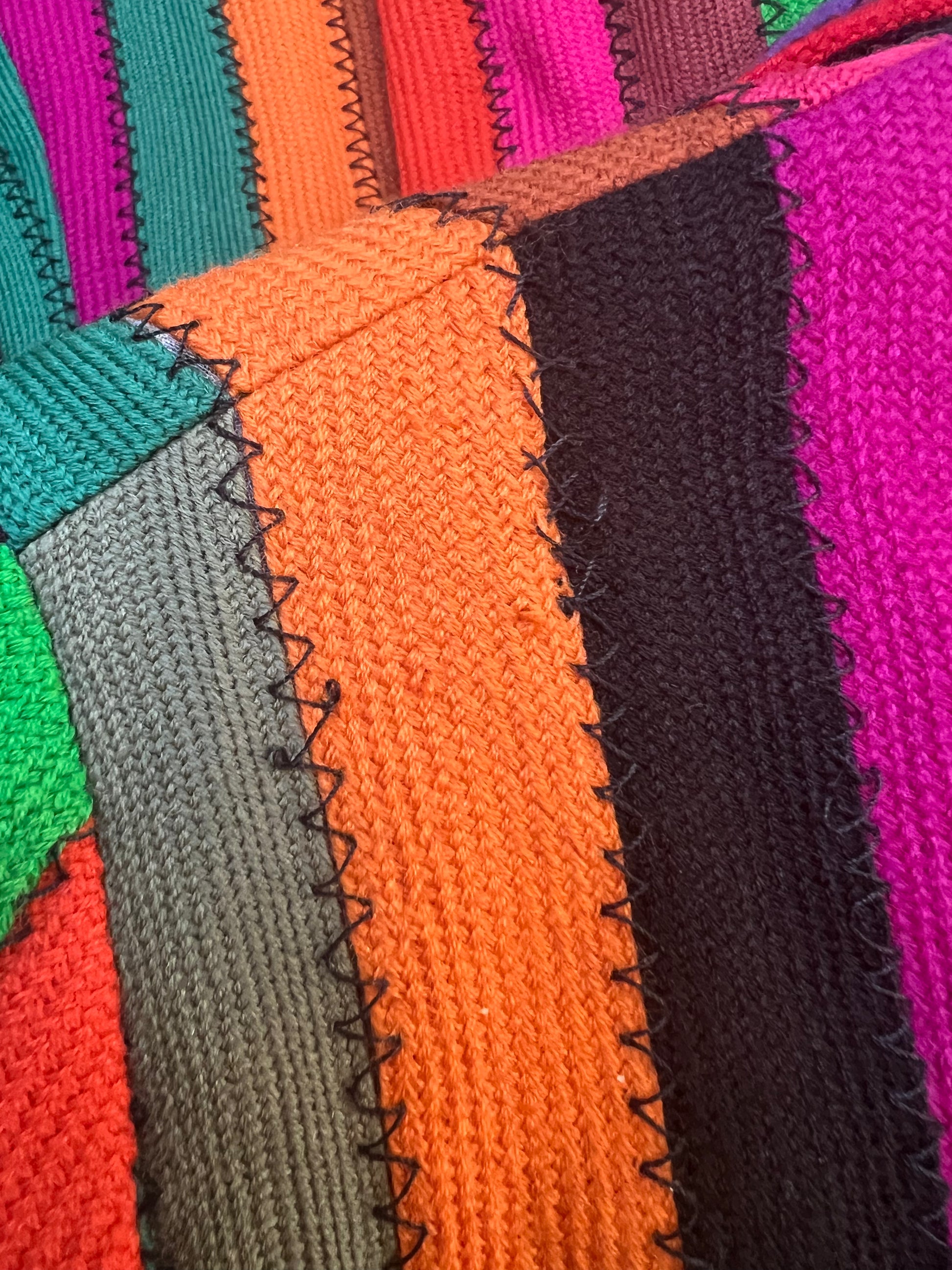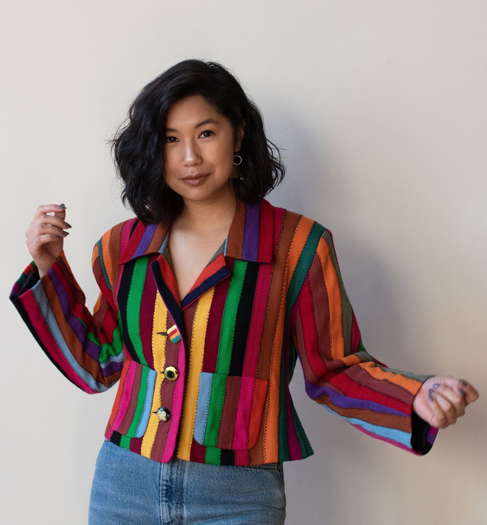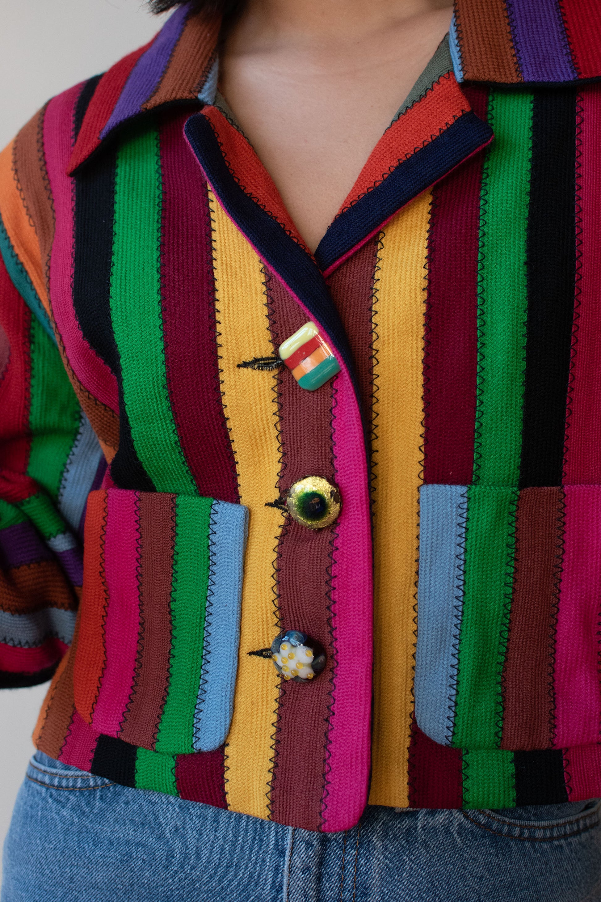 1990s rainbow stripe blazer with Glass buttons by Todd Oldham. Padded shoulders. Patch pockets. Wool with black acetate lining.