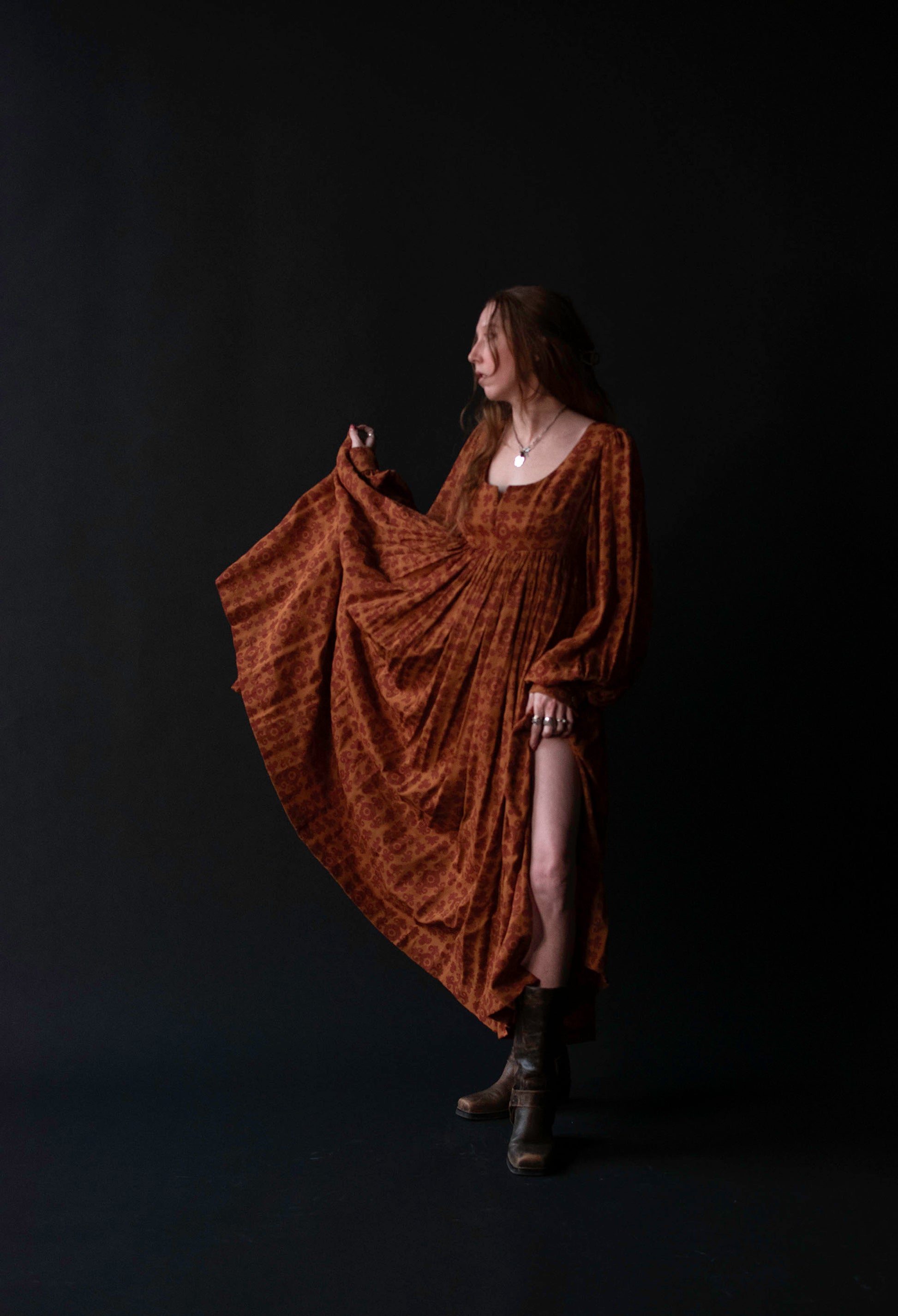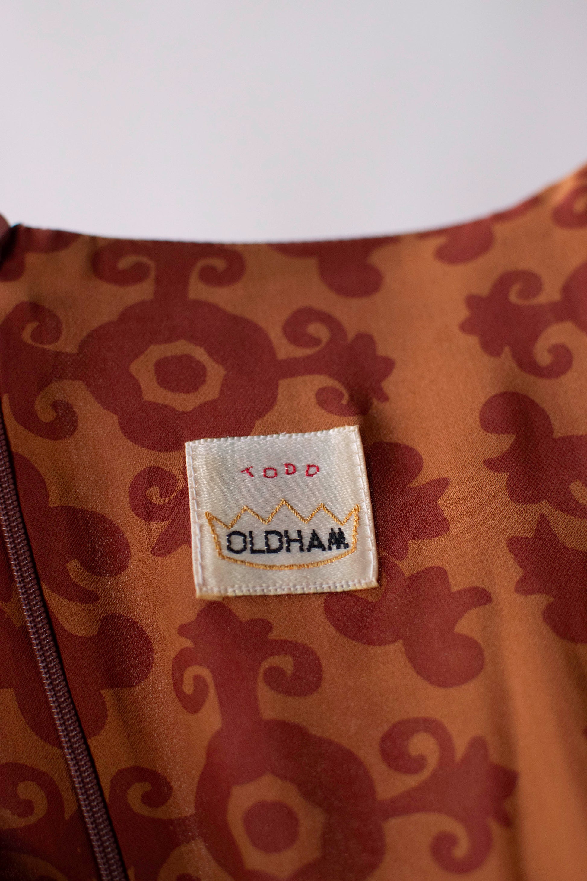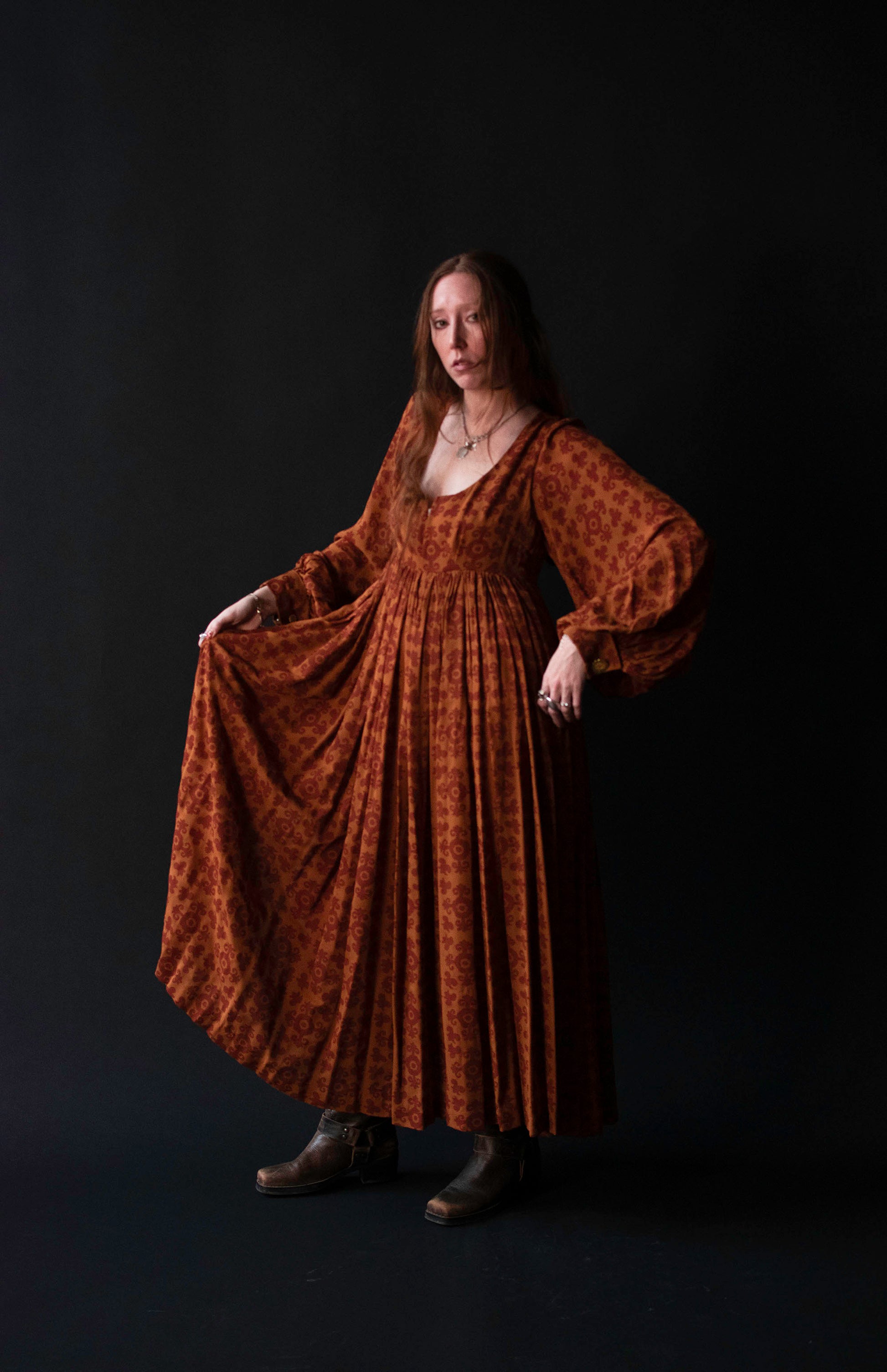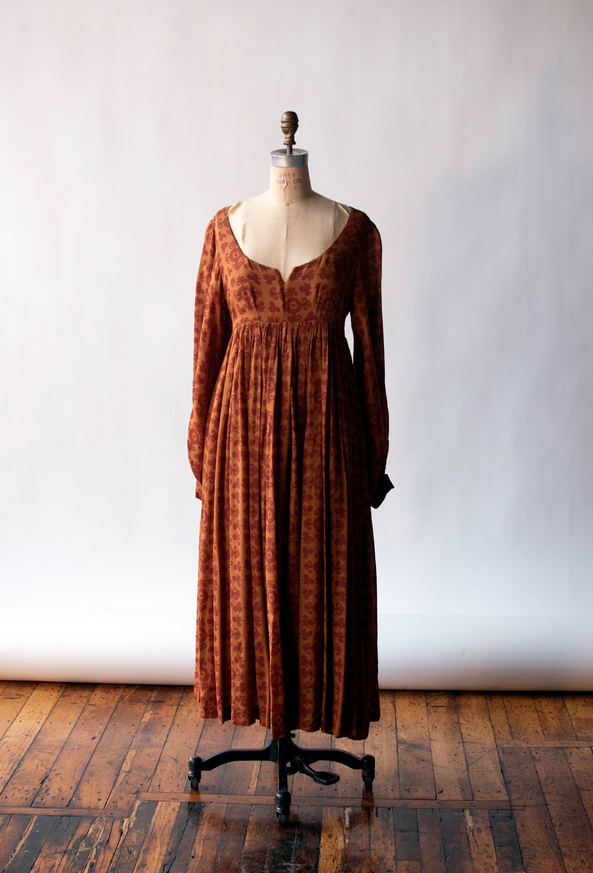 Autumnal medallion print dress by Todd Oldham from his FW 1993 runway collection. Empire bodice with a boned notch neckline and bust darts. Billowy bishop sleeves with french cuffs accented by bespoke gold tone metal buttons. Full gathered skirt with side slits. Fastens with a concealed plastic back zipper. 100% Silk.