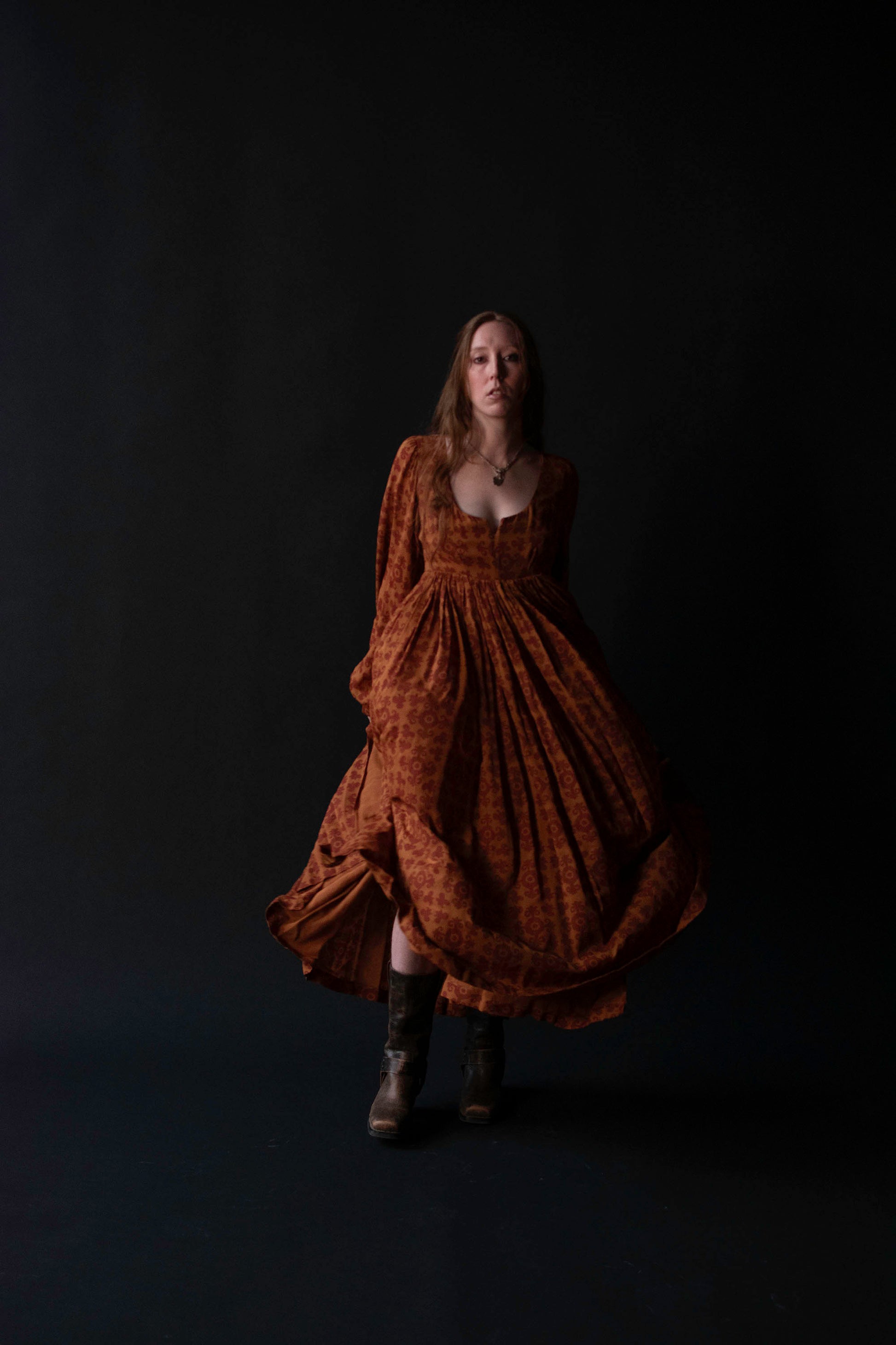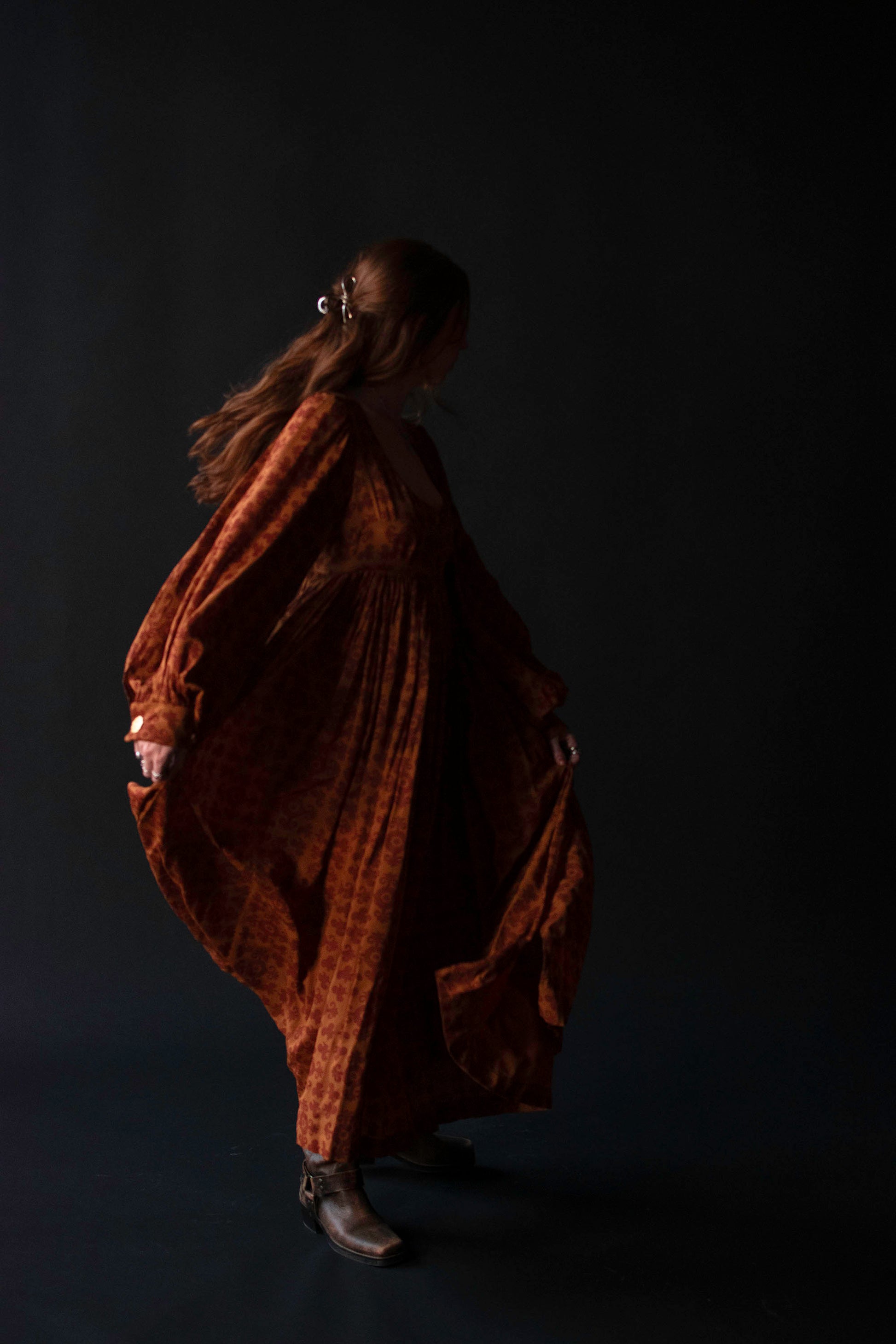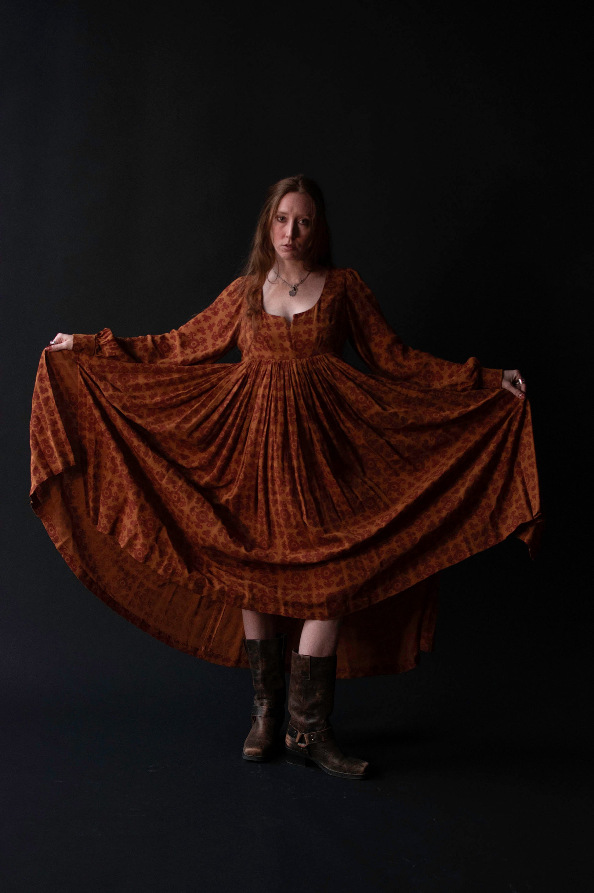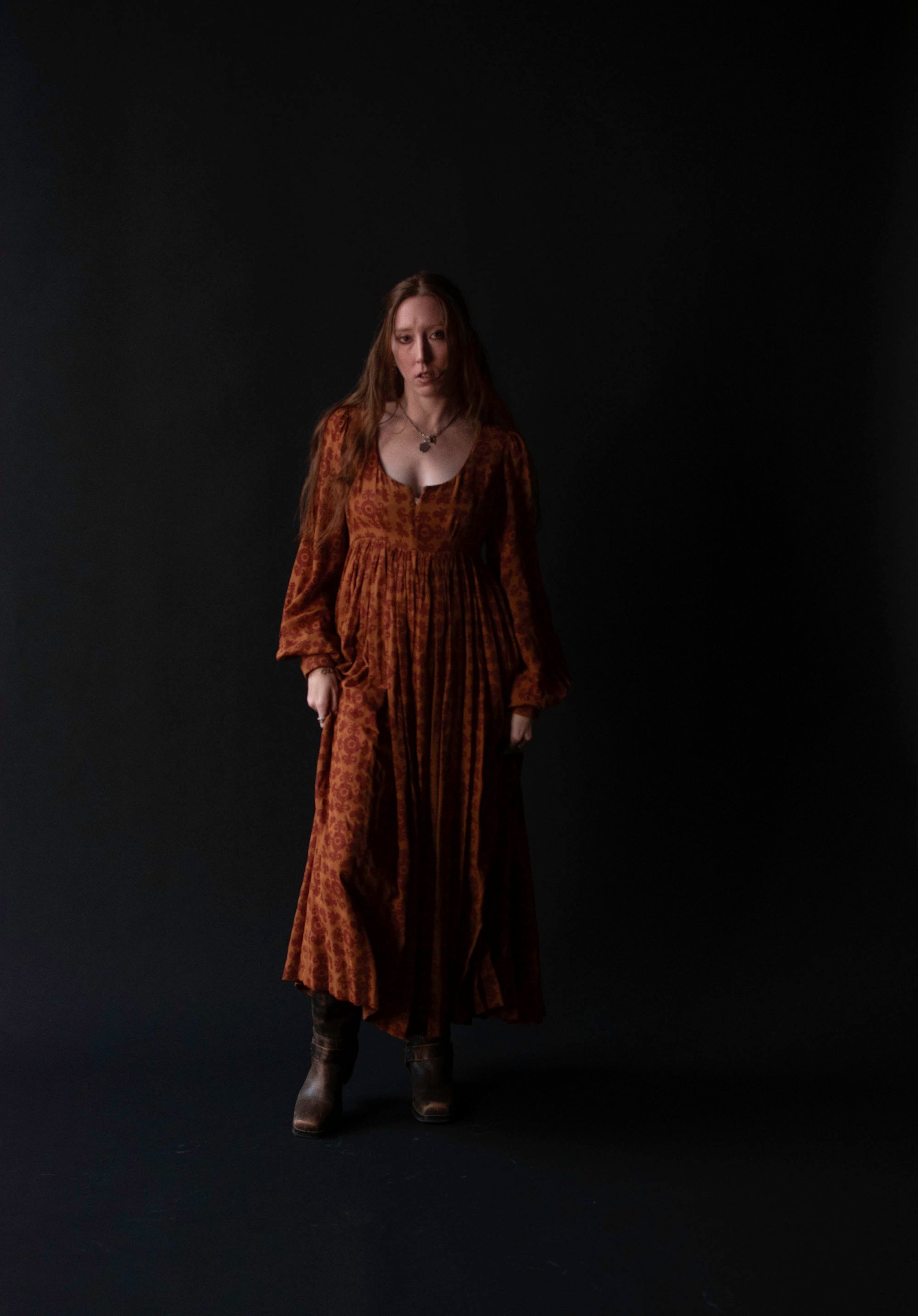 Autumnal medallion print dress by Todd Oldham from his FW 1993 runway collection. Empire bodice with a boned notch neckline and bust darts. Billowy bishop sleeves with french cuffs accented by bespoke gold tone metal buttons. Full gathered skirt with side slits. Fastens with a concealed plastic back zipper. 100% Silk.