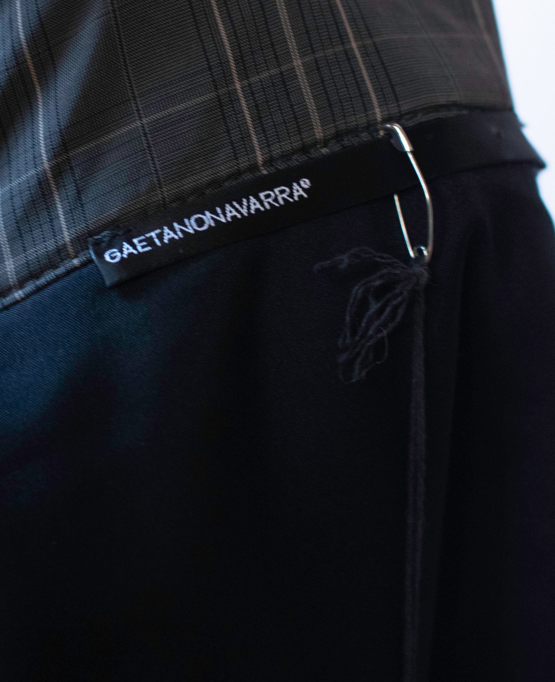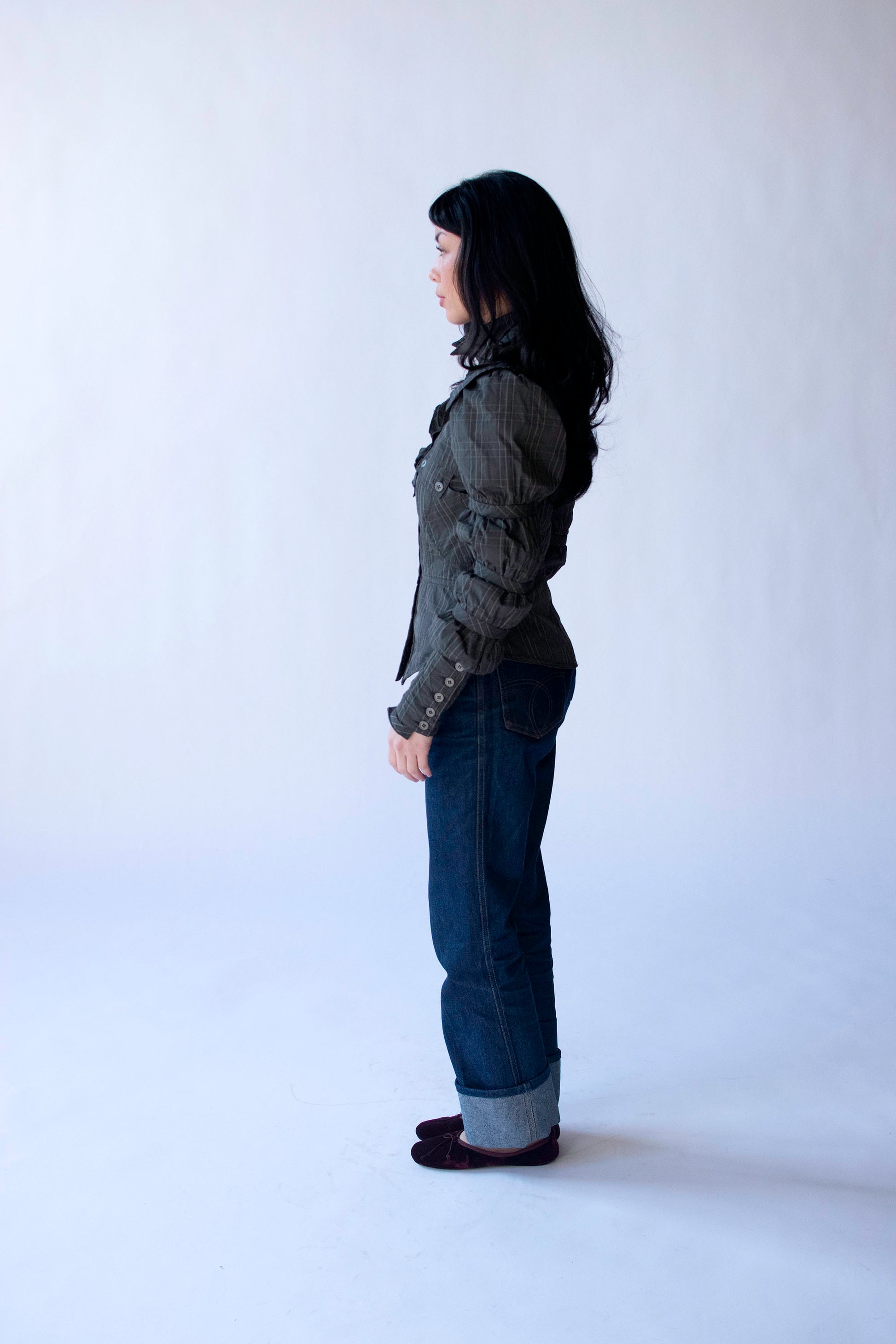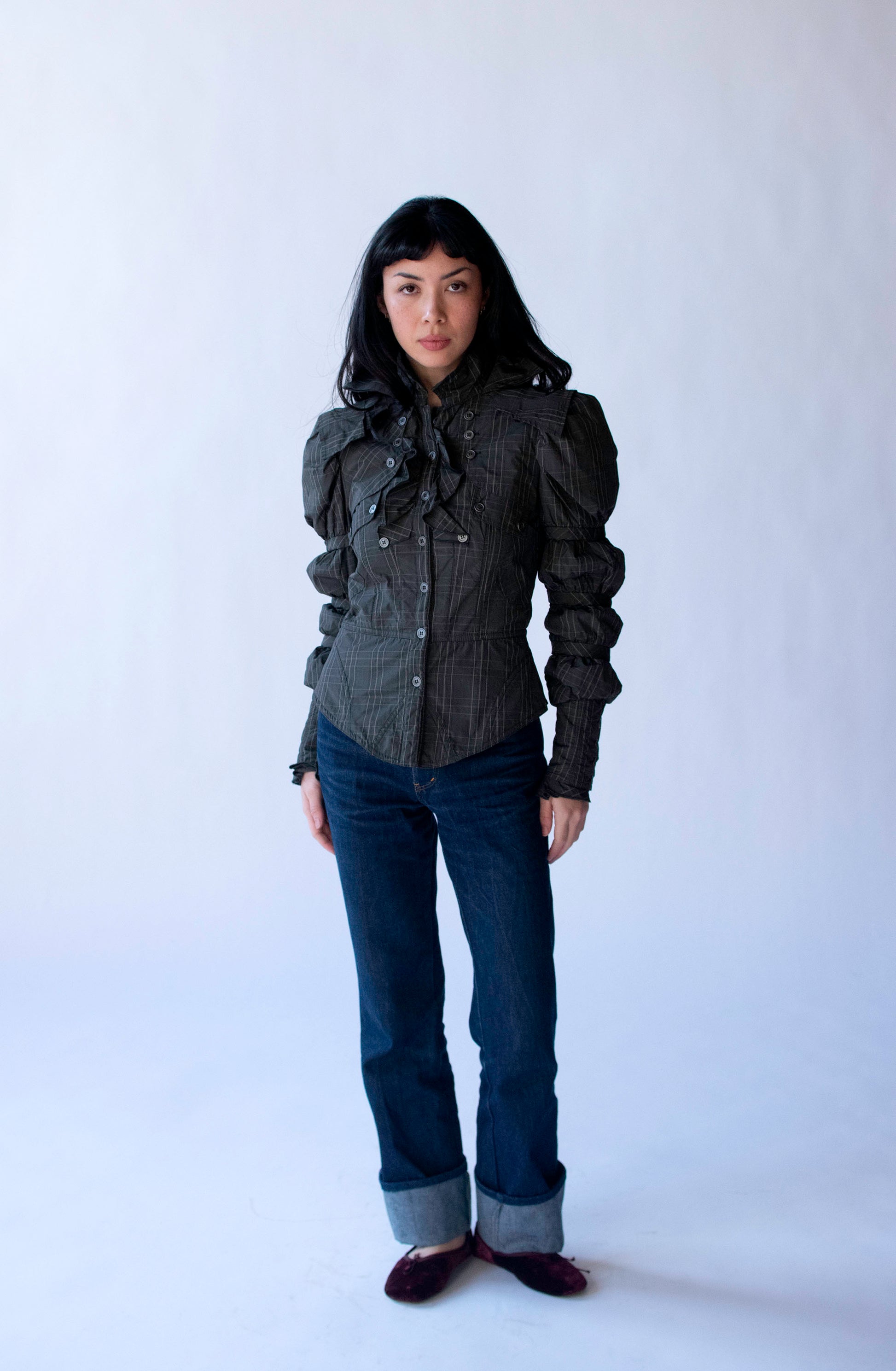 Gaetano Navarra Victorian inspired puffer blouse. Double collar, banded sleeves with puff shoulders. Front pockets. Buttons at front and at cuffs. Slate gray pinstripe plaid. Polyester with nylon padding.