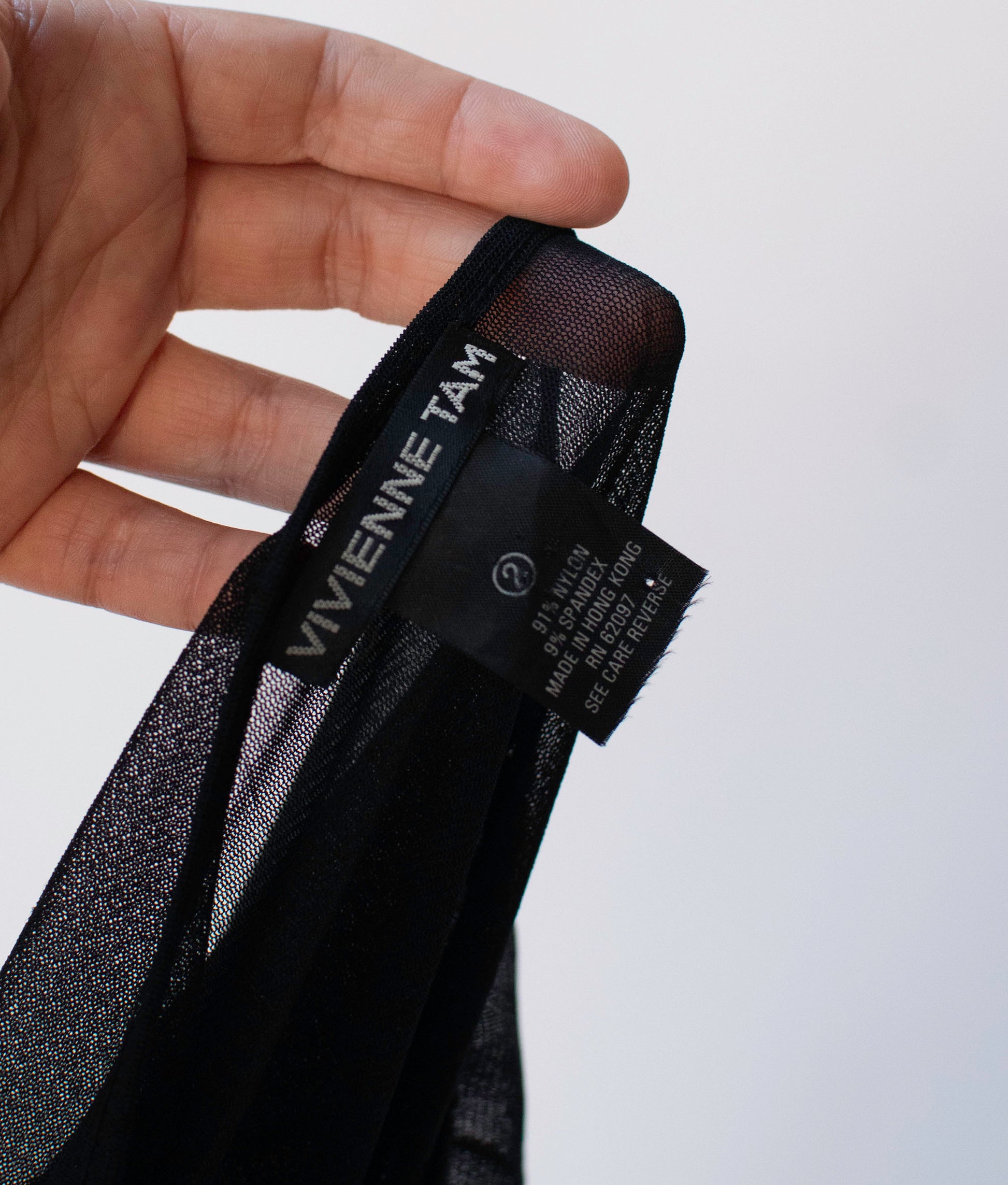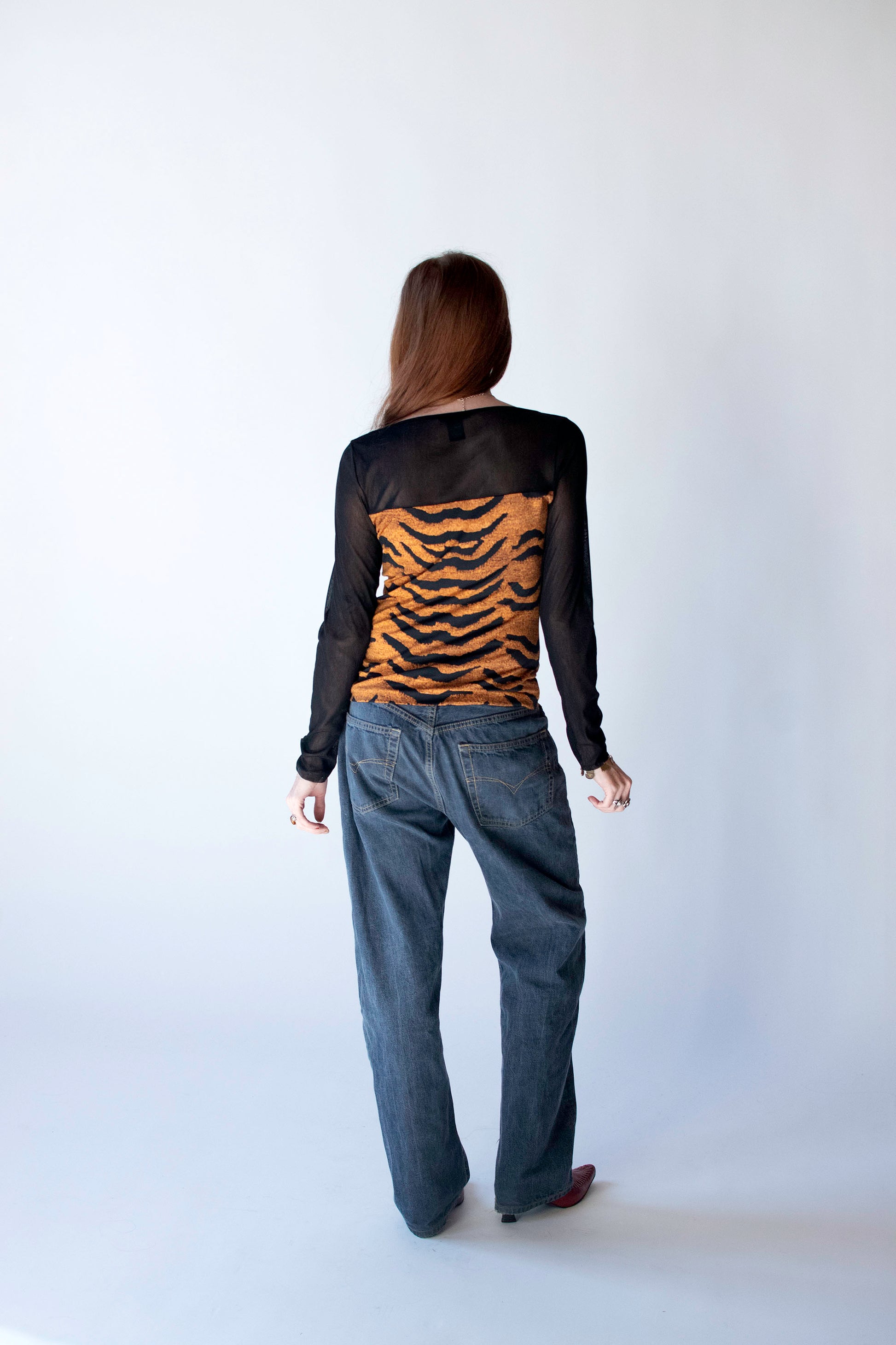 1990s tiger print long sleeve top by Vivienne Tam. Mesh black upper with solid print. Pullover style. 91% nylon 9% spandex.