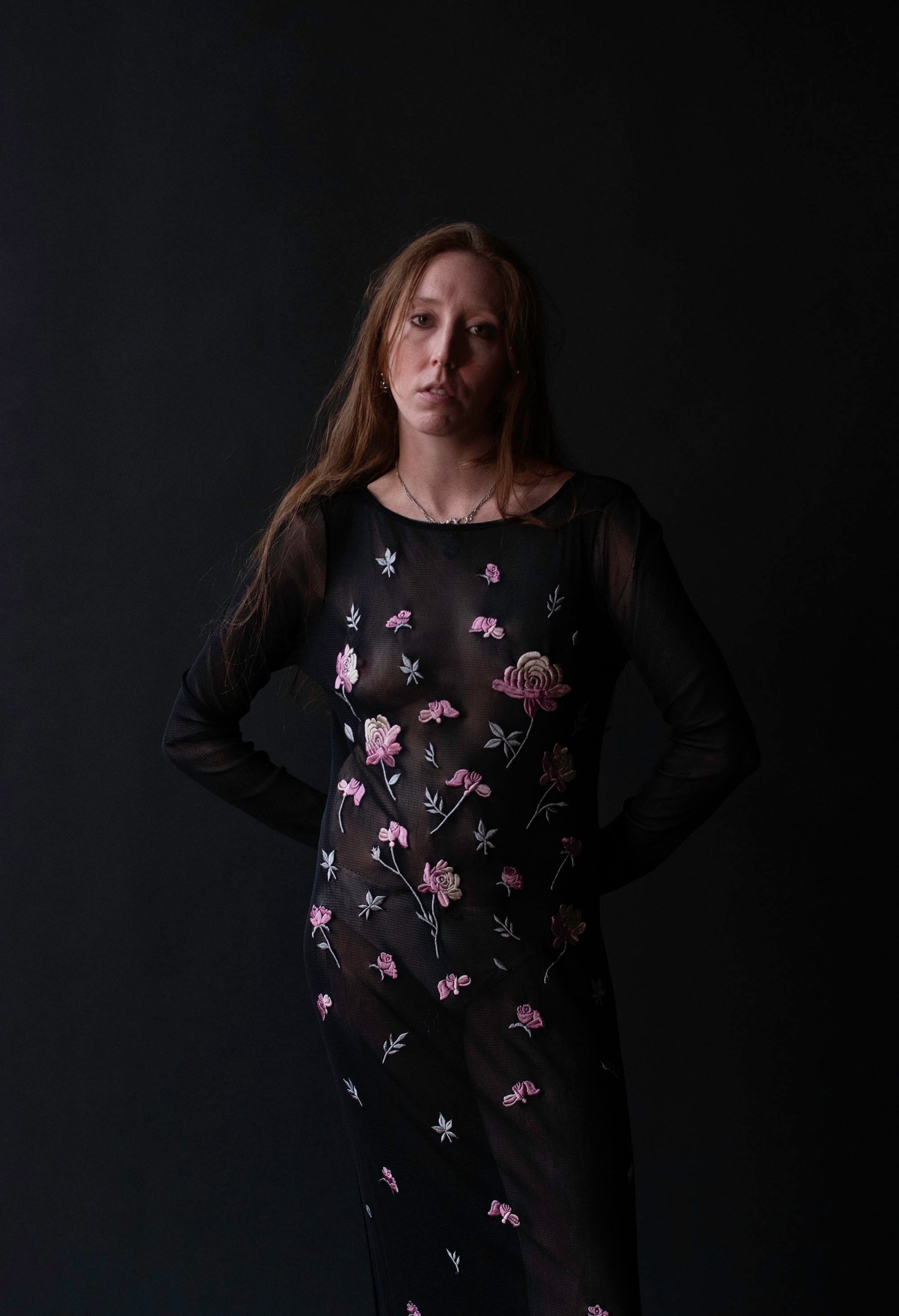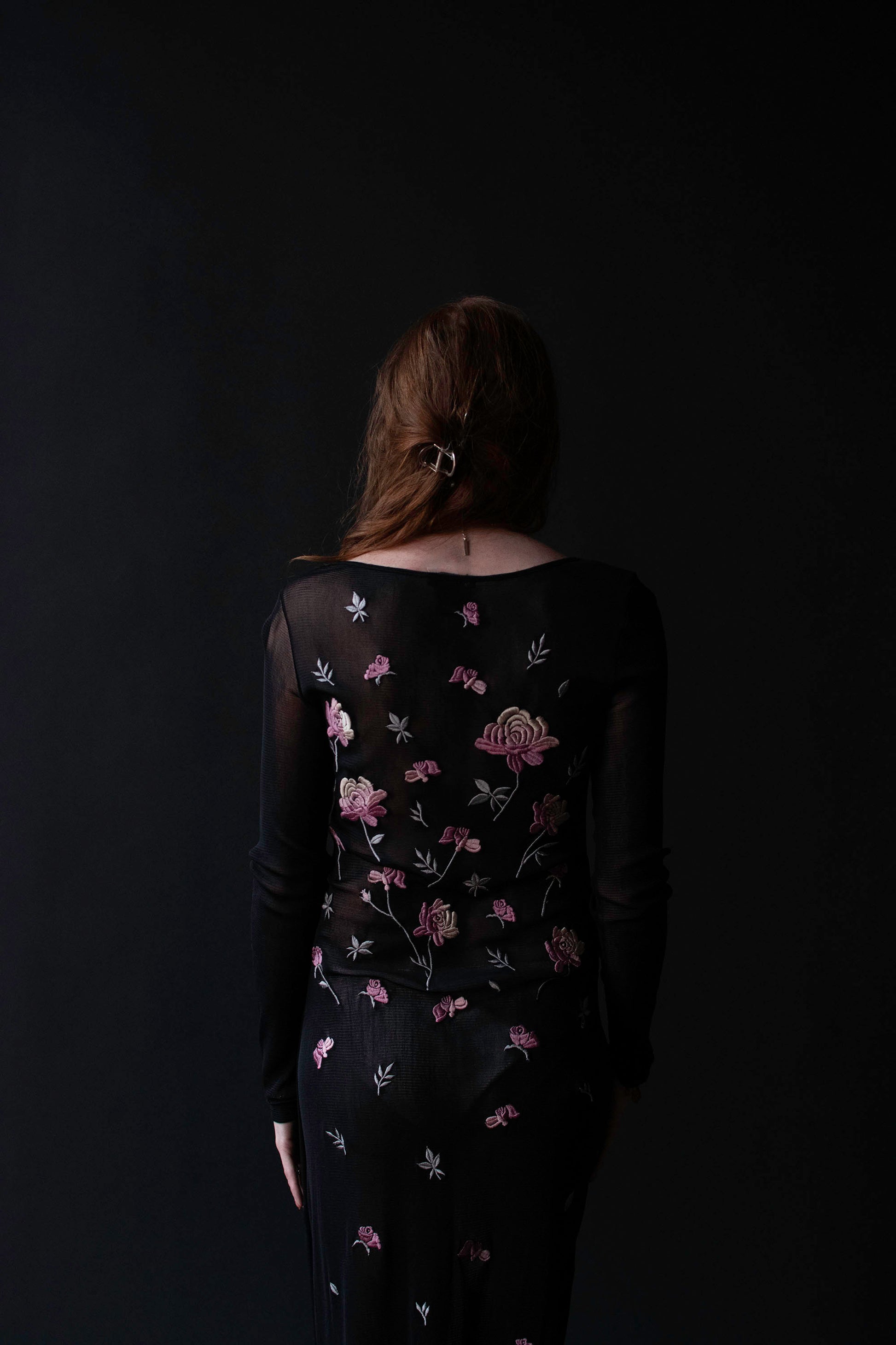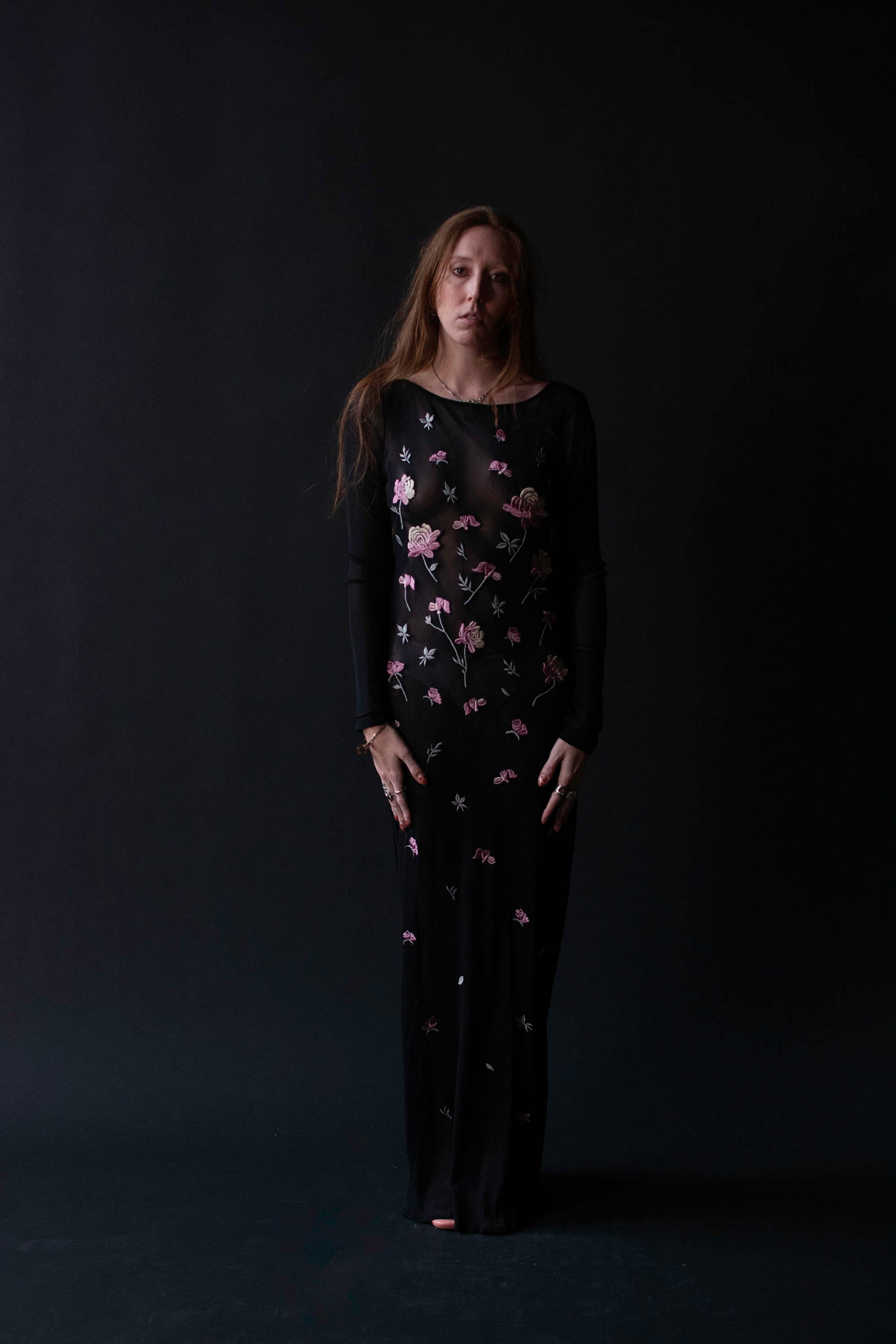 1990s black mesh dress with pink and white floral embroidery by Vivienne Tam from her AW 1997 collection. Round neckline, long sleeves, pullover style. Sheer, will require a slip. Nylon.