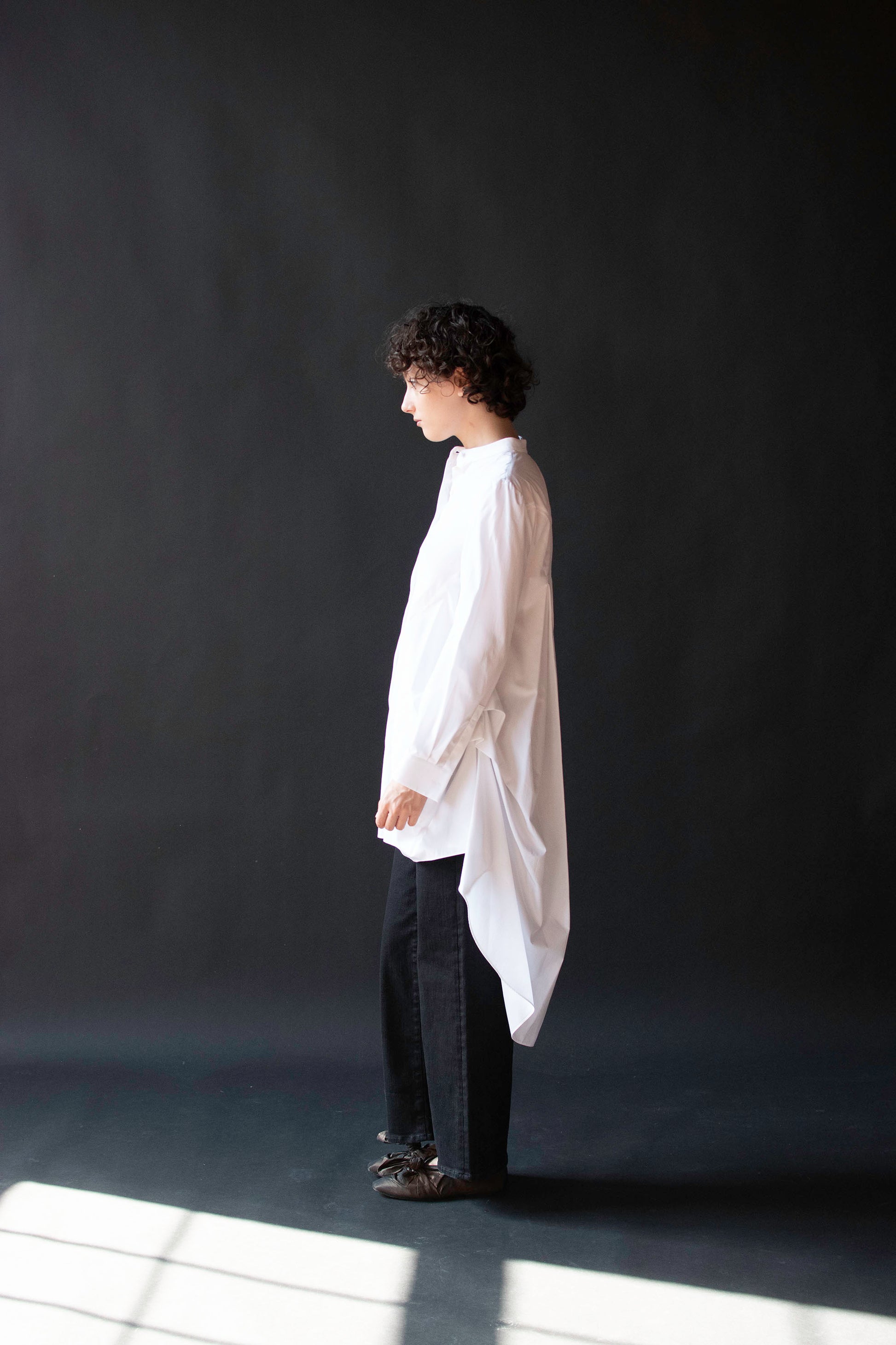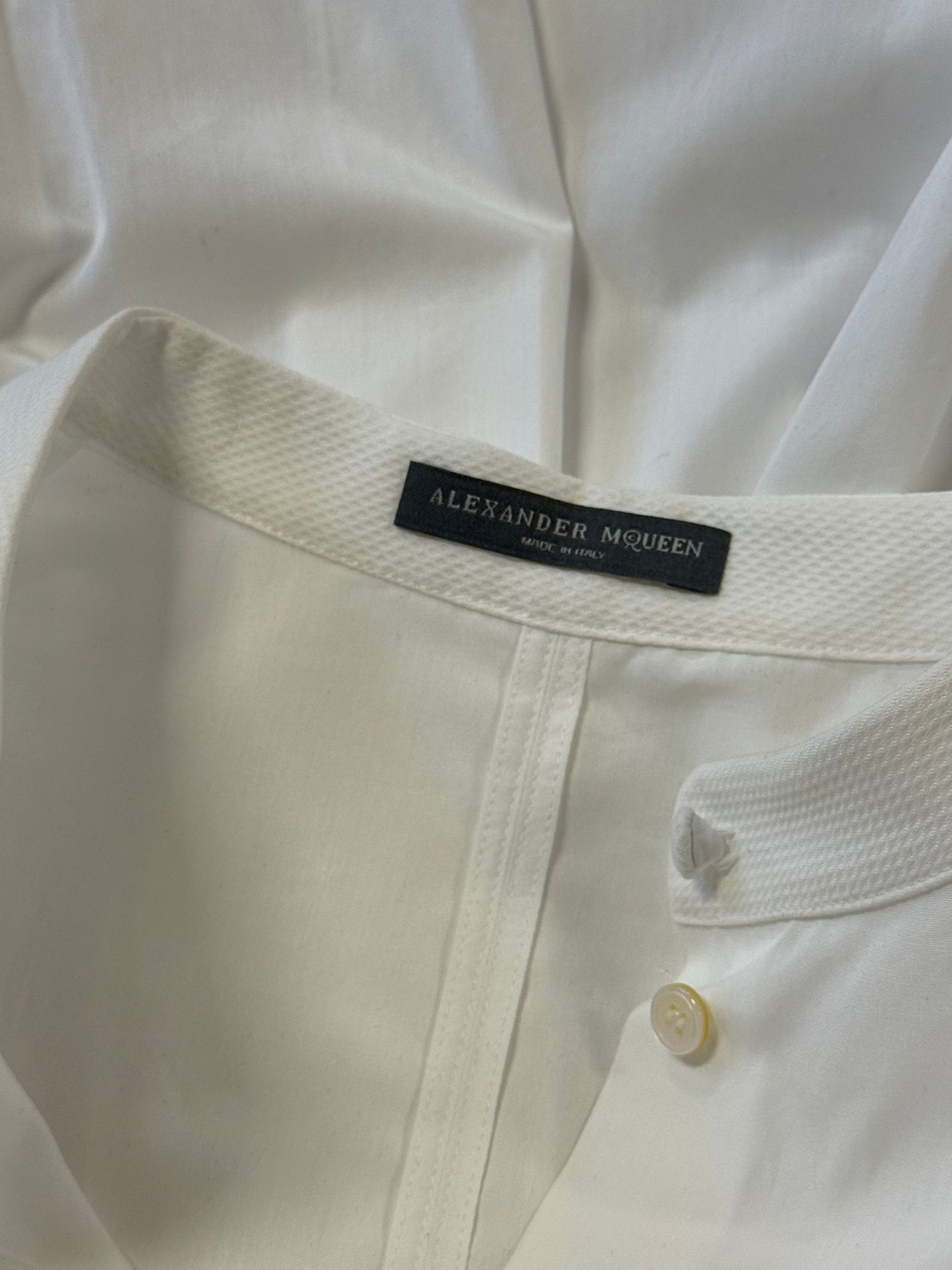 Crisp white poplin shirt with a high low bustle hem by Alexander McQueen. Contrasting pique collar and cuffs with self fabric buttons. Concealed plastic buttons up front. feels like cotton, size and content label missing.