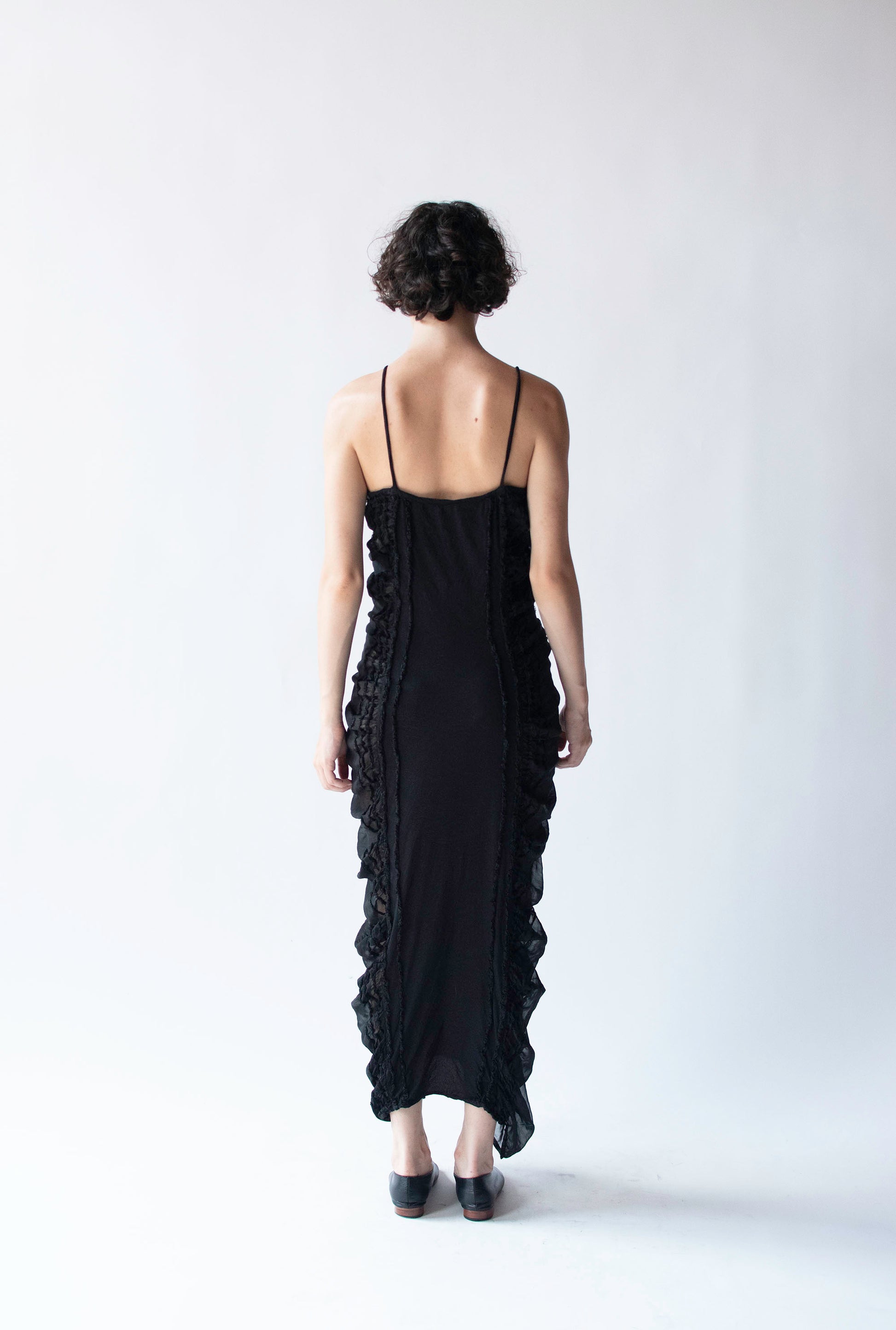 1990s Semi sheer black jersey dress with sheer ruched side panels and crochet trim by Yoshiki Hishinuma. Pullover style. Stretchy synthetic blend.