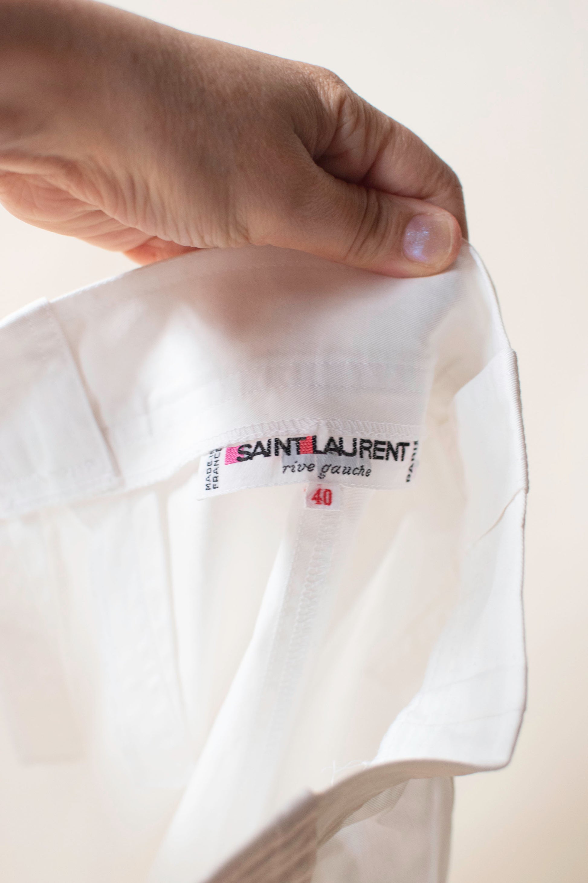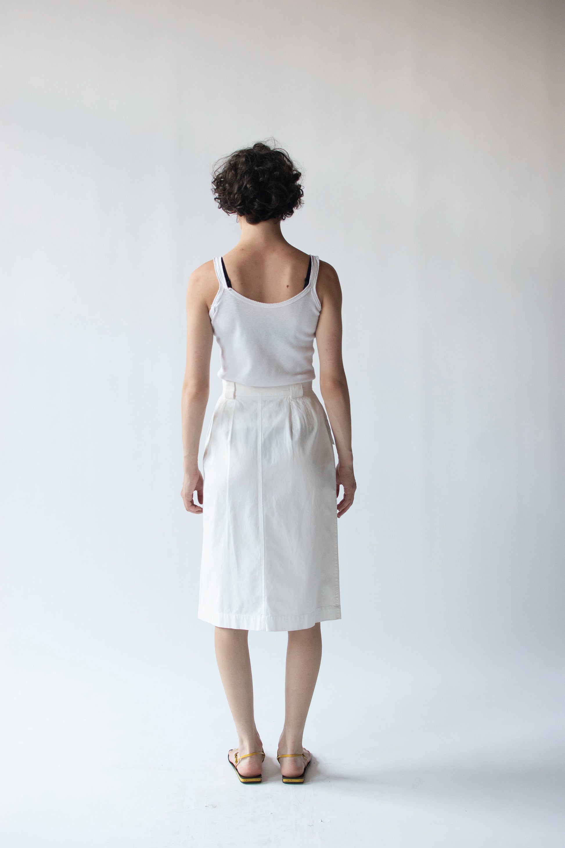 1980s white safari skirt by Yves Saint Laurent. Buttons down front and at patch pockets. Cotton.